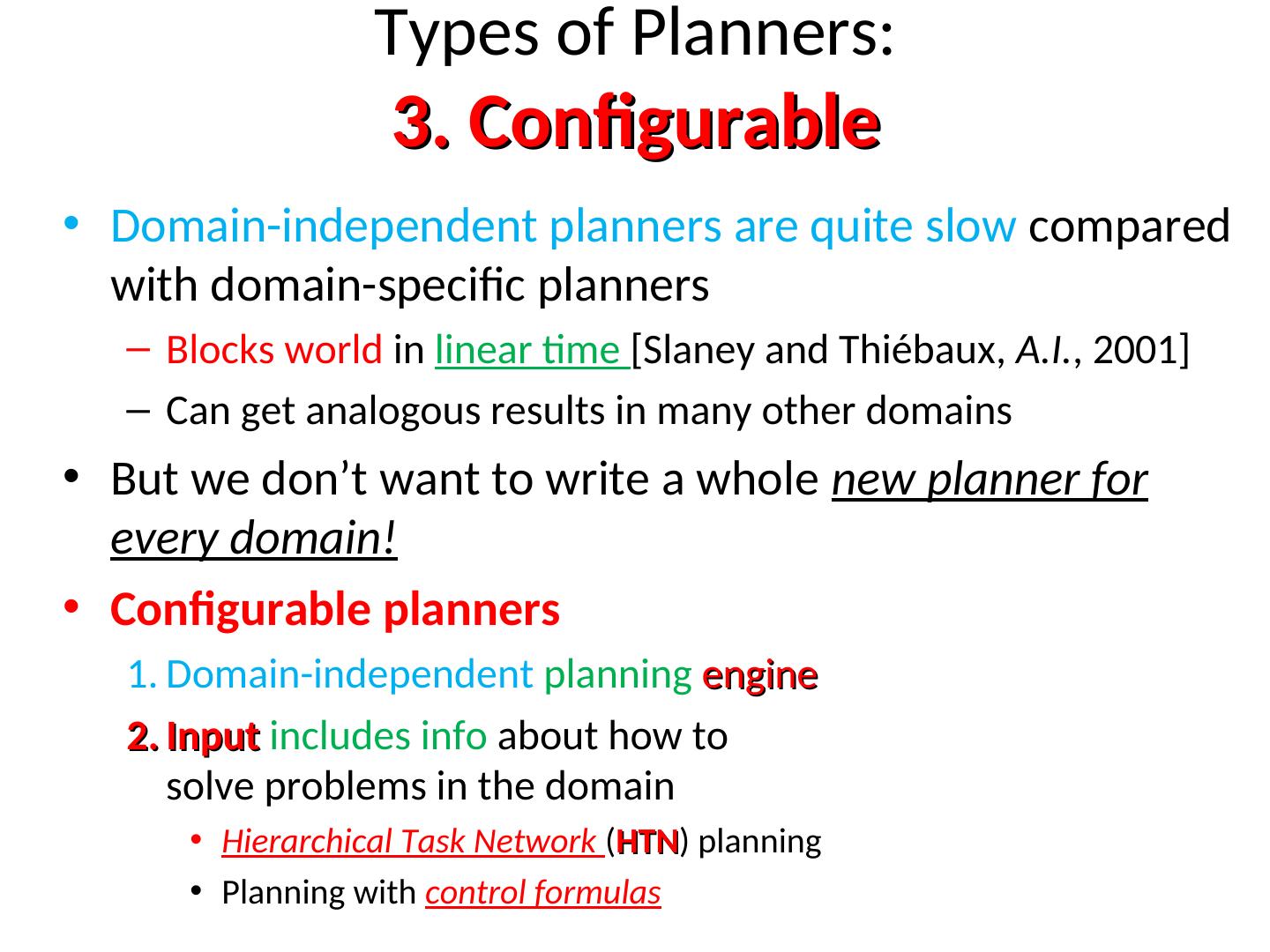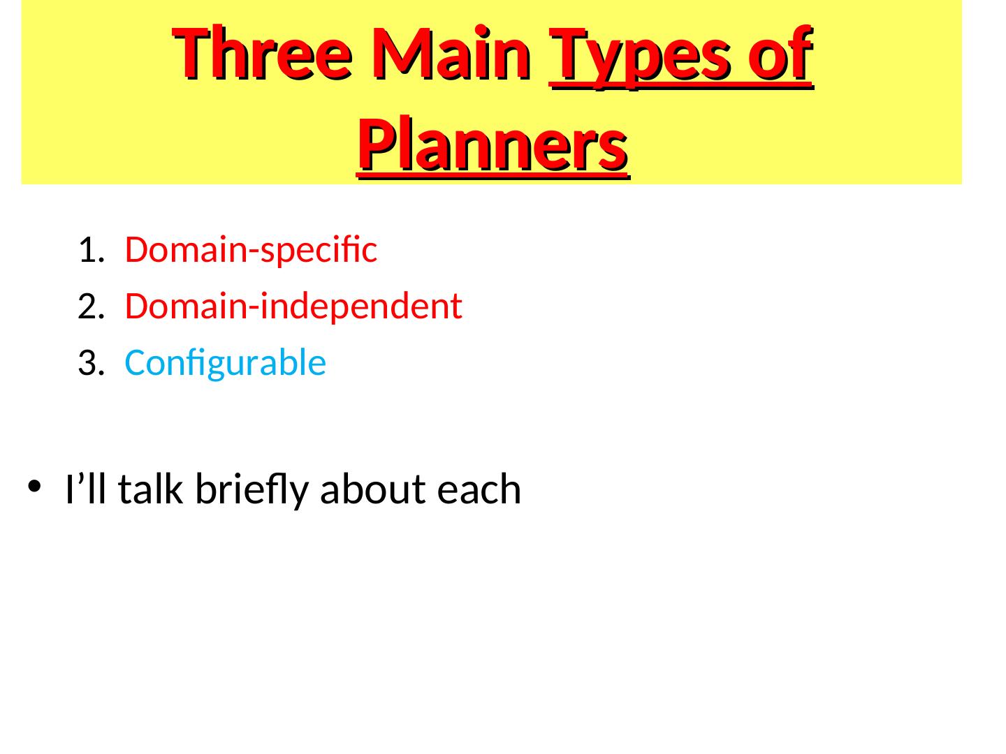 24 . Three Main Types of Planners 1. Domain-specific 2. Domain-independent 3. Configurable • I’ll talk briefly about each