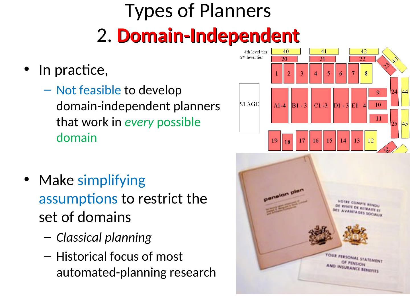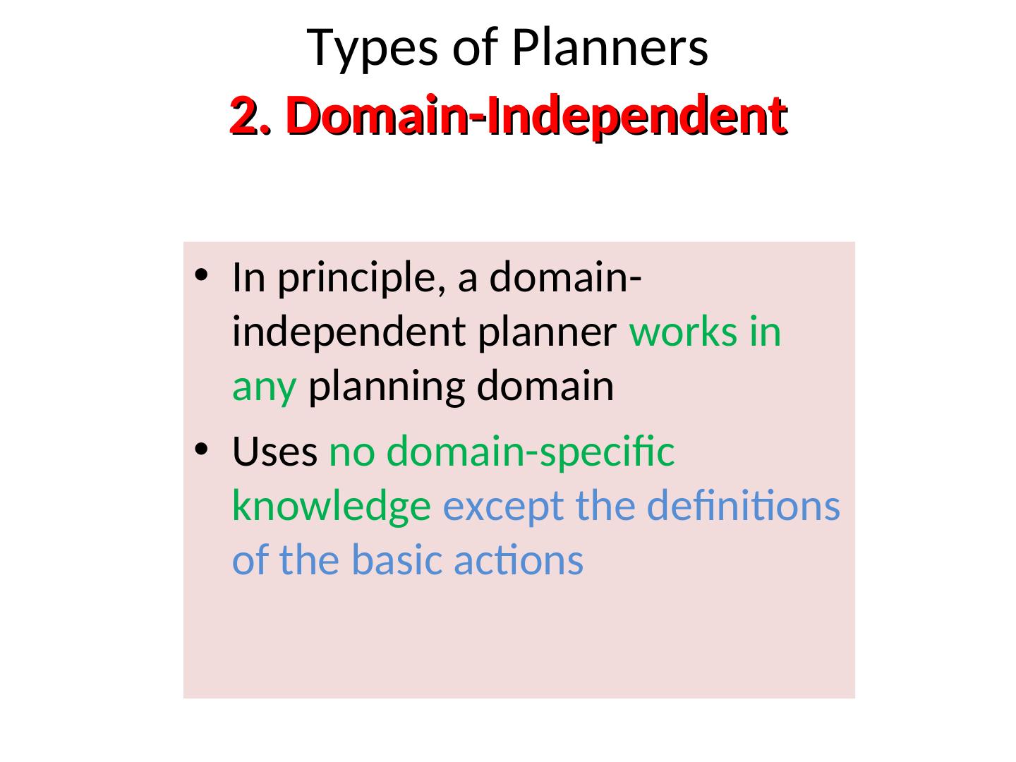 28 . Types of Planners 2. Domain-Independent • In principle, a domain- independent planner works in any planning domain • Uses no domain-specific knowledge except the definitions of the basic actions