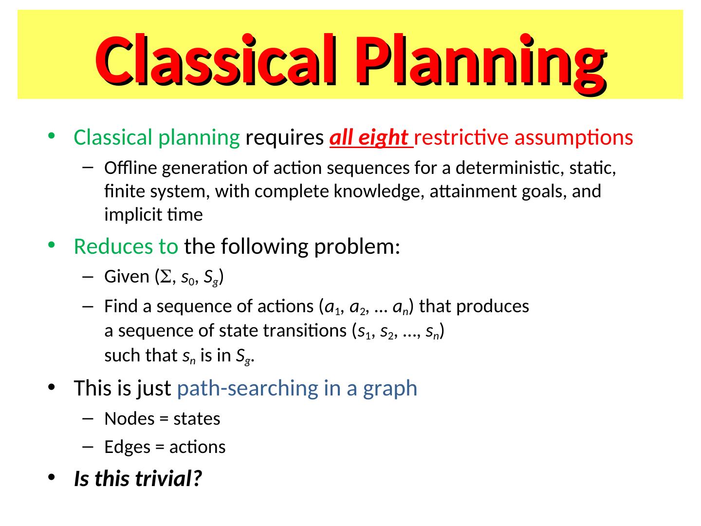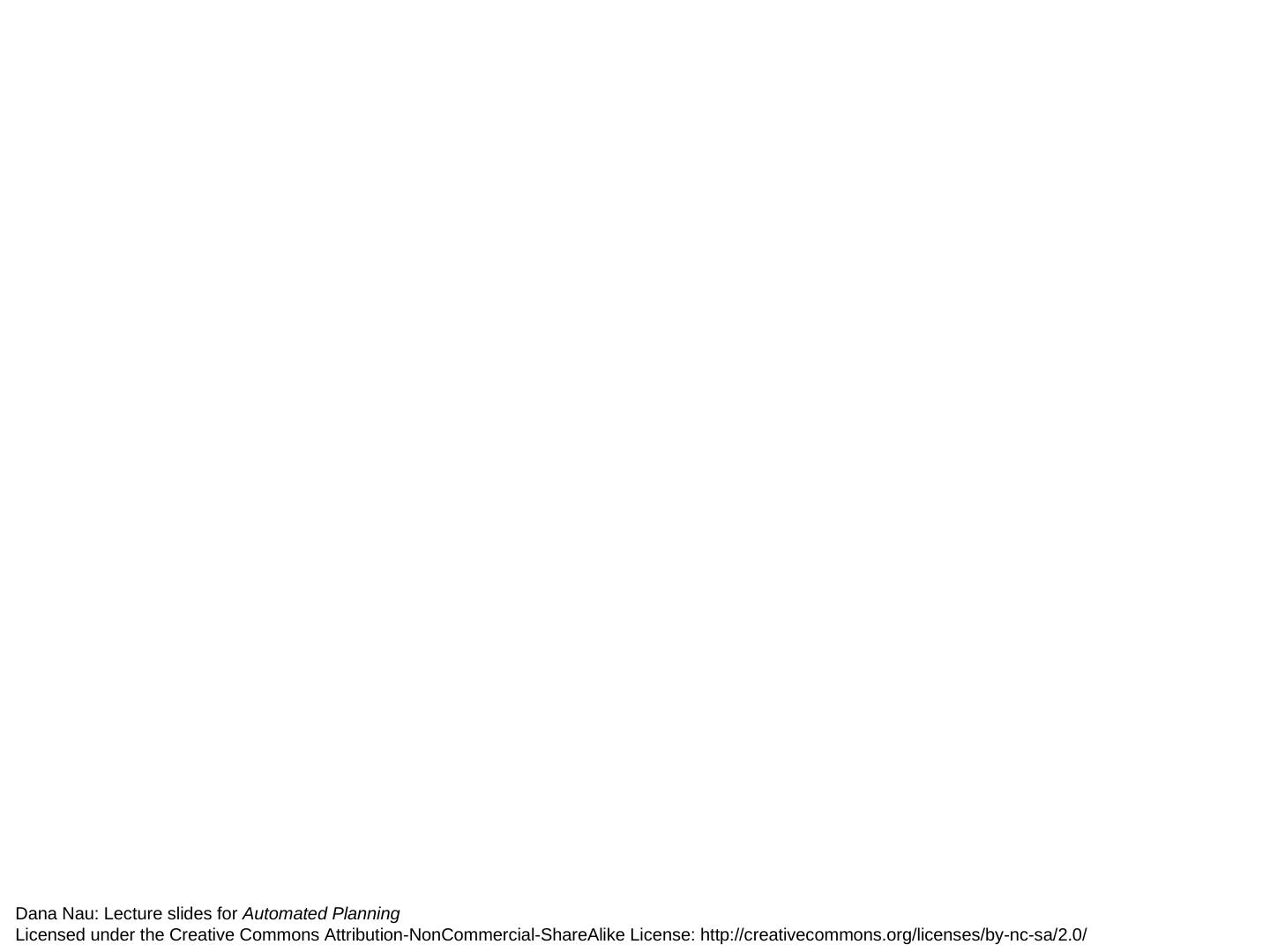 29 . Types of Planners 2. Domain-Independent • In practice, – Not feasible to develop domain-independent planners that work in every possible domain • Make simplifying assumptions to restrict the set of domains – Classical planning – Historical focus of most automated-planning research Dana Nau: Lecture slides for Automated Planning Licensed under the Creative Commons Attribution-NonCommercial-ShareAlike License: http://creativecommons.org/licenses/by-nc-sa/2.0/