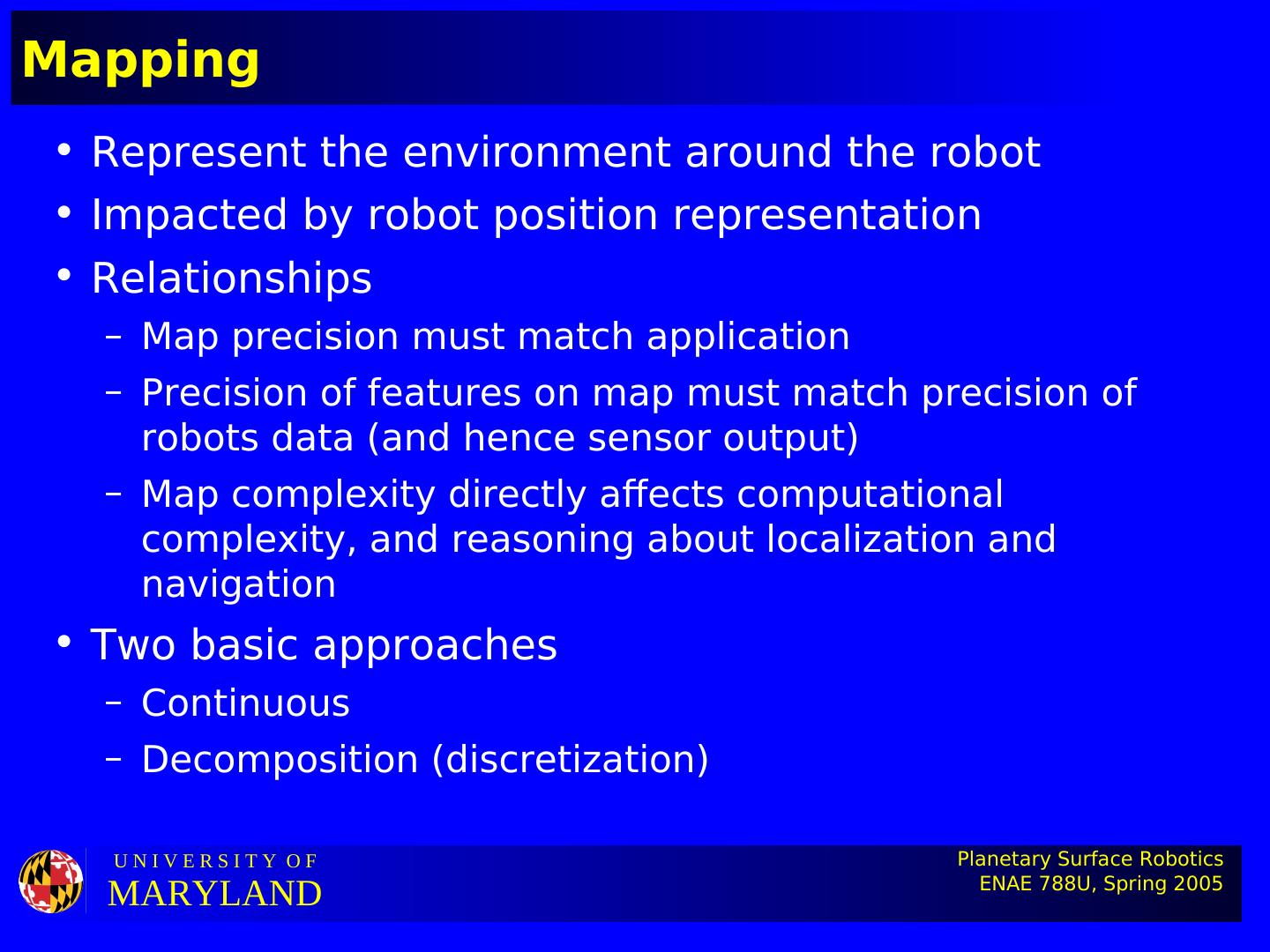 1 .Lecture 8 Mapping 5 April, 2005 UNIVERSITY OF Planetary Surface Robotics ENAE 788U, Spring 2005 MARYLAND