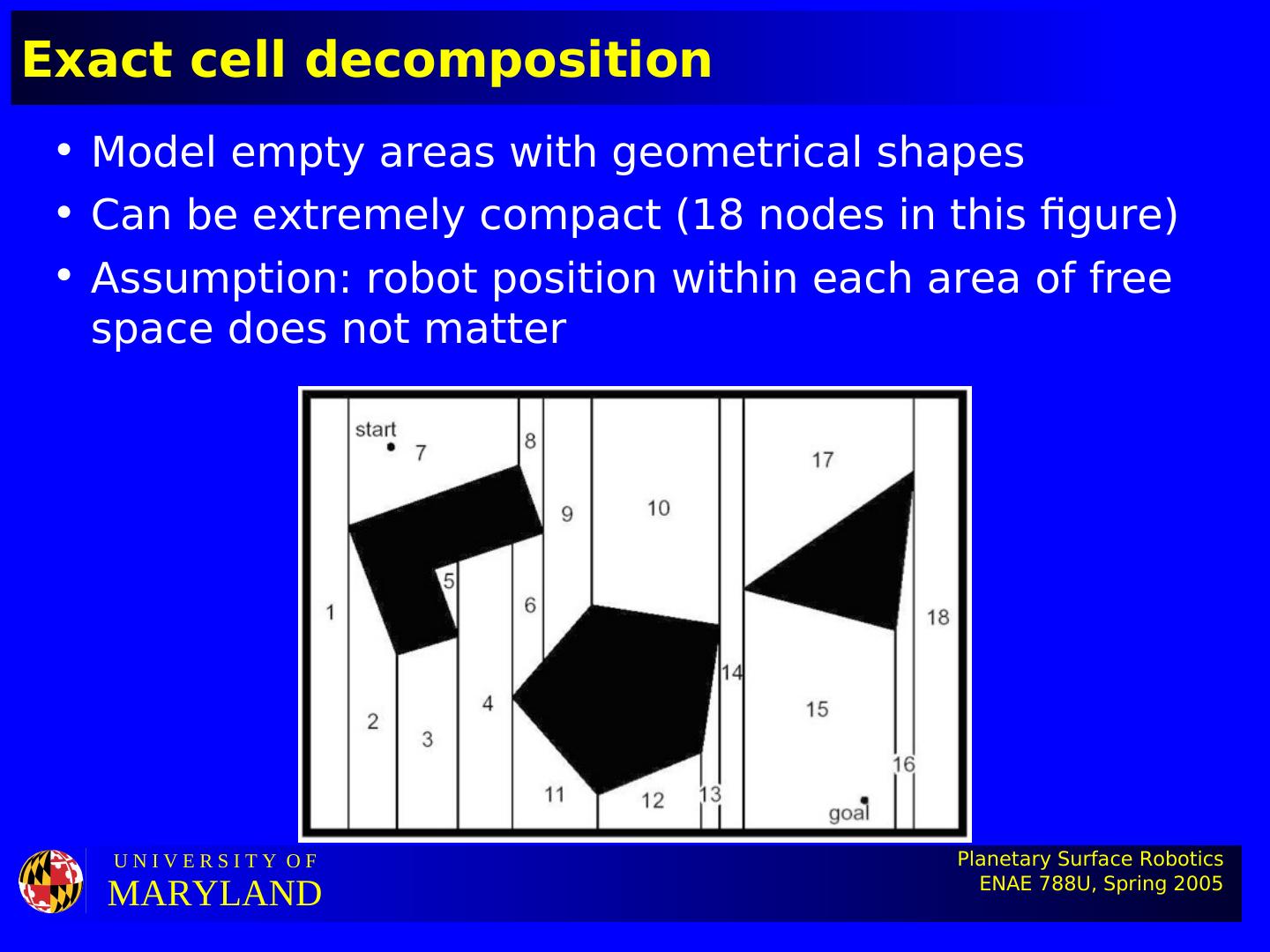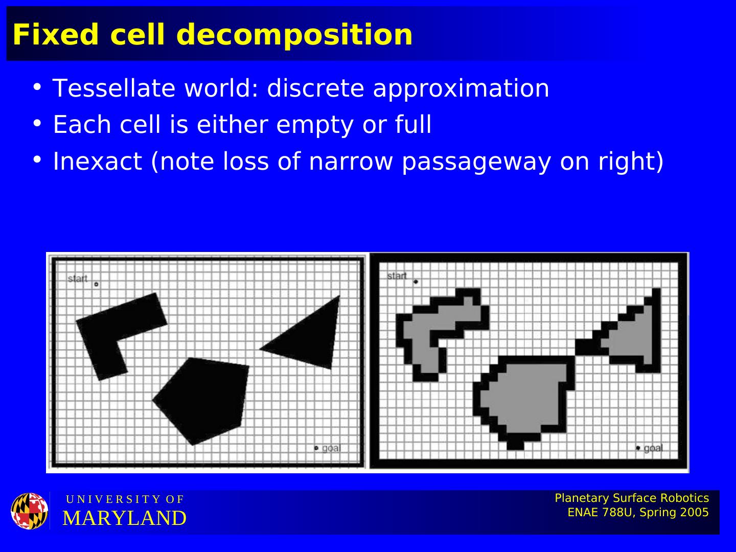 11 .Fixed cell decomposition • Tessellate world: discrete approximation • Each cell is either empty or full • Inexact (note loss of narrow passageway on right) UNIVERSITY OF Planetary Surface Robotics ENAE 788U, Spring 2005 MARYLAND