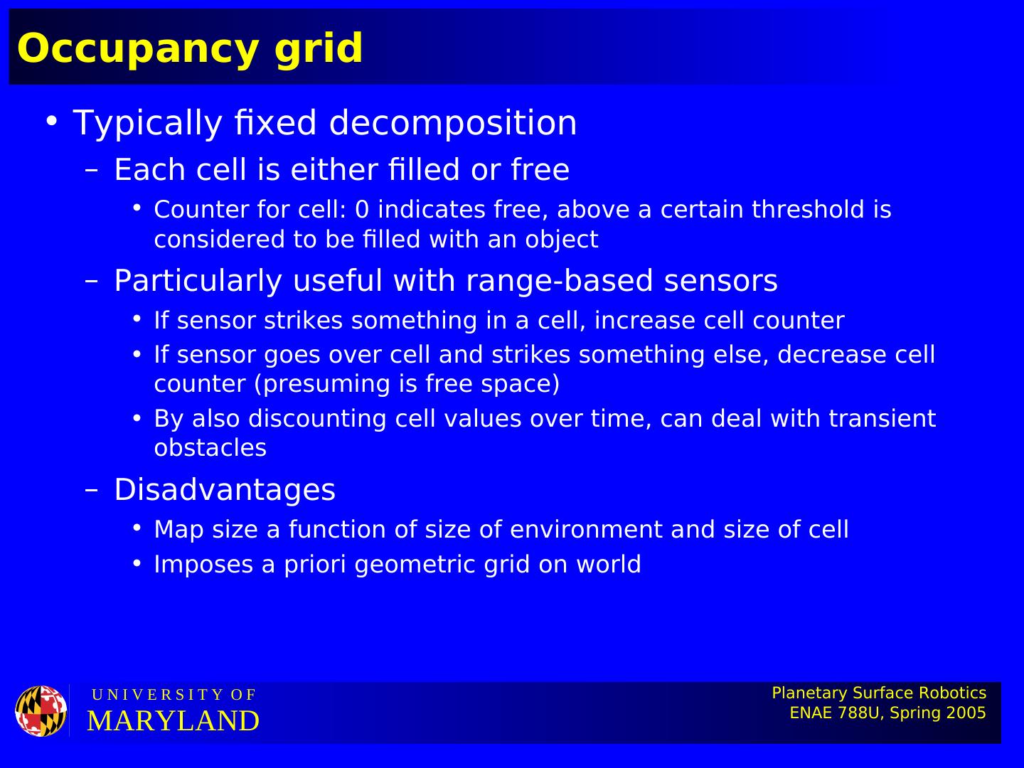 13 .Occupancy grid • Typically fixed decomposition – Each cell is either filled or free • Counter for cell: 0 indicates free, above a certain threshold is considered to be filled with an object – Particularly useful with range-based sensors • If sensor strikes something in a cell, increase cell counter • If sensor goes over cell and strikes something else, decrease cell counter (presuming is free space) • By also discounting cell values over time, can deal with transient obstacles – Disadvantages • Map size a function of size of environment and size of cell • Imposes a priori geometric grid on world UNIVERSITY OF Planetary Surface Robotics ENAE 788U, Spring 2005 MARYLAND