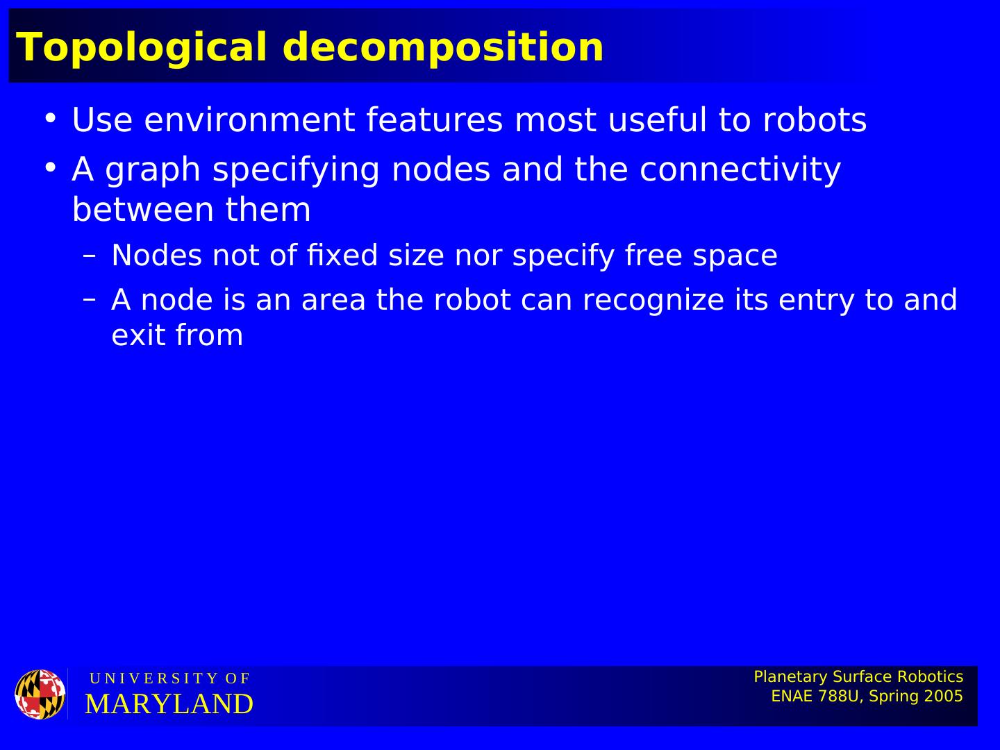 15 .Topological decomposition • Use environment features most useful to robots • A graph specifying nodes and the connectivity between them – Nodes not of fixed size nor specify free space – A node is an area the robot can recognize its entry to and exit from UNIVERSITY OF Planetary Surface Robotics ENAE 788U, Spring 2005 MARYLAND