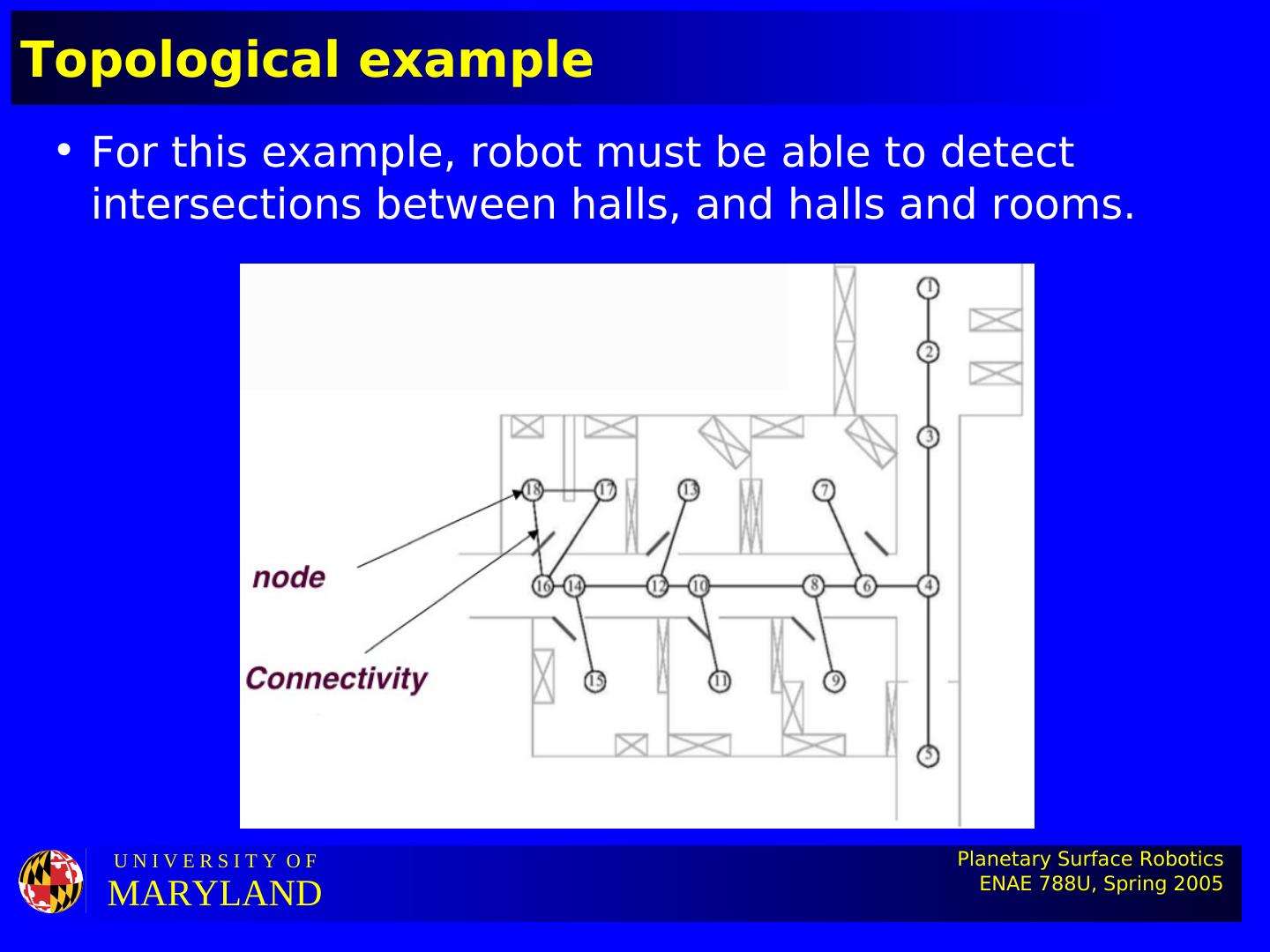 16 .Topological example • For this example, robot must be able to detect intersections between halls, and halls and rooms. UNIVERSITY OF Planetary Surface Robotics ENAE 788U, Spring 2005 MARYLAND