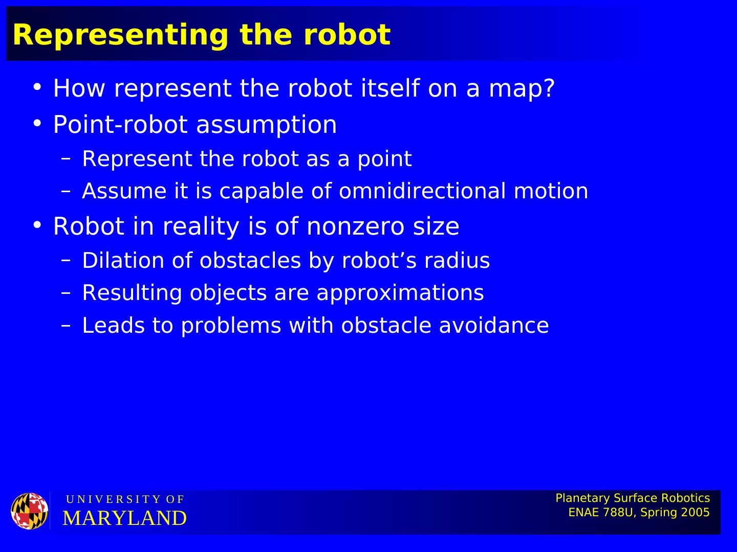 19 .Representing the robot • How represent the robot itself on a map? • Point-robot assumption – Represent the robot as a point – Assume it is capable of omnidirectional motion • Robot in reality is of nonzero size – Dilation of obstacles by robot’s radius – Resulting objects are approximations – Leads to problems with obstacle avoidance UNIVERSITY OF Planetary Surface Robotics ENAE 788U, Spring 2005 MARYLAND