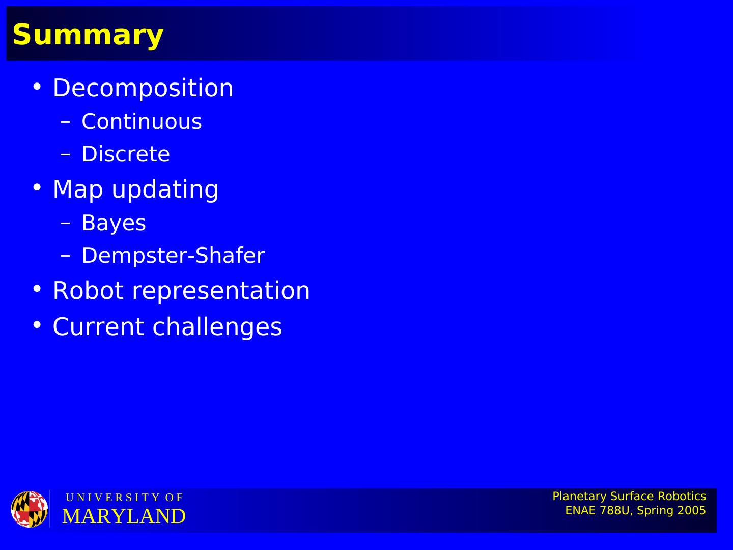 21 .Summary • Decomposition – Continuous – Discrete • Map updating – Bayes – Dempster-Shafer • Robot representation • Current challenges UNIVERSITY OF Planetary Surface Robotics ENAE 788U, Spring 2005 MARYLAND