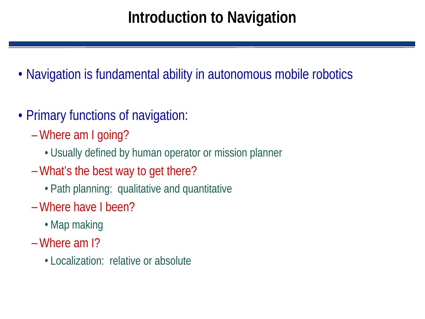 3 . Introduction to Navigation • Navigation is fundamental ability in autonomous mobile robotics • Primary functions of navigation: – Where am I going? • Usually defined by human operator or mission planner – What’s the best way to get there? • Path planning: qualitative and quantitative – Where have I been? • Map making – Where am I? • Localization: relative or absolute