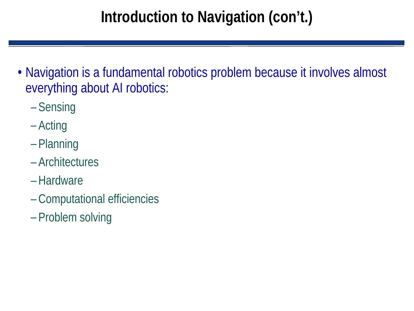 4 . Introduction to Navigation (con’t.) • Navigation is a fundamental robotics problem because it involves almost everything about AI robotics: – Sensing – Acting – Planning – Architectures – Hardware – Computational efficiencies – Problem solving