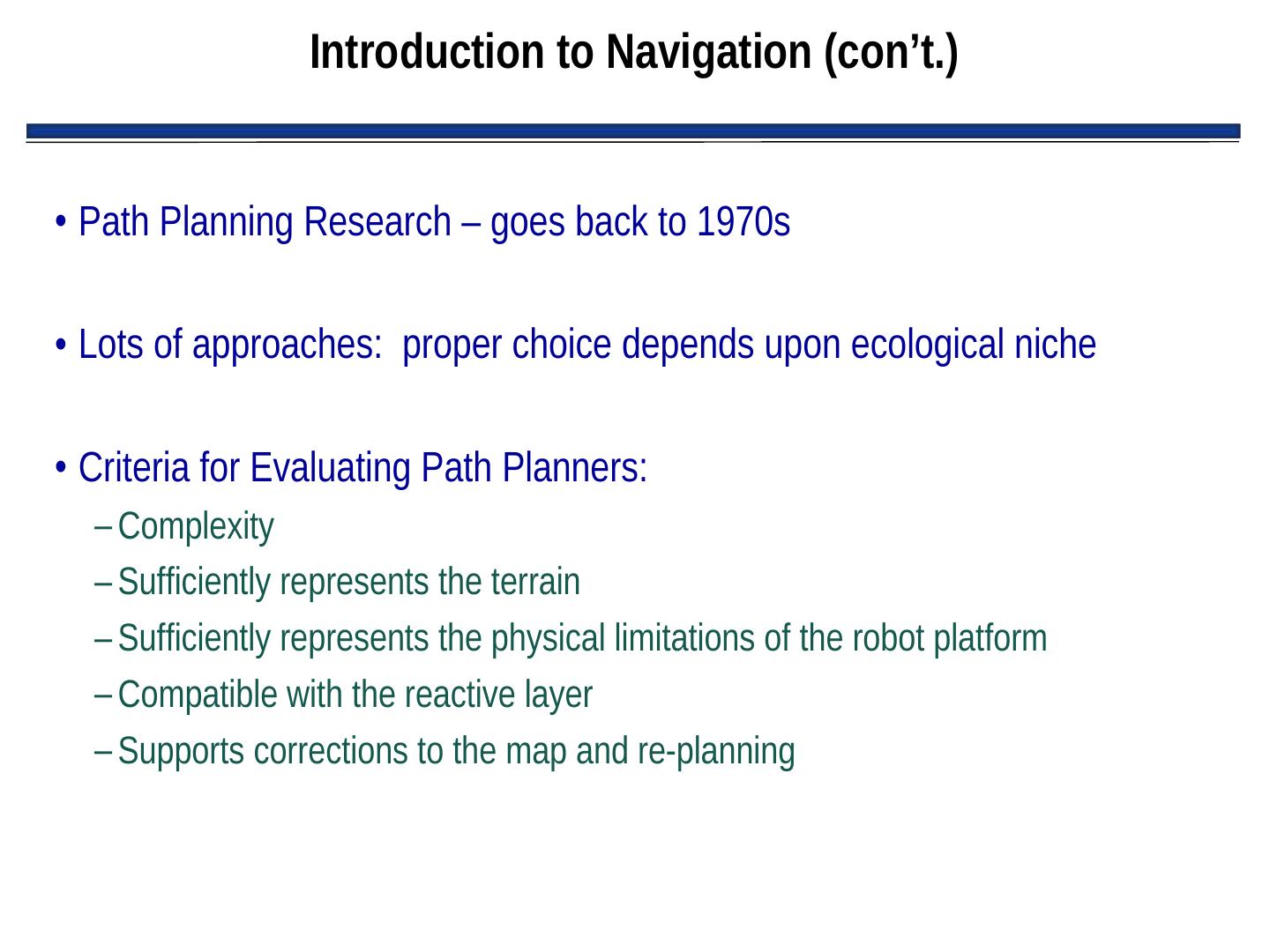 5 . Introduction to Navigation (con’t.) • Path Planning Research – goes back to 1970s • Lots of approaches: proper choice depends upon ecological niche • Criteria for Evaluating Path Planners: – Complexity – Sufficiently represents the terrain – Sufficiently represents the physical limitations of the robot platform – Compatible with the reactive layer – Supports corrections to the map and re-planning