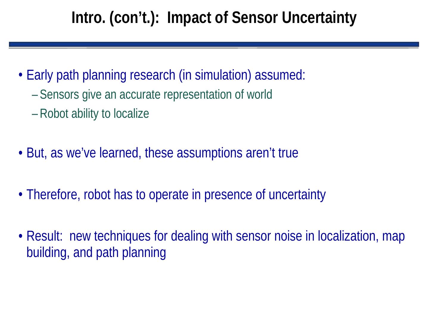 6 . Intro. (con’t.): Impact of Sensor Uncertainty • Early path planning research (in simulation) assumed: – Sensors give an accurate representation of world – Robot ability to localize • But, as we’ve learned, these assumptions aren’t true • Therefore, robot has to operate in presence of uncertainty • Result: new techniques for dealing with sensor noise in localization, map building, and path planning