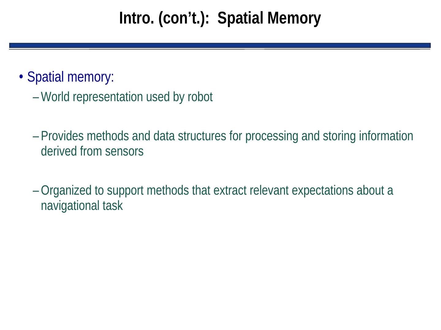 7 . Intro. (con’t.): Spatial Memory • Spatial memory: – World representation used by robot – Provides methods and data structures for processing and storing information derived from sensors – Organized to support methods that extract relevant expectations about a navigational task