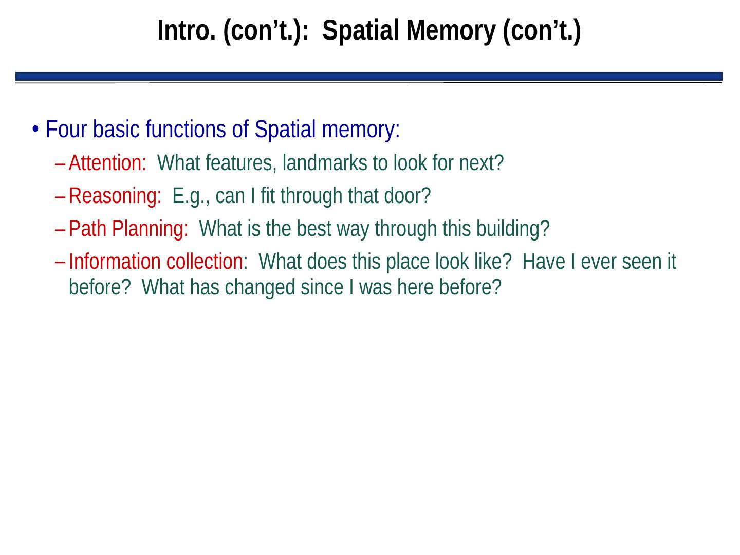 8 . Intro. (con’t.): Spatial Memory (con’t.) • Four basic functions of Spatial memory: – Attention: What features, landmarks to look for next? – Reasoning: E.g., can I fit through that door? – Path Planning: What is the best way through this building? – Information collection: What does this place look like? Have I ever seen it before? What has changed since I was here before?
