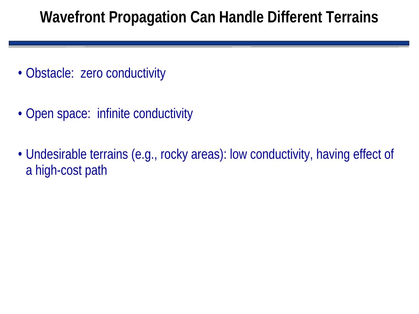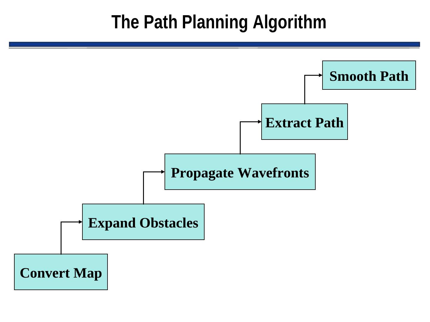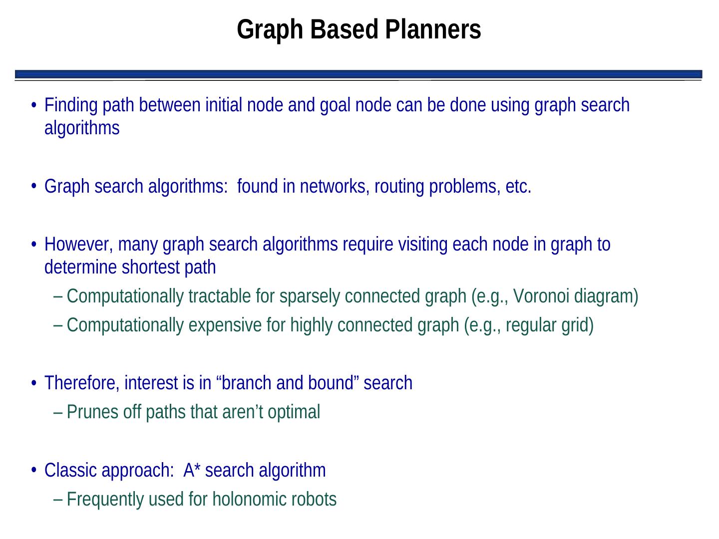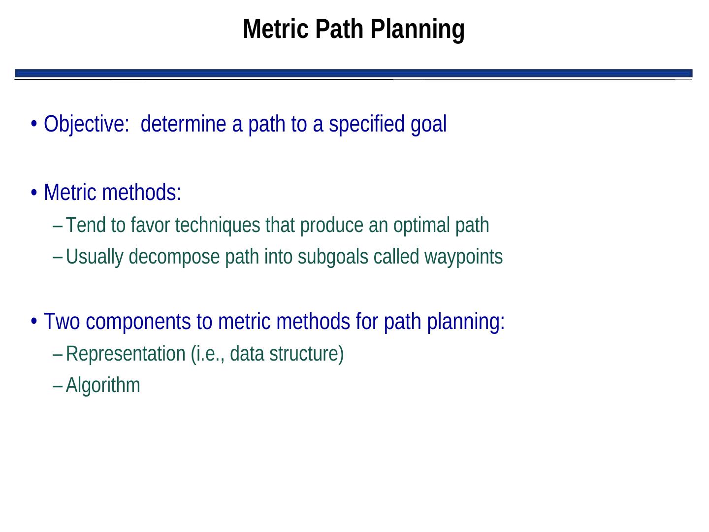 12 . Metric Path Planning • Objective: determine a path to a specified goal • Metric methods: – Tend to favor techniques that produce an optimal path – Usually decompose path into subgoals called waypoints • Two components to metric methods for path planning: – Representation (i.e., data structure) – Algorithm