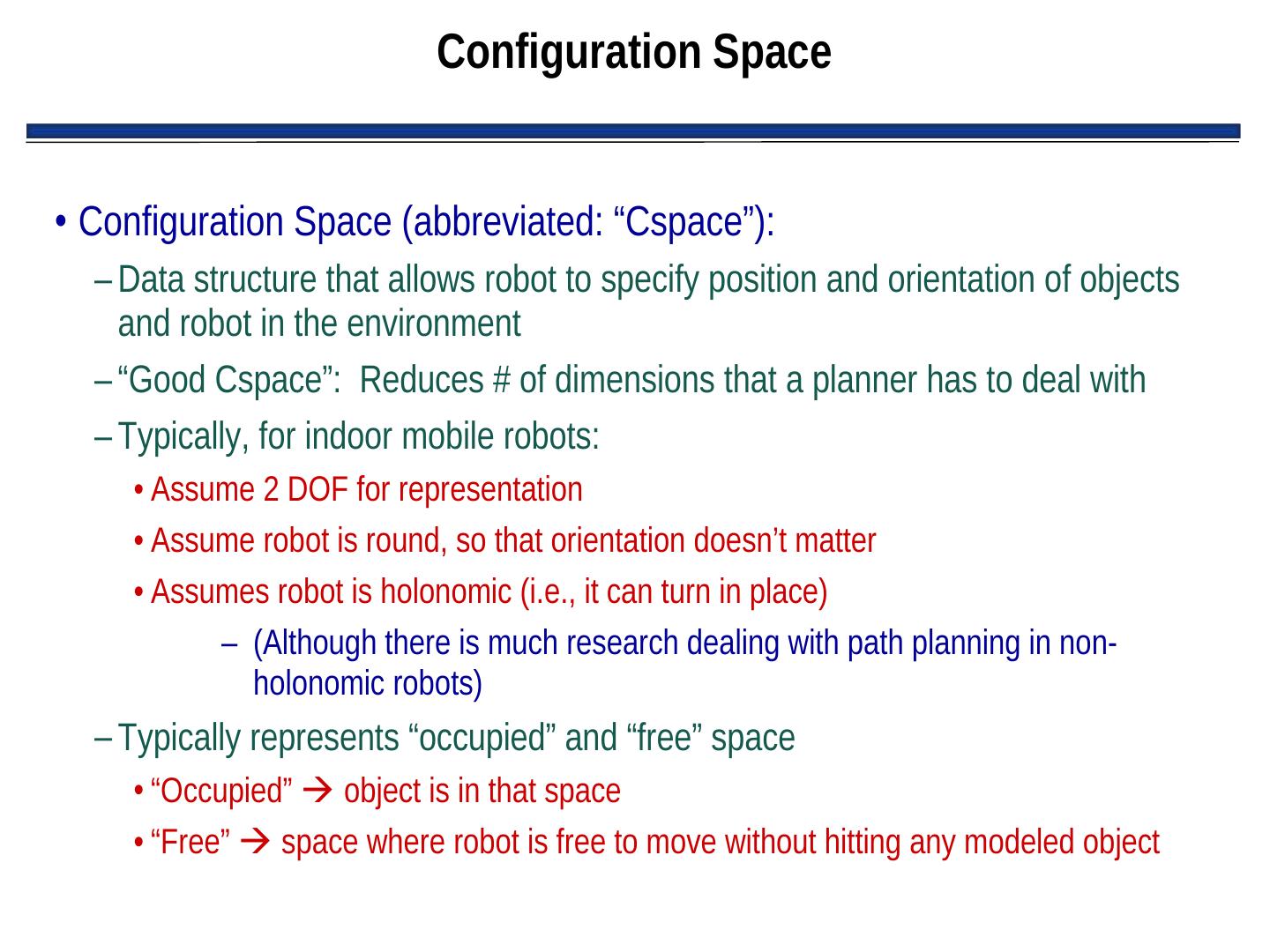 13 . Configuration Space • Configuration Space (abbreviated: “Cspace”): – Data structure that allows robot to specify position and orientation of objects and robot in the environment – “Good Cspace”: Reduces # of dimensions that a planner has to deal with – Typically, for indoor mobile robots: • Assume 2 DOF for representation • Assume robot is round, so that orientation doesn’t matter • Assumes robot is holonomic (i.e., it can turn in place) – (Although there is much research dealing with path planning in non- holonomic robots) – Typically represents “occupied” and “free” space • “Occupied” object is in that space • “Free” space where robot is free to move without hitting any modeled object