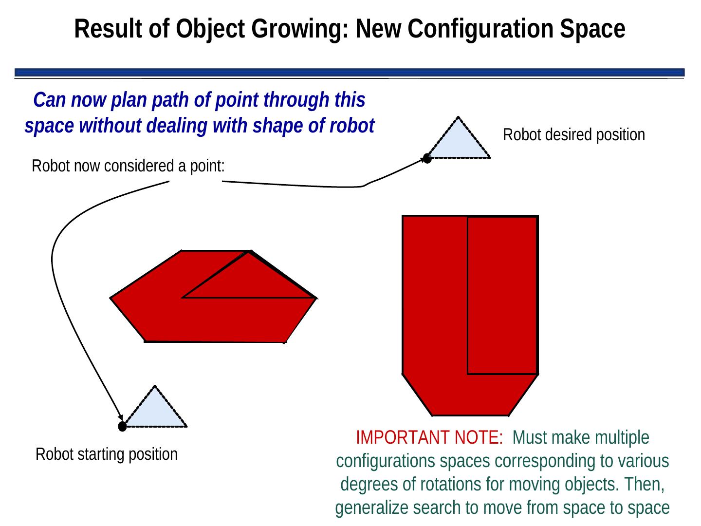 17 . Result of Object Growing: New Configuration Space Can now plan path of point through this space without dealing with shape of robot Robot desired position Robot now considered a point: IMPORTANT NOTE: Must make multiple Robot starting position configurations spaces corresponding to various degrees of rotations for moving objects. Then, generalize search to move from space to space