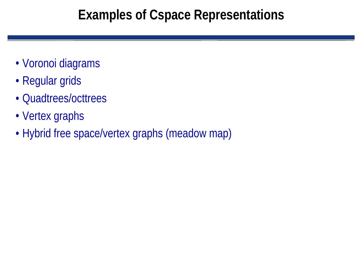 19 . Examples of Cspace Representations • Voronoi diagrams • Regular grids • Quadtrees/octtrees • Vertex graphs • Hybrid free space/vertex graphs (meadow map)
