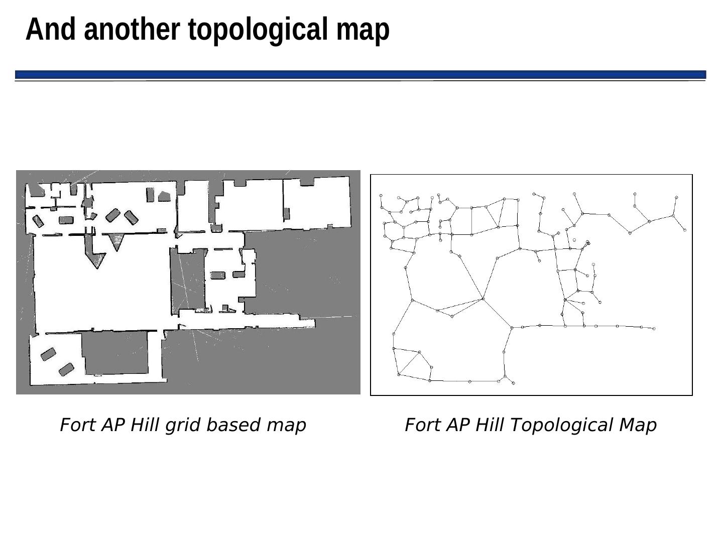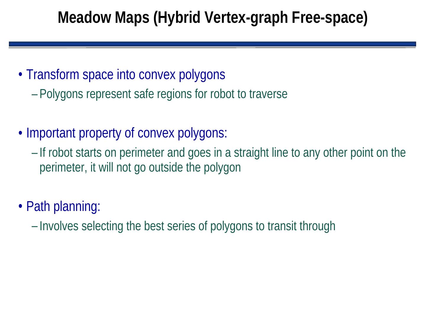 20 . Meadow Maps (Hybrid Vertex-graph Free-space) • Transform space into convex polygons – Polygons represent safe regions for robot to traverse • Important property of convex polygons: – If robot starts on perimeter and goes in a straight line to any other point on the perimeter, it will not go outside the polygon • Path planning: – Involves selecting the best series of polygons to transit through