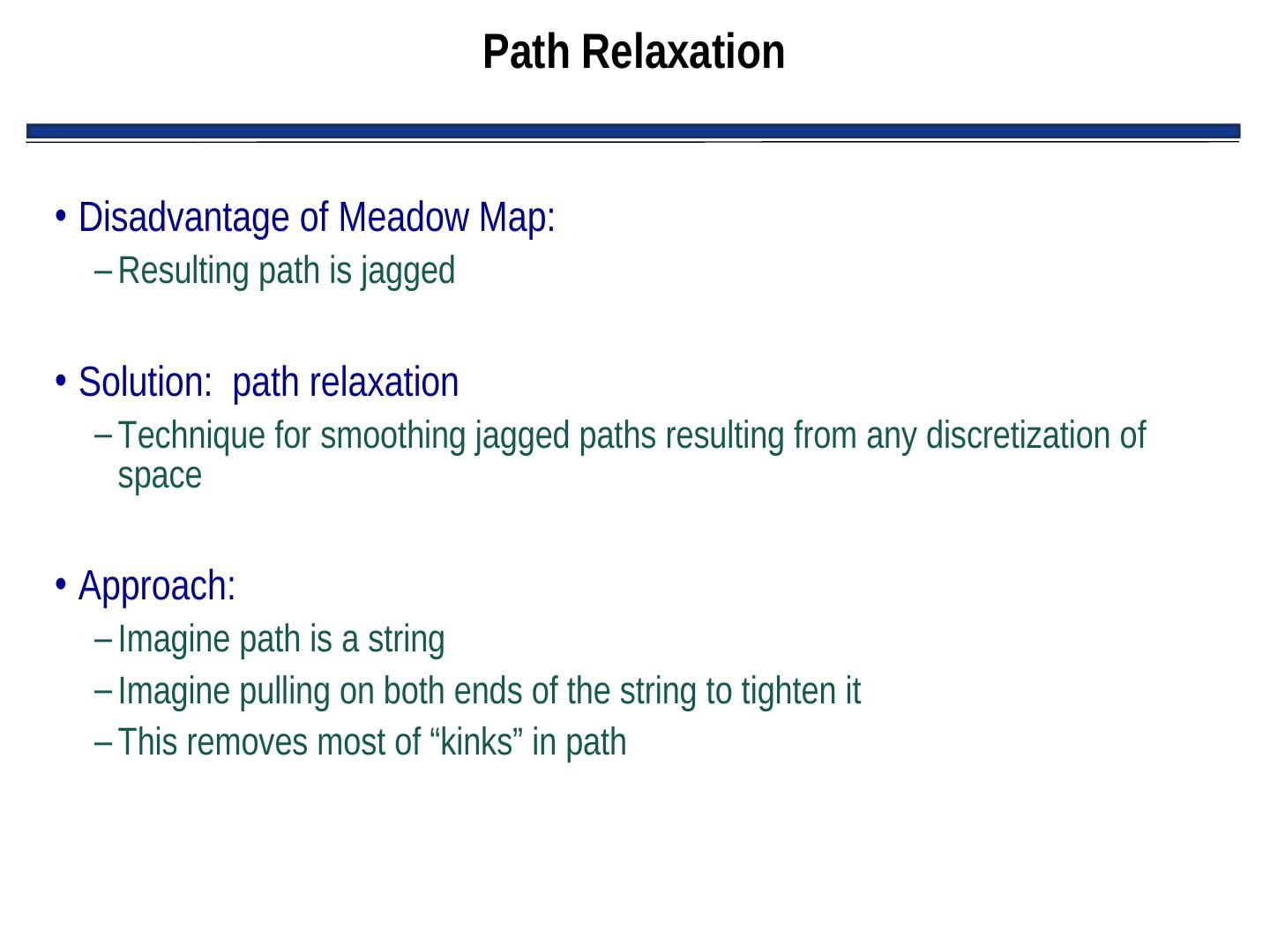 22 . Path Relaxation • Disadvantage of Meadow Map: – Resulting path is jagged • Solution: path relaxation – Technique for smoothing jagged paths resulting from any discretization of space • Approach: – Imagine path is a string – Imagine pulling on both ends of the string to tighten it – This removes most of “kinks” in path