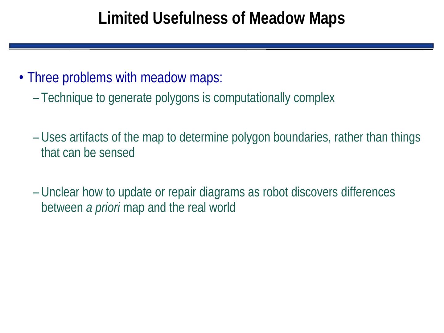 24 . Limited Usefulness of Meadow Maps • Three problems with meadow maps: – Technique to generate polygons is computationally complex – Uses artifacts of the map to determine polygon boundaries, rather than things that can be sensed – Unclear how to update or repair diagrams as robot discovers differences between a priori map and the real world