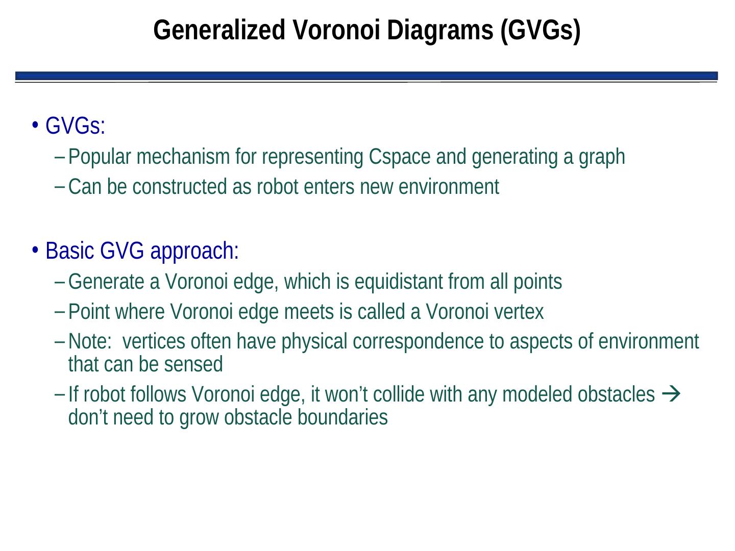 25 . Generalized Voronoi Diagrams (GVGs) • GVGs: – Popular mechanism for representing Cspace and generating a graph – Can be constructed as robot enters new environment • Basic GVG approach: – Generate a Voronoi edge, which is equidistant from all points – Point where Voronoi edge meets is called a Voronoi vertex – Note: vertices often have physical correspondence to aspects of environment that can be sensed – If robot follows Voronoi edge, it won’t collide with any modeled obstacles don’t need to grow obstacle boundaries