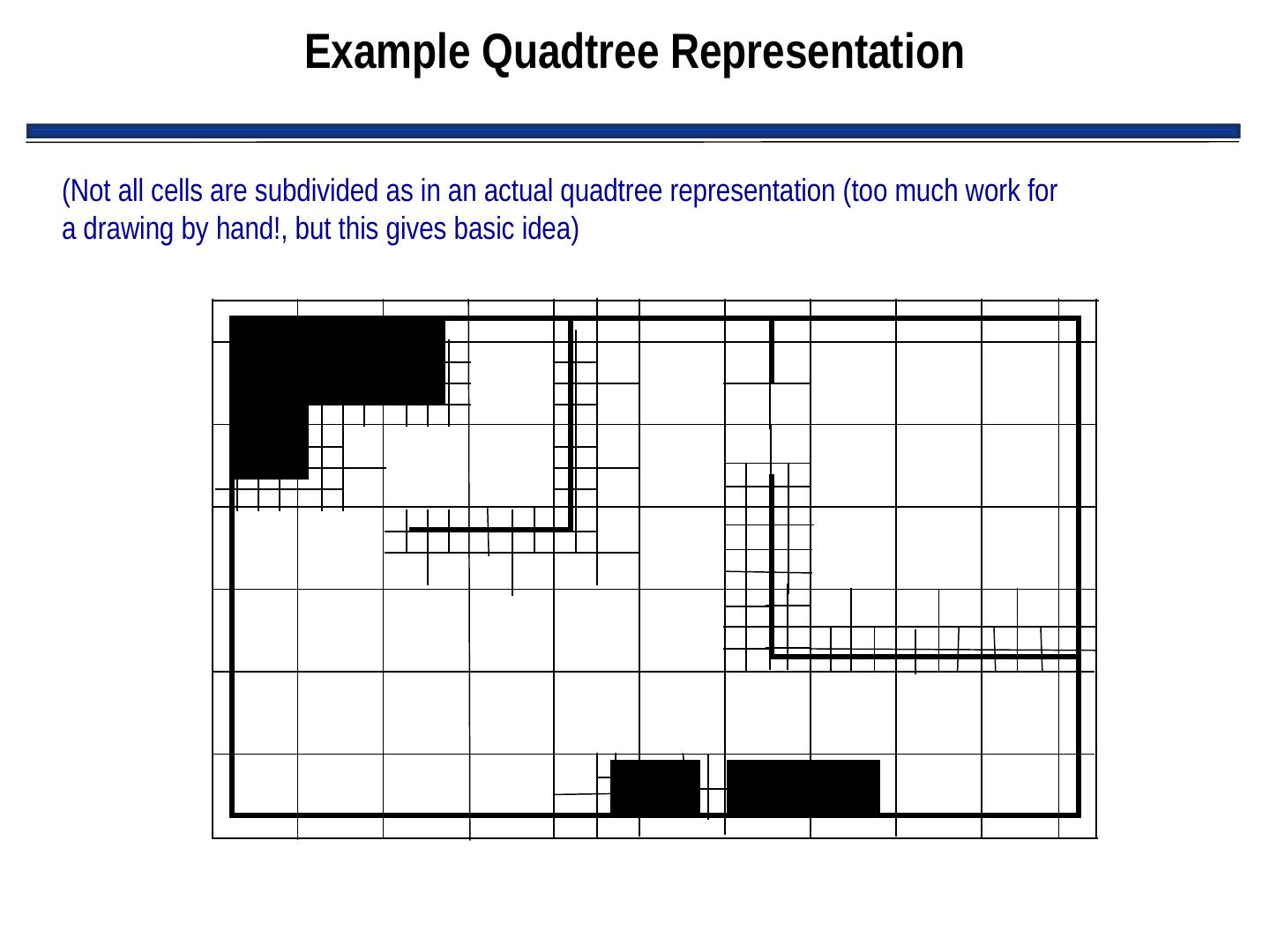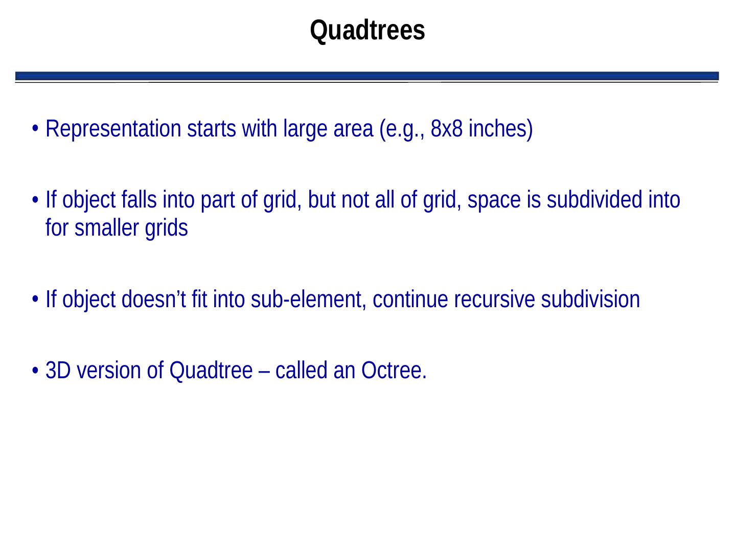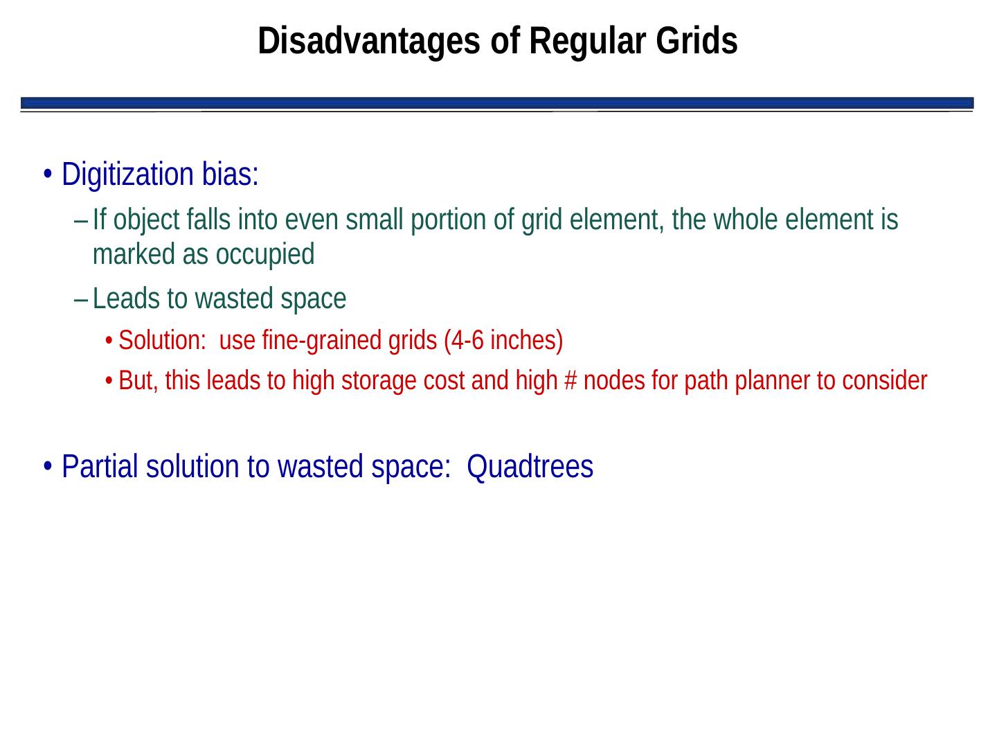 29 . Disadvantages of Regular Grids • Digitization bias: – If object falls into even small portion of grid element, the whole element is marked as occupied – Leads to wasted space • Solution: use fine-grained grids (4-6 inches) • But, this leads to high storage cost and high # nodes for path planner to consider • Partial solution to wasted space: Quadtrees
