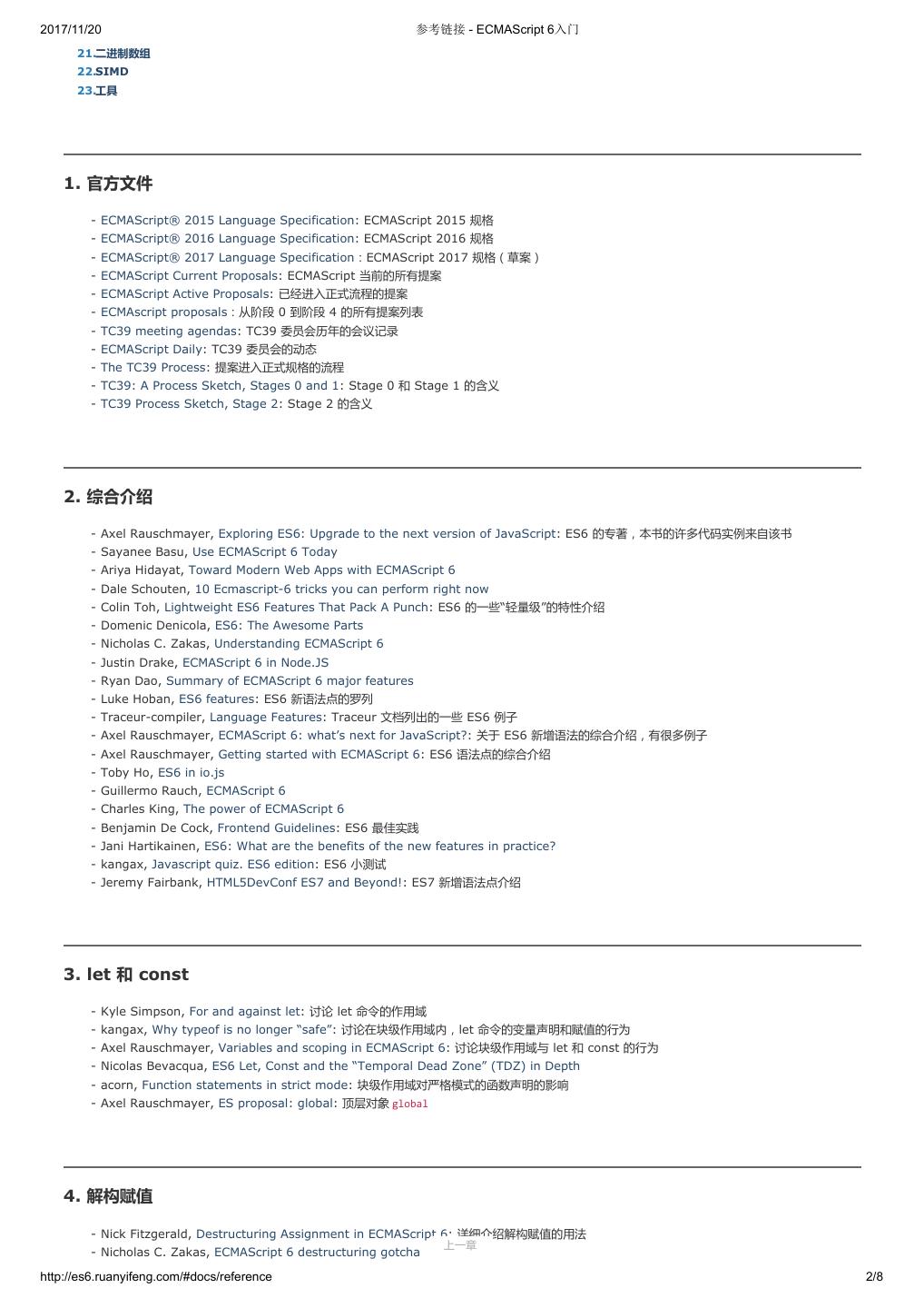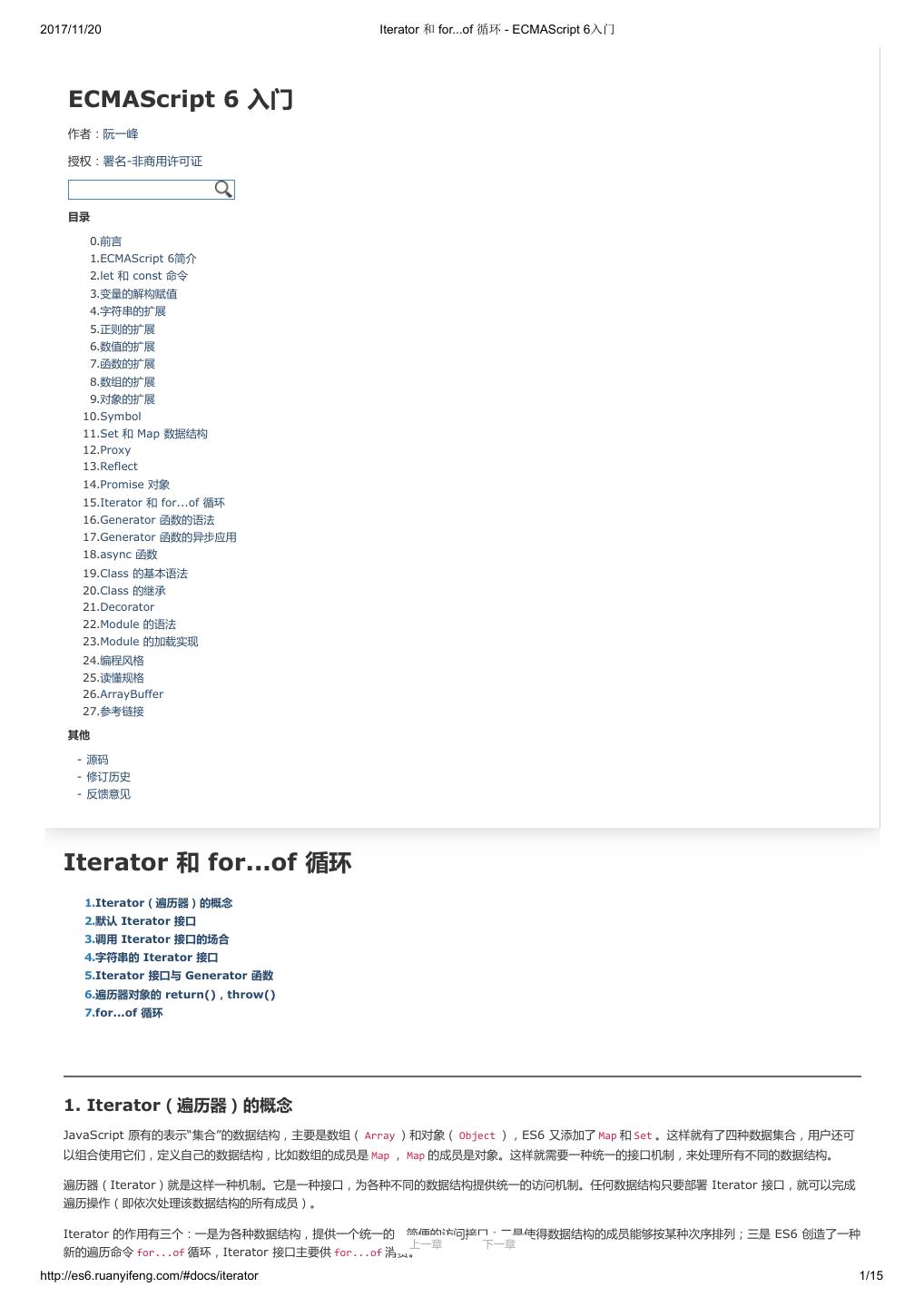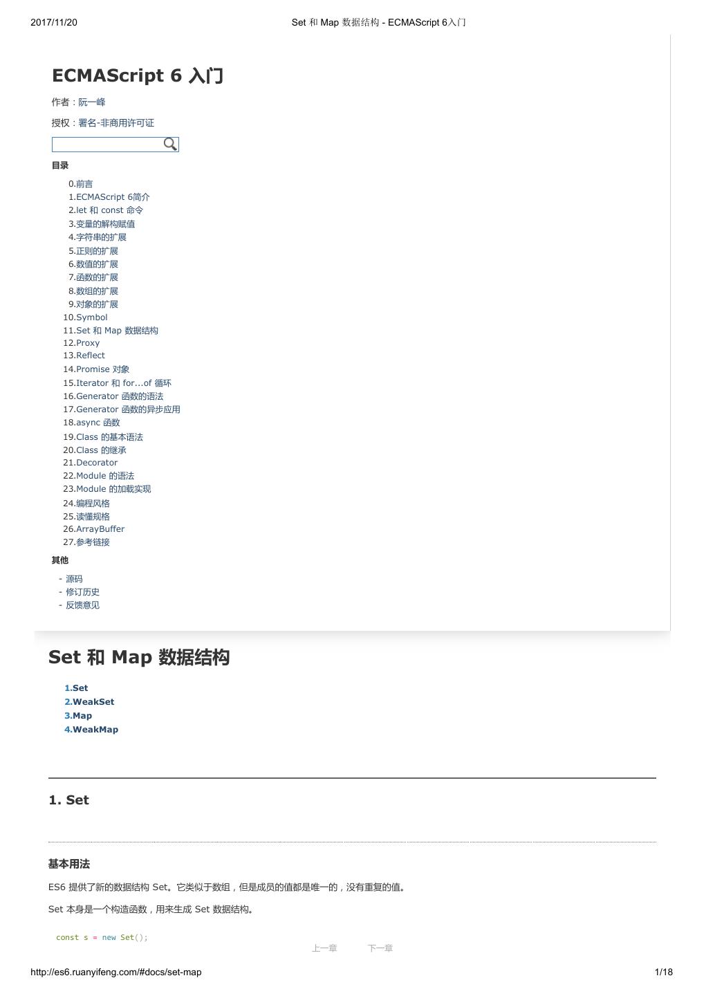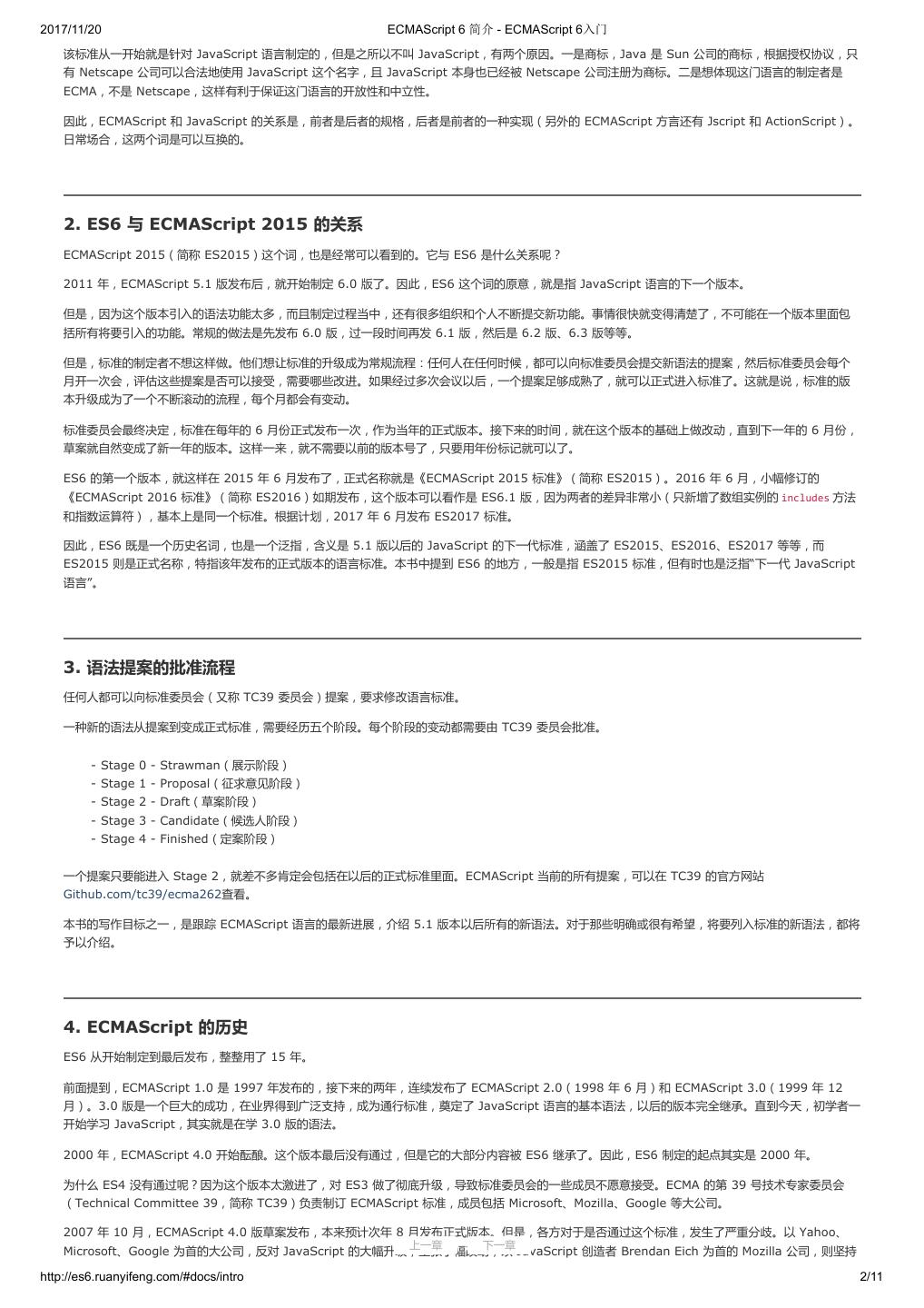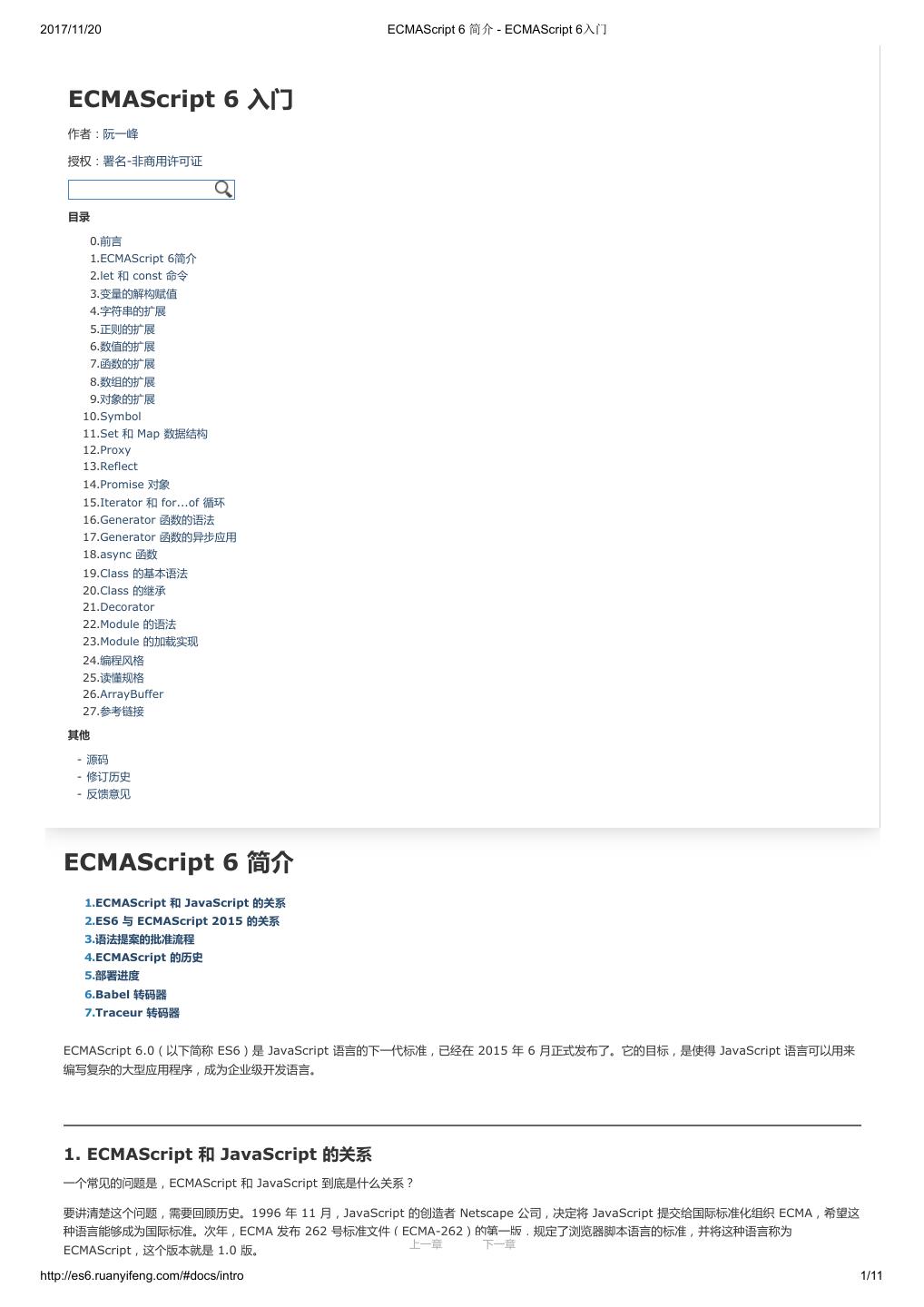 2 .2017/11/20 ECMAScript 6 简介 - ECMAScript 6入门 ECMAScript 6 入门 作者:阮一峰 授权:署名-非商用许可证 目录 0.前言 1.ECMAScript 6简介 2.let 和 const 命令 3.变量的解构赋值 4.字符串的扩展 5.正则的扩展 6.数值的扩展 7.函数的扩展 8.数组的扩展 9.对象的扩展 10.Symbol 11.Set 和 Map 数据结构 12.Proxy 13.Reflect 14.Promise 对象 15.Iterator 和 for...of 循环 16.Generator 函数的语法 17.Generator 函数的异步应用 18.async 函数 19.Class 的基本语法 20.Class 的继承 21.Decorator 22.Module 的语法 23.Module 的加载实现 24.编程风格 25.读懂规格 26.ArrayBuffer 27.参考链接 其他 - 源码 - 修订历史 - 反馈意见 ECMAScript 6 简介 1.ECMAScript 和 JavaScript 的关系 2.ES6 与 ECMAScript 2015 的关系 3.语法提案的批准流程 4.ECMAScript 的历史 5.部署进度 6.Babel 转码器 7.Traceur 转码器 ECMAScript 6.0(以下简称 ES6)是 JavaScript 语言的下一代标准,已经在 2015 年 6 月正式发布了。它的目标,是使得 JavaScript 语言可以用来 编写复杂的大型应用程序,成为企业级开发语言。 1. ECMAScript 和 JavaScript 的关系 一个常见的问题是,ECMAScript 和 JavaScript 到底是什么关系? 要讲清楚这个问题,需要回顾历史。1996 年 11 月,JavaScript 的创造者 Netscape 公司,决定将 JavaScript 提交给国际标准化组织 ECMA,希望这 种语言能够成为国际标准。次年,ECMA 发布 262 号标准文件(ECMA-262)的第一版,规定了浏览器脚本语言的标准,并将这种语言称为 上一章 下一章 ECMAScript,这个版本就是 1.0 版。 http://es6.ruanyifeng.com/#docs/intro 1/11