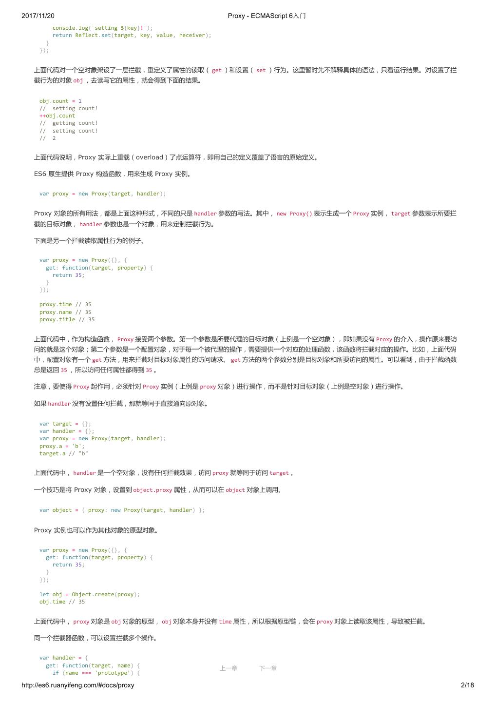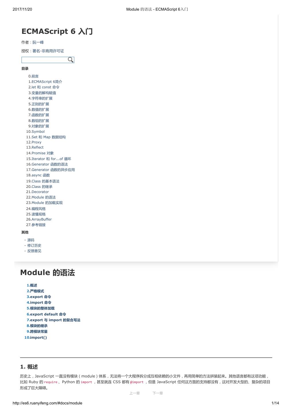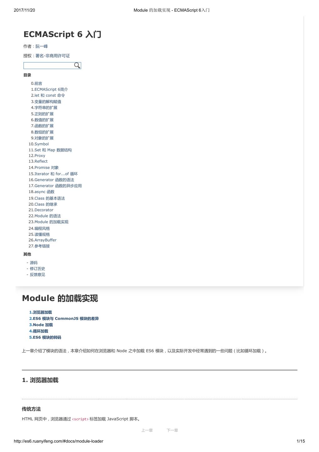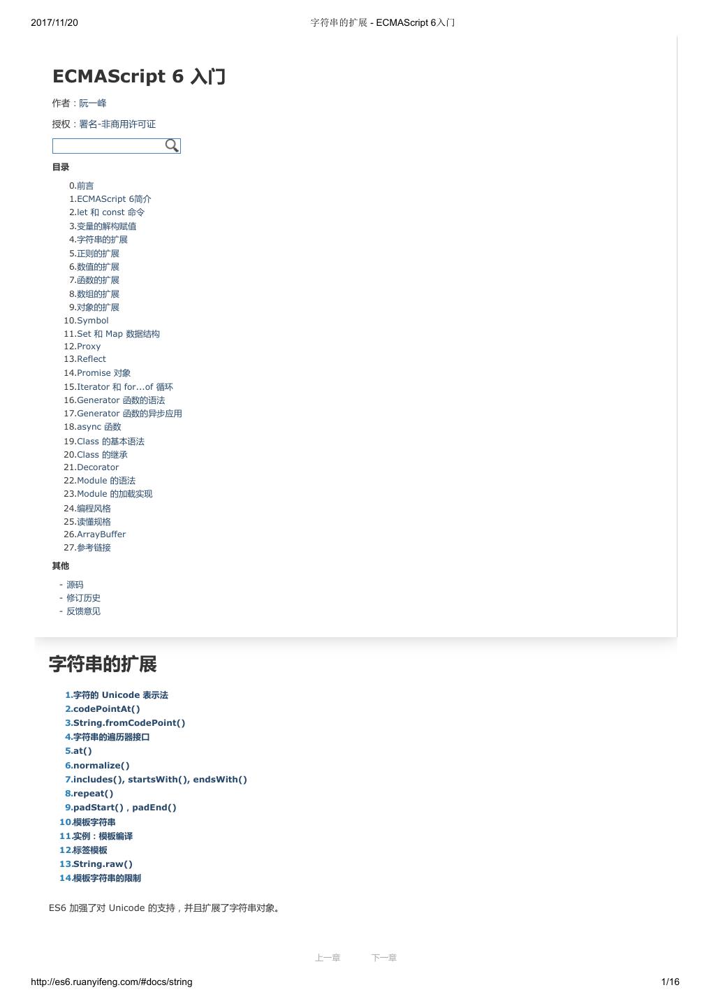 2 .2017/11/20 ECMAScript 6 简介 - ECMAScript 6入门 ECMAScript 6 入门 作者:阮一峰 授权:署名-非商用许可证 目录 0.前言 1.ECMAScript 6简介 2.let 和 const 命令 3.变量的解构赋值 4.字符串的扩展 5.正则的扩展 6.数值的扩展 7.函数的扩展 8.数组的扩展 9.对象的扩展 10.Symbol 11.Set 和 Map 数据结构 12.Proxy 13.Reflect 14.Promise 对象 15.Iterator 和 for...of 循环 16.Generator 函数的语法 17.Generator 函数的异步应用 18.async 函数 19.Class 的基本语法 20.Class 的继承 21.Decorator 22.Module 的语法 23.Module 的加载实现 24.编程风格 25.读懂规格 26.ArrayBuffer 27.参考链接 其他 - 源码 - 修订历史 - 反馈意见 ECMAScript 6 简介 1.ECMAScript 和 JavaScript 的关系 2.ES6 与 ECMAScript 2015 的关系 3.语法提案的批准流程 4.ECMAScript 的历史 5.部署进度 6.Babel 转码器 7.Traceur 转码器 ECMAScript 6.0(以下简称 ES6)是 JavaScript 语言的下一代标准,已经在 2015 年 6 月正式发布了。它的目标,是使得 JavaScript 语言可以用来 编写复杂的大型应用程序,成为企业级开发语言。 1. ECMAScript 和 JavaScript 的关系 一个常见的问题是,ECMAScript 和 JavaScript 到底是什么关系? 要讲清楚这个问题,需要回顾历史。1996 年 11 月,JavaScript 的创造者 Netscape 公司,决定将 JavaScript 提交给国际标准化组织 ECMA,希望这 种语言能够成为国际标准。次年,ECMA 发布 262 号标准文件(ECMA-262)的第一版,规定了浏览器脚本语言的标准,并将这种语言称为 上一章 下一章 ECMAScript,这个版本就是 1.0 版。 http://es6.ruanyifeng.com/#docs/intro 1/11