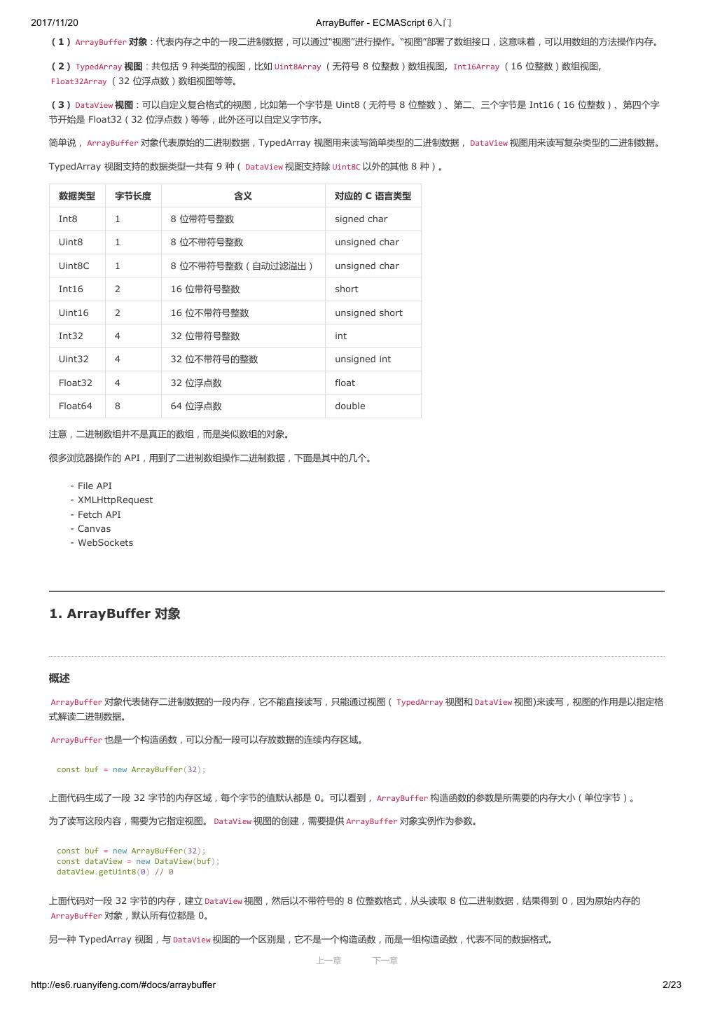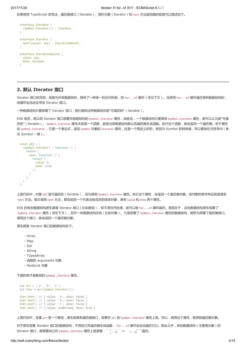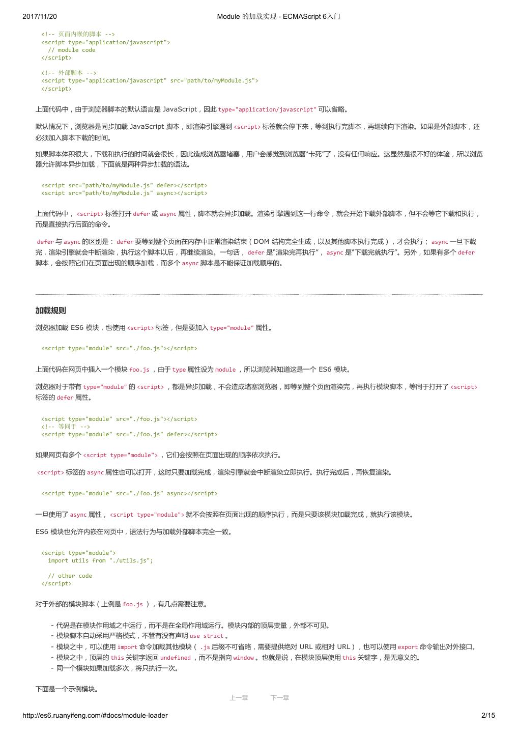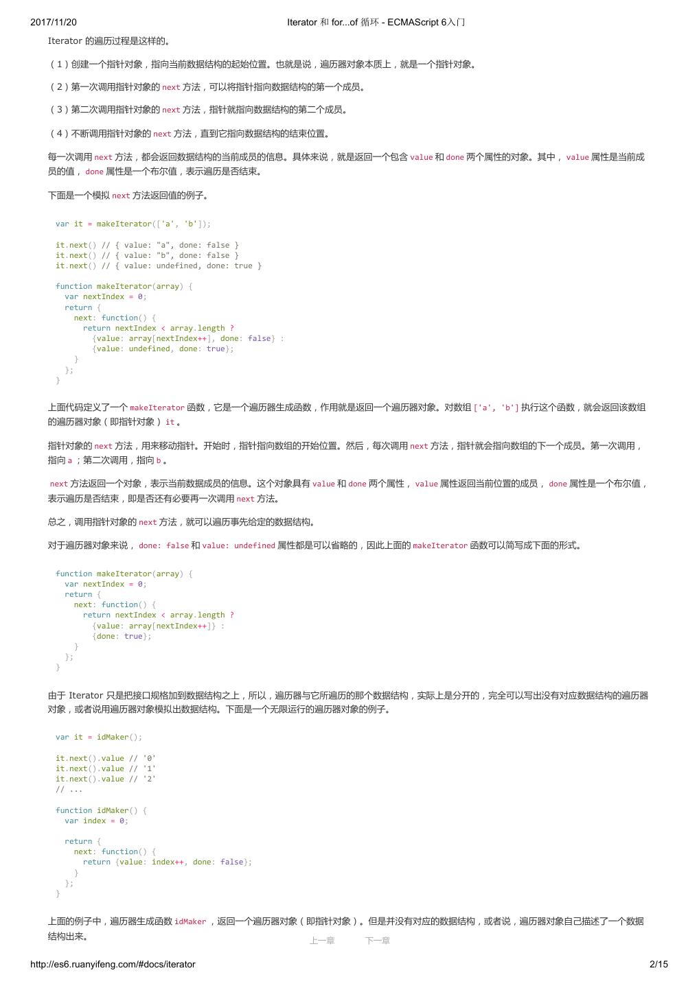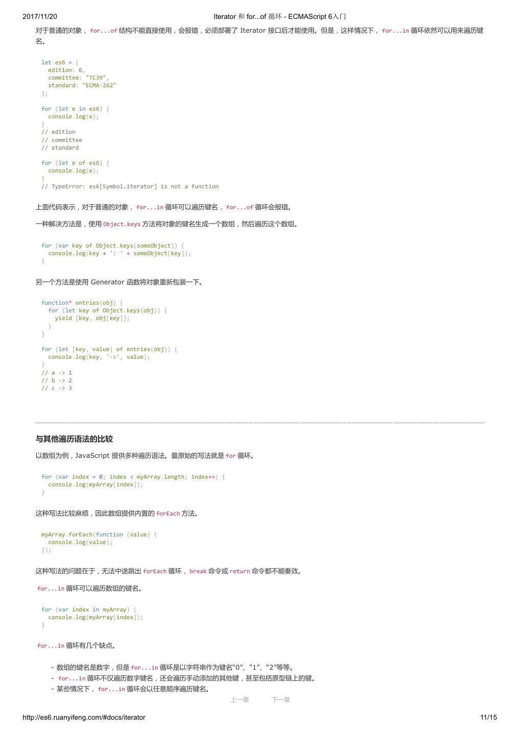 2 .2017/11/20 ECMAScript 6 简介 - ECMAScript 6入门 ECMAScript 6 入门 作者:阮一峰 授权:署名-非商用许可证 目录 0.前言 1.ECMAScript 6简介 2.let 和 const 命令 3.变量的解构赋值 4.字符串的扩展 5.正则的扩展 6.数值的扩展 7.函数的扩展 8.数组的扩展 9.对象的扩展 10.Symbol 11.Set 和 Map 数据结构 12.Proxy 13.Reflect 14.Promise 对象 15.Iterator 和 for...of 循环 16.Generator 函数的语法 17.Generator 函数的异步应用 18.async 函数 19.Class 的基本语法 20.Class 的继承 21.Decorator 22.Module 的语法 23.Module 的加载实现 24.编程风格 25.读懂规格 26.ArrayBuffer 27.参考链接 其他 - 源码 - 修订历史 - 反馈意见 ECMAScript 6 简介 1.ECMAScript 和 JavaScript 的关系 2.ES6 与 ECMAScript 2015 的关系 3.语法提案的批准流程 4.ECMAScript 的历史 5.部署进度 6.Babel 转码器 7.Traceur 转码器 ECMAScript 6.0(以下简称 ES6)是 JavaScript 语言的下一代标准,已经在 2015 年 6 月正式发布了。它的目标,是使得 JavaScript 语言可以用来 编写复杂的大型应用程序,成为企业级开发语言。 1. ECMAScript 和 JavaScript 的关系 一个常见的问题是,ECMAScript 和 JavaScript 到底是什么关系? 要讲清楚这个问题,需要回顾历史。1996 年 11 月,JavaScript 的创造者 Netscape 公司,决定将 JavaScript 提交给国际标准化组织 ECMA,希望这 种语言能够成为国际标准。次年,ECMA 发布 262 号标准文件(ECMA-262)的第一版,规定了浏览器脚本语言的标准,并将这种语言称为 上一章 下一章 ECMAScript,这个版本就是 1.0 版。 http://es6.ruanyifeng.com/#docs/intro 1/11