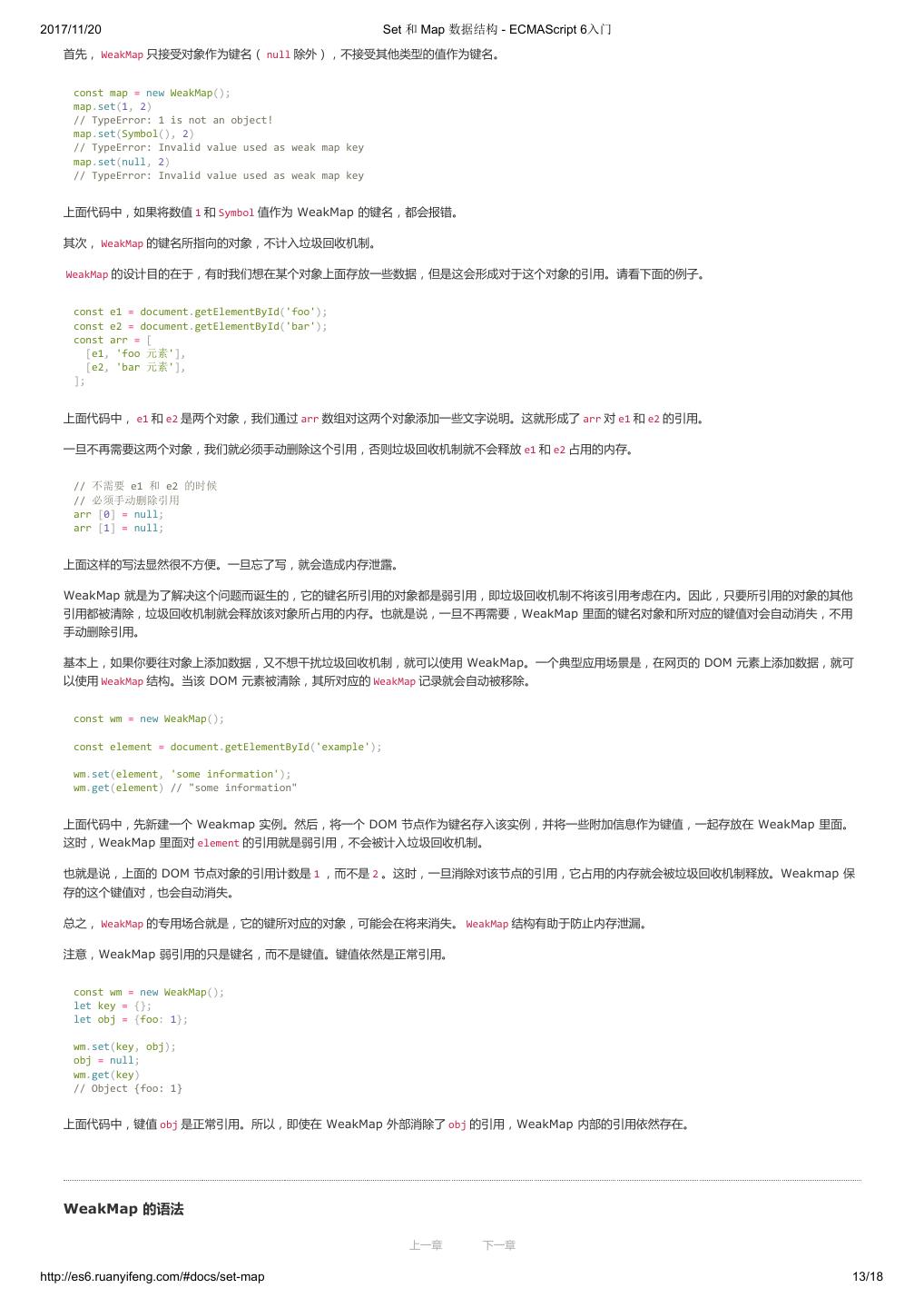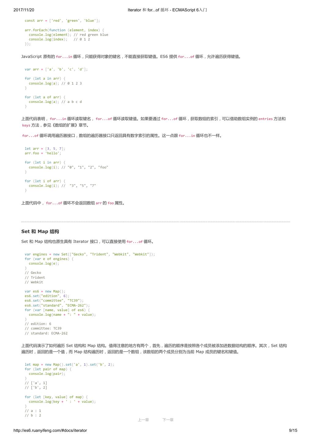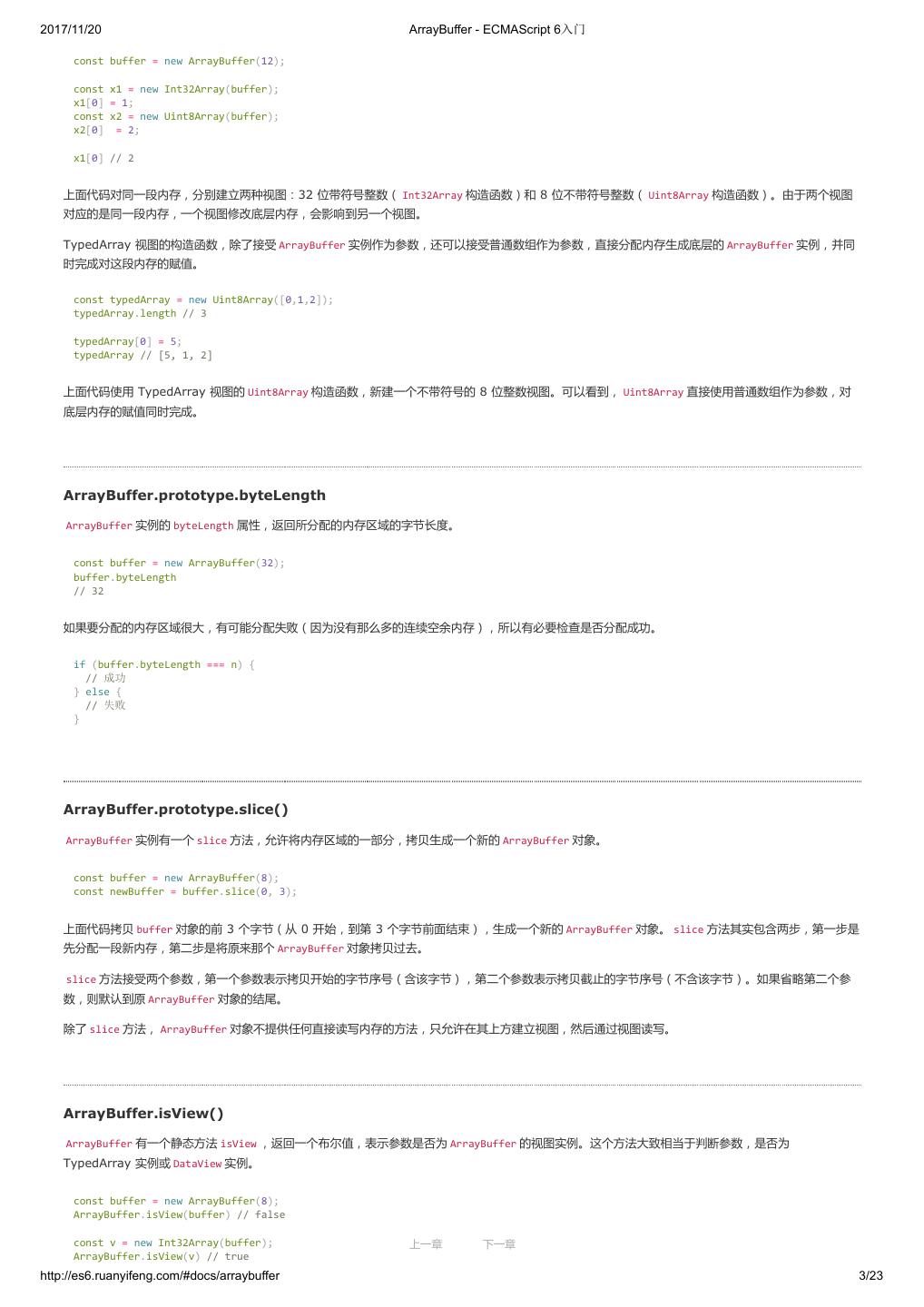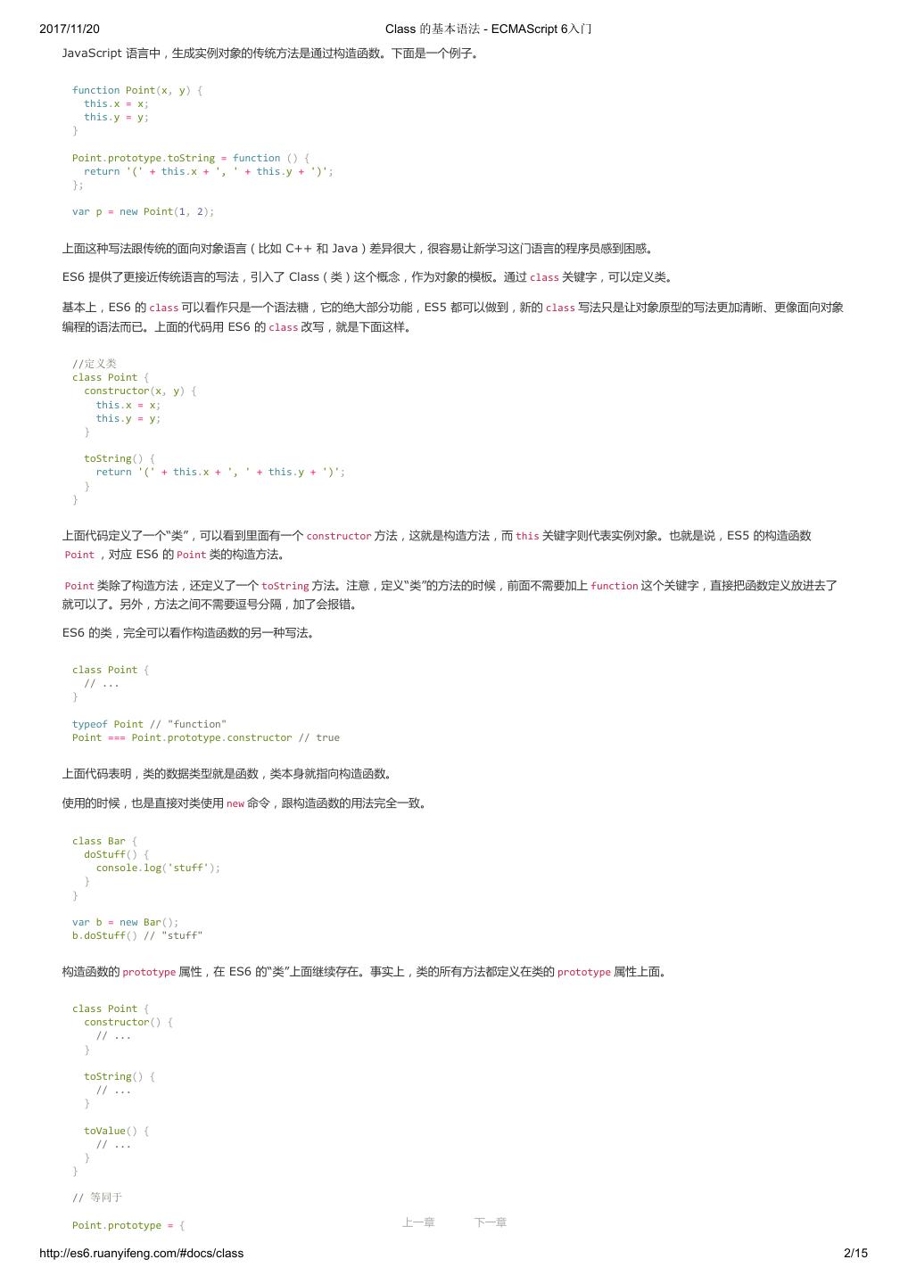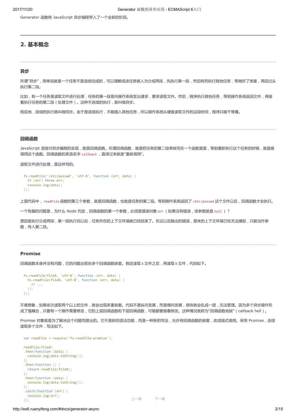 2 .2017/11/20 ECMAScript 6 简介 - ECMAScript 6入门 ECMAScript 6 入门 作者:阮一峰 授权:署名-非商用许可证 目录 0.前言 1.ECMAScript 6简介 2.let 和 const 命令 3.变量的解构赋值 4.字符串的扩展 5.正则的扩展 6.数值的扩展 7.函数的扩展 8.数组的扩展 9.对象的扩展 10.Symbol 11.Set 和 Map 数据结构 12.Proxy 13.Reflect 14.Promise 对象 15.Iterator 和 for...of 循环 16.Generator 函数的语法 17.Generator 函数的异步应用 18.async 函数 19.Class 的基本语法 20.Class 的继承 21.Decorator 22.Module 的语法 23.Module 的加载实现 24.编程风格 25.读懂规格 26.ArrayBuffer 27.参考链接 其他 - 源码 - 修订历史 - 反馈意见 ECMAScript 6 简介 1.ECMAScript 和 JavaScript 的关系 2.ES6 与 ECMAScript 2015 的关系 3.语法提案的批准流程 4.ECMAScript 的历史 5.部署进度 6.Babel 转码器 7.Traceur 转码器 ECMAScript 6.0(以下简称 ES6)是 JavaScript 语言的下一代标准,已经在 2015 年 6 月正式发布了。它的目标,是使得 JavaScript 语言可以用来 编写复杂的大型应用程序,成为企业级开发语言。 1. ECMAScript 和 JavaScript 的关系 一个常见的问题是,ECMAScript 和 JavaScript 到底是什么关系? 要讲清楚这个问题,需要回顾历史。1996 年 11 月,JavaScript 的创造者 Netscape 公司,决定将 JavaScript 提交给国际标准化组织 ECMA,希望这 种语言能够成为国际标准。次年,ECMA 发布 262 号标准文件(ECMA-262)的第一版,规定了浏览器脚本语言的标准,并将这种语言称为 上一章 下一章 ECMAScript,这个版本就是 1.0 版。 http://es6.ruanyifeng.com/#docs/intro 1/11