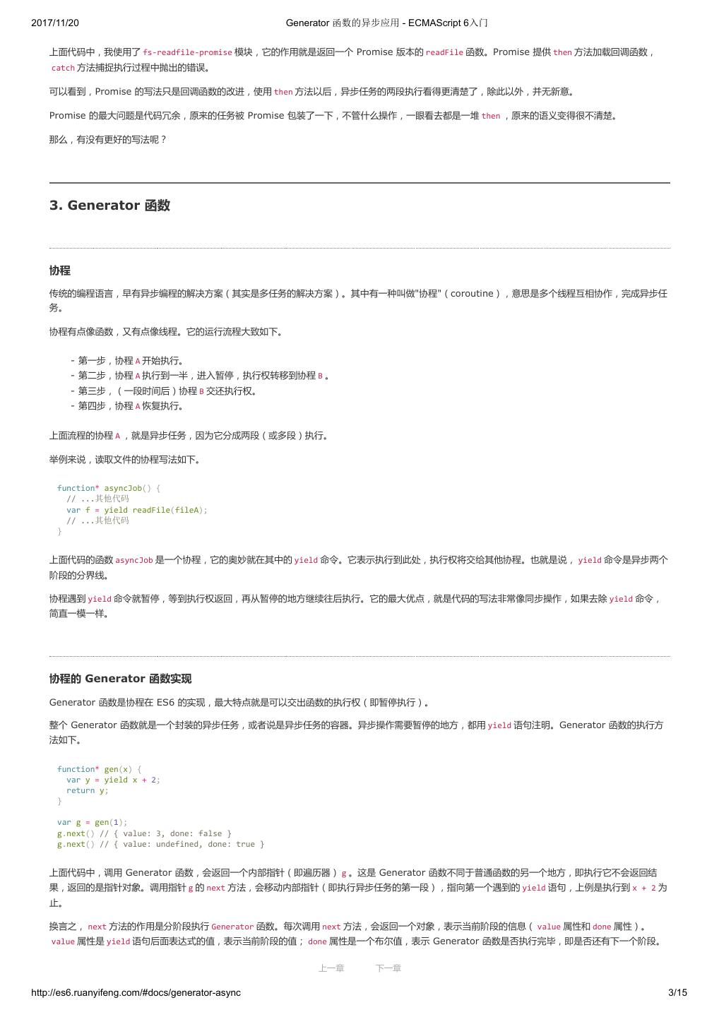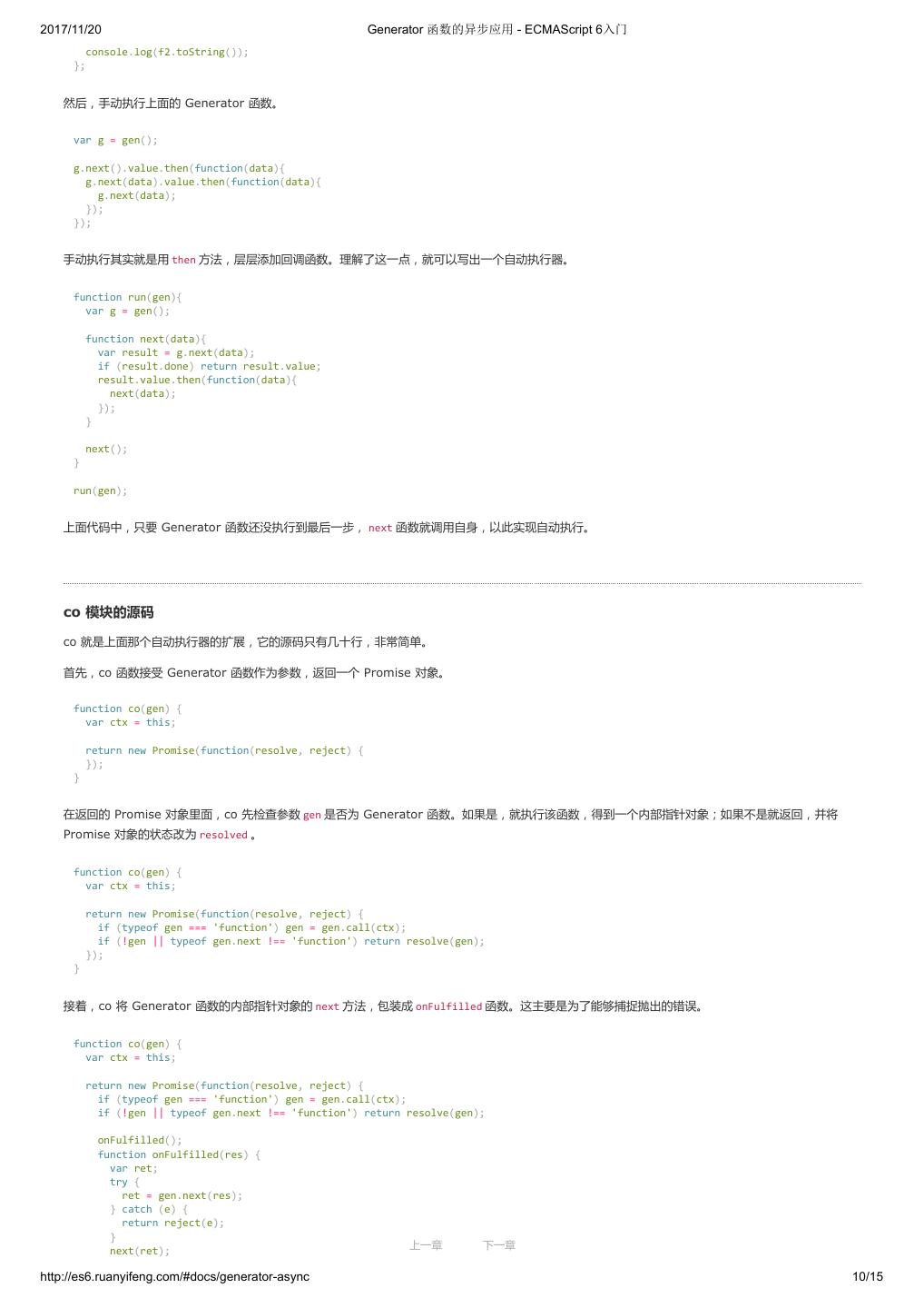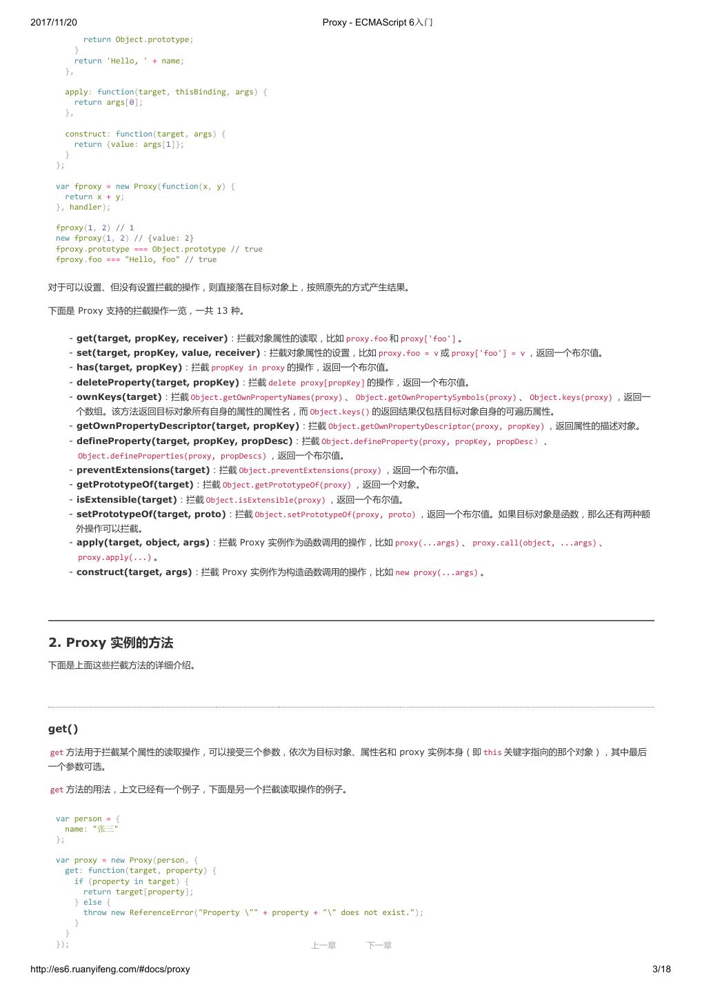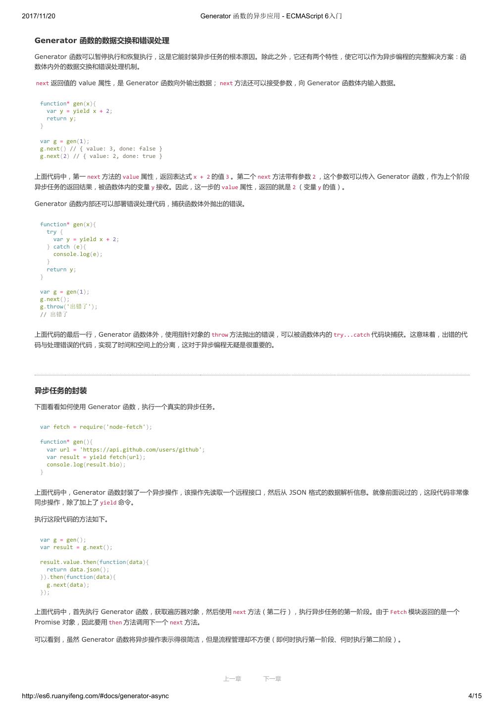 2 .2017/11/20 ECMAScript 6 简介 - ECMAScript 6入门 ECMAScript 6 入门 作者:阮一峰 授权:署名-非商用许可证 目录 0.前言 1.ECMAScript 6简介 2.let 和 const 命令 3.变量的解构赋值 4.字符串的扩展 5.正则的扩展 6.数值的扩展 7.函数的扩展 8.数组的扩展 9.对象的扩展 10.Symbol 11.Set 和 Map 数据结构 12.Proxy 13.Reflect 14.Promise 对象 15.Iterator 和 for...of 循环 16.Generator 函数的语法 17.Generator 函数的异步应用 18.async 函数 19.Class 的基本语法 20.Class 的继承 21.Decorator 22.Module 的语法 23.Module 的加载实现 24.编程风格 25.读懂规格 26.ArrayBuffer 27.参考链接 其他 - 源码 - 修订历史 - 反馈意见 ECMAScript 6 简介 1.ECMAScript 和 JavaScript 的关系 2.ES6 与 ECMAScript 2015 的关系 3.语法提案的批准流程 4.ECMAScript 的历史 5.部署进度 6.Babel 转码器 7.Traceur 转码器 ECMAScript 6.0(以下简称 ES6)是 JavaScript 语言的下一代标准,已经在 2015 年 6 月正式发布了。它的目标,是使得 JavaScript 语言可以用来 编写复杂的大型应用程序,成为企业级开发语言。 1. ECMAScript 和 JavaScript 的关系 一个常见的问题是,ECMAScript 和 JavaScript 到底是什么关系? 要讲清楚这个问题,需要回顾历史。1996 年 11 月,JavaScript 的创造者 Netscape 公司,决定将 JavaScript 提交给国际标准化组织 ECMA,希望这 种语言能够成为国际标准。次年,ECMA 发布 262 号标准文件(ECMA-262)的第一版,规定了浏览器脚本语言的标准,并将这种语言称为 上一章 下一章 ECMAScript,这个版本就是 1.0 版。 http://es6.ruanyifeng.com/#docs/intro 1/11