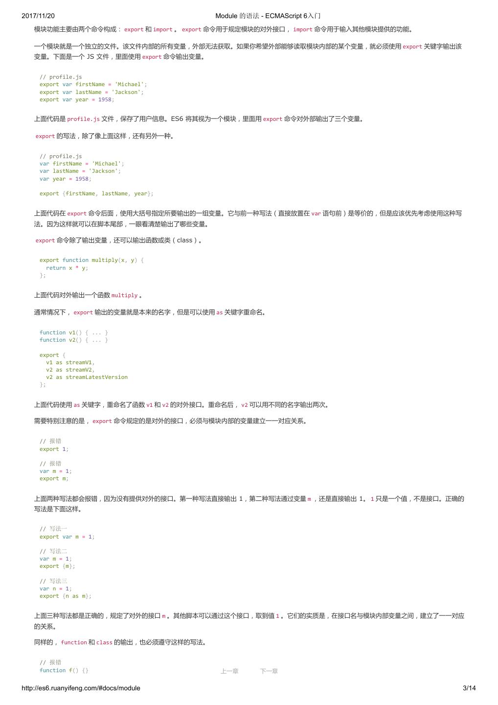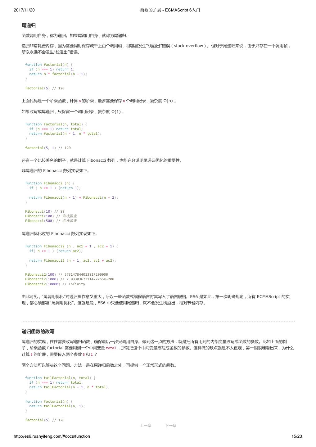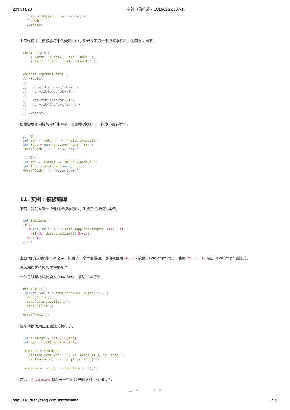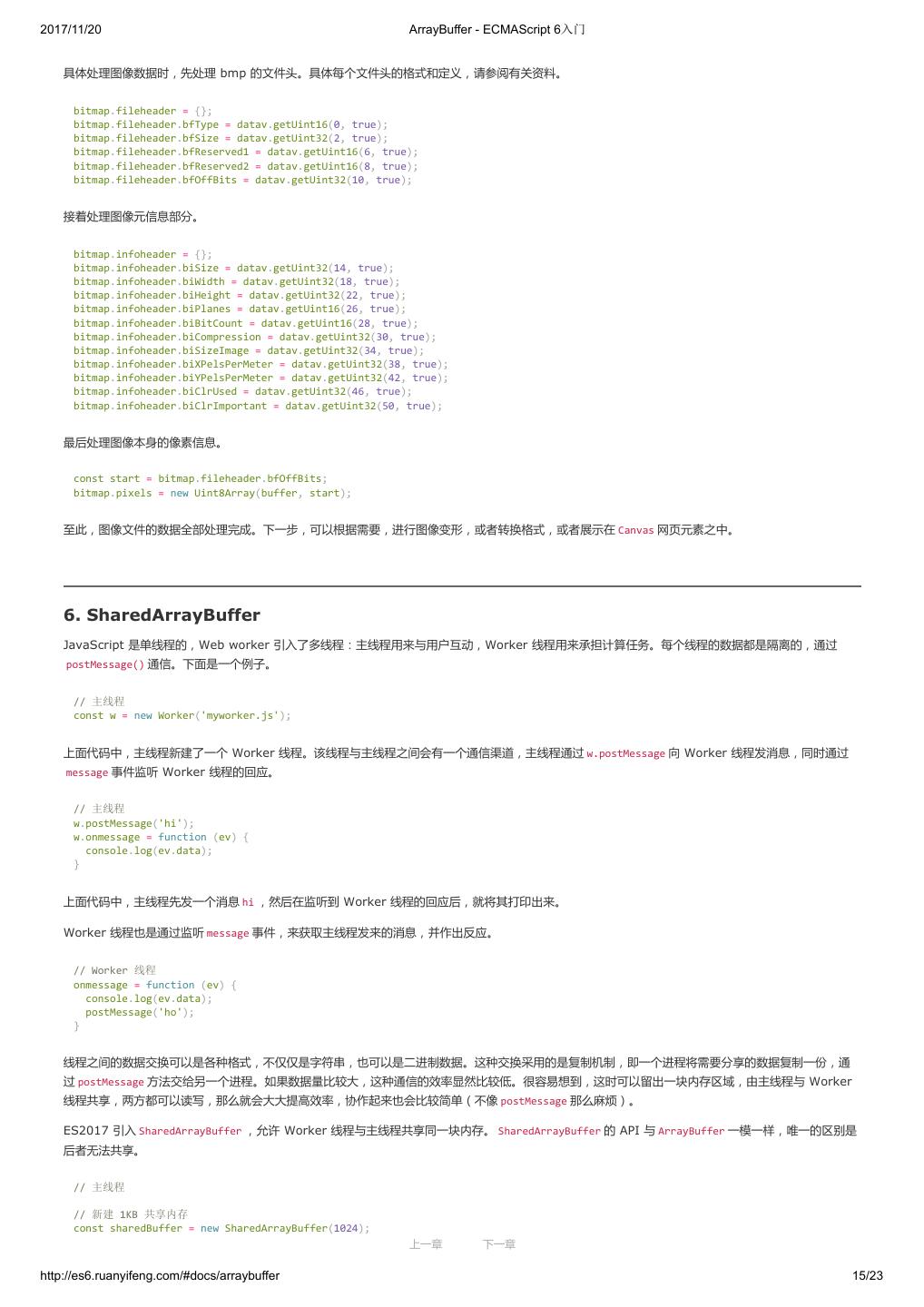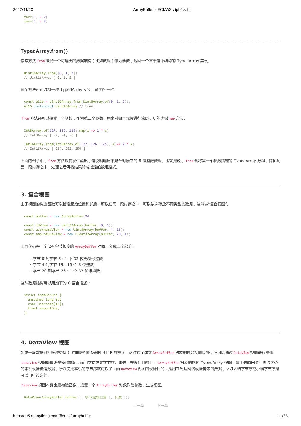 2 .2017/11/20 ECMAScript 6 简介 - ECMAScript 6入门 ECMAScript 6 入门 作者:阮一峰 授权:署名-非商用许可证 目录 0.前言 1.ECMAScript 6简介 2.let 和 const 命令 3.变量的解构赋值 4.字符串的扩展 5.正则的扩展 6.数值的扩展 7.函数的扩展 8.数组的扩展 9.对象的扩展 10.Symbol 11.Set 和 Map 数据结构 12.Proxy 13.Reflect 14.Promise 对象 15.Iterator 和 for...of 循环 16.Generator 函数的语法 17.Generator 函数的异步应用 18.async 函数 19.Class 的基本语法 20.Class 的继承 21.Decorator 22.Module 的语法 23.Module 的加载实现 24.编程风格 25.读懂规格 26.ArrayBuffer 27.参考链接 其他 - 源码 - 修订历史 - 反馈意见 ECMAScript 6 简介 1.ECMAScript 和 JavaScript 的关系 2.ES6 与 ECMAScript 2015 的关系 3.语法提案的批准流程 4.ECMAScript 的历史 5.部署进度 6.Babel 转码器 7.Traceur 转码器 ECMAScript 6.0(以下简称 ES6)是 JavaScript 语言的下一代标准,已经在 2015 年 6 月正式发布了。它的目标,是使得 JavaScript 语言可以用来 编写复杂的大型应用程序,成为企业级开发语言。 1. ECMAScript 和 JavaScript 的关系 一个常见的问题是,ECMAScript 和 JavaScript 到底是什么关系? 要讲清楚这个问题,需要回顾历史。1996 年 11 月,JavaScript 的创造者 Netscape 公司,决定将 JavaScript 提交给国际标准化组织 ECMA,希望这 种语言能够成为国际标准。次年,ECMA 发布 262 号标准文件(ECMA-262)的第一版,规定了浏览器脚本语言的标准,并将这种语言称为 上一章 下一章 ECMAScript,这个版本就是 1.0 版。 http://es6.ruanyifeng.com/#docs/intro 1/11