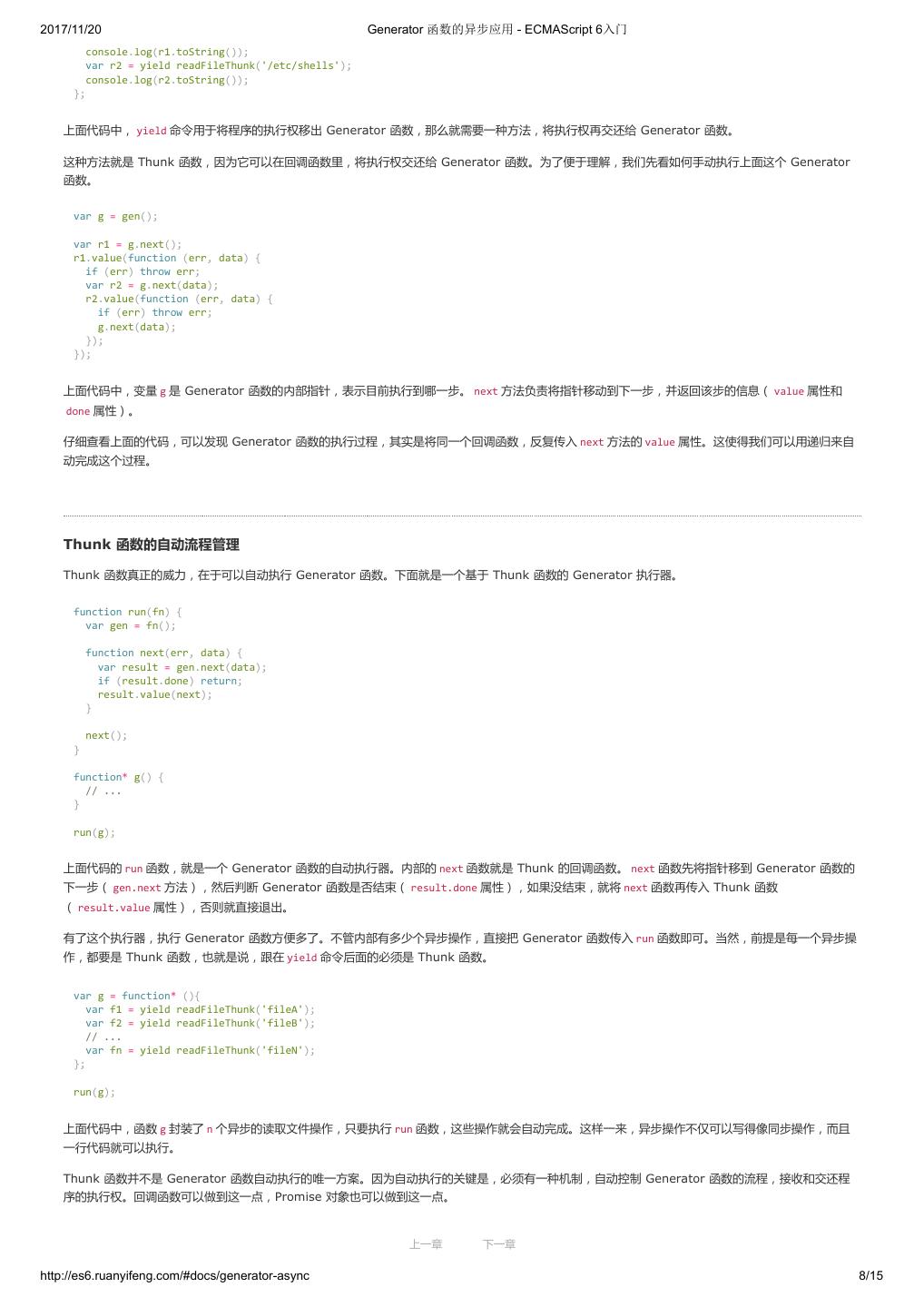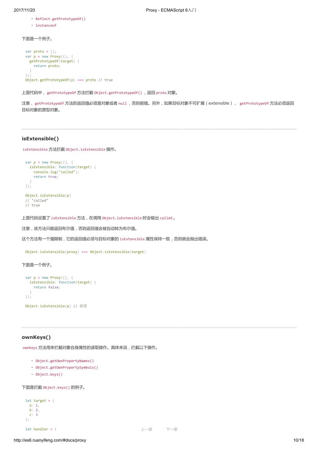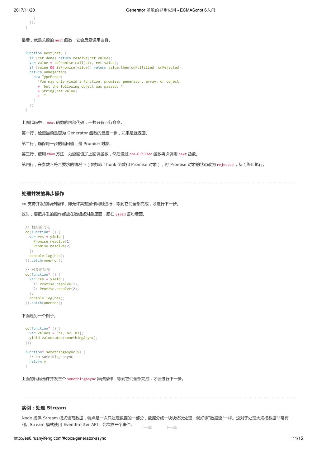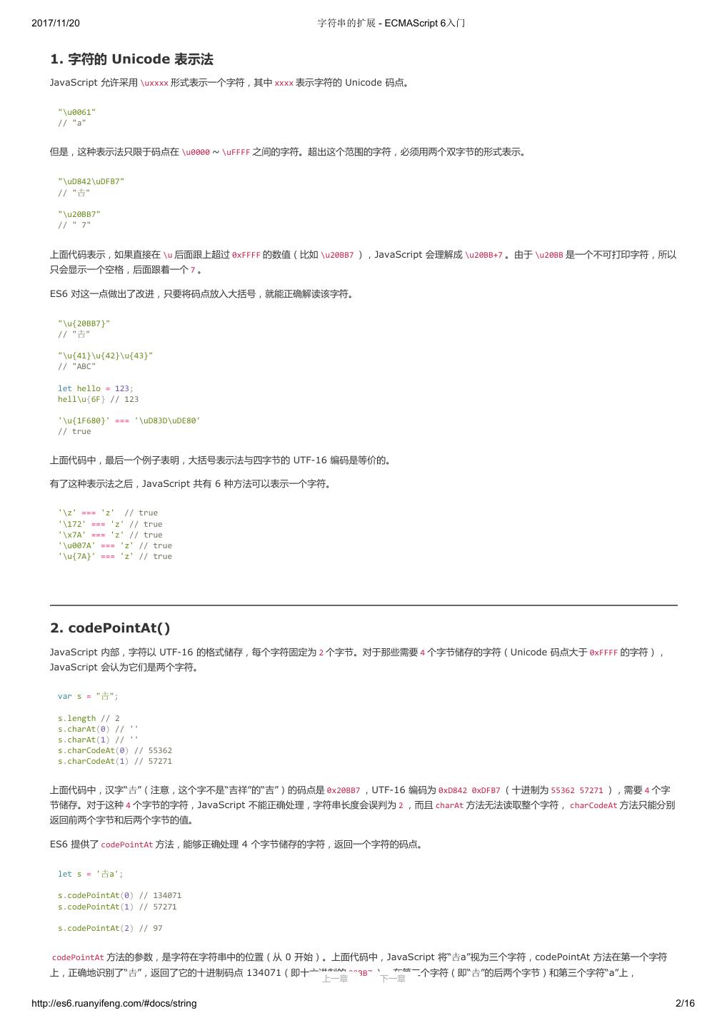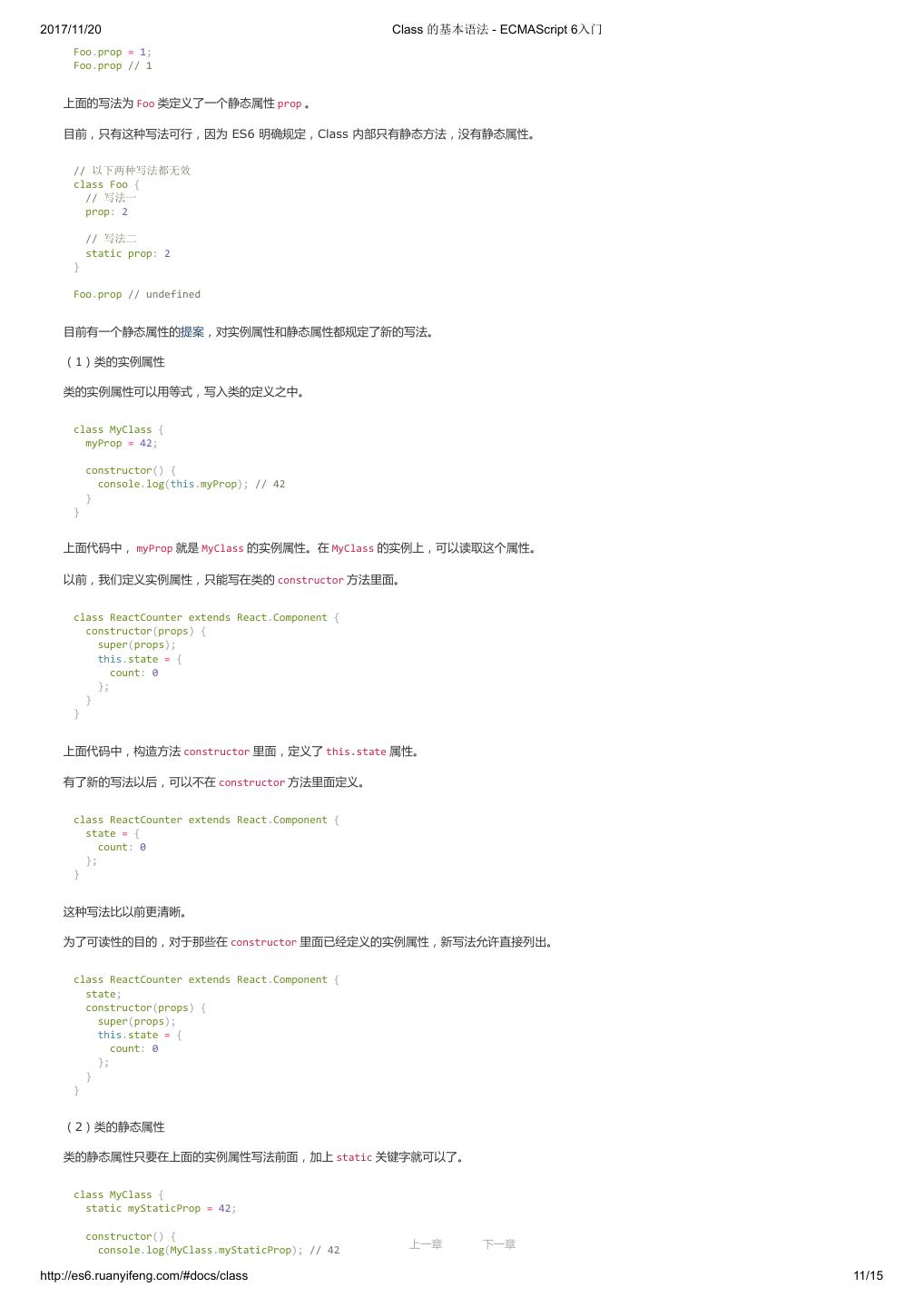 2 .2017/11/20 ECMAScript 6 简介 - ECMAScript 6入门 ECMAScript 6 入门 作者:阮一峰 授权:署名-非商用许可证 目录 0.前言 1.ECMAScript 6简介 2.let 和 const 命令 3.变量的解构赋值 4.字符串的扩展 5.正则的扩展 6.数值的扩展 7.函数的扩展 8.数组的扩展 9.对象的扩展 10.Symbol 11.Set 和 Map 数据结构 12.Proxy 13.Reflect 14.Promise 对象 15.Iterator 和 for...of 循环 16.Generator 函数的语法 17.Generator 函数的异步应用 18.async 函数 19.Class 的基本语法 20.Class 的继承 21.Decorator 22.Module 的语法 23.Module 的加载实现 24.编程风格 25.读懂规格 26.ArrayBuffer 27.参考链接 其他 - 源码 - 修订历史 - 反馈意见 ECMAScript 6 简介 1.ECMAScript 和 JavaScript 的关系 2.ES6 与 ECMAScript 2015 的关系 3.语法提案的批准流程 4.ECMAScript 的历史 5.部署进度 6.Babel 转码器 7.Traceur 转码器 ECMAScript 6.0(以下简称 ES6)是 JavaScript 语言的下一代标准,已经在 2015 年 6 月正式发布了。它的目标,是使得 JavaScript 语言可以用来 编写复杂的大型应用程序,成为企业级开发语言。 1. ECMAScript 和 JavaScript 的关系 一个常见的问题是,ECMAScript 和 JavaScript 到底是什么关系? 要讲清楚这个问题,需要回顾历史。1996 年 11 月,JavaScript 的创造者 Netscape 公司,决定将 JavaScript 提交给国际标准化组织 ECMA,希望这 种语言能够成为国际标准。次年,ECMA 发布 262 号标准文件(ECMA-262)的第一版,规定了浏览器脚本语言的标准,并将这种语言称为 上一章 下一章 ECMAScript,这个版本就是 1.0 版。 http://es6.ruanyifeng.com/#docs/intro 1/11