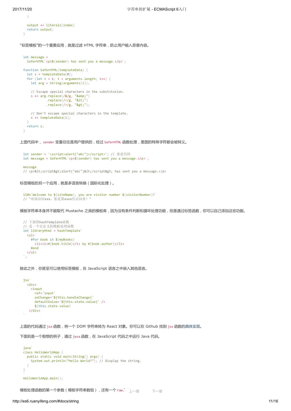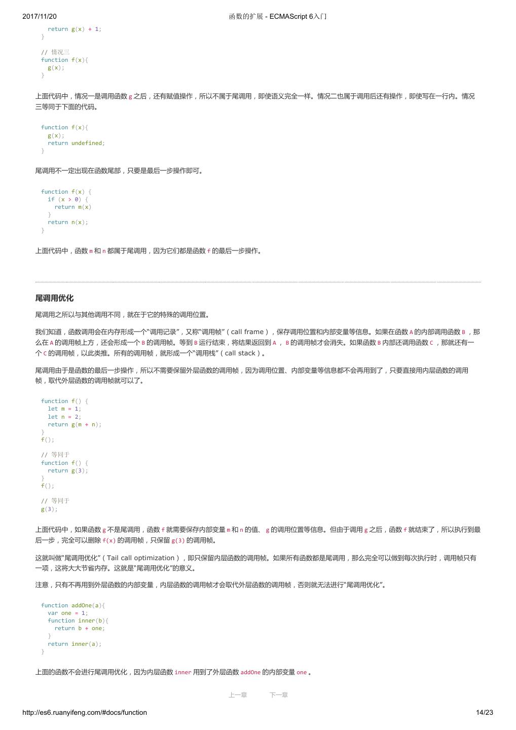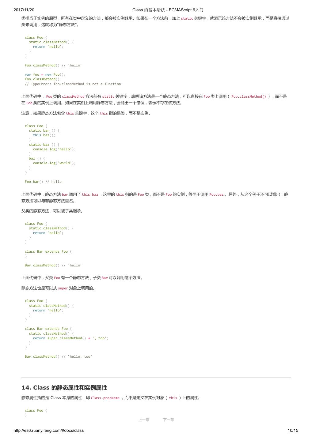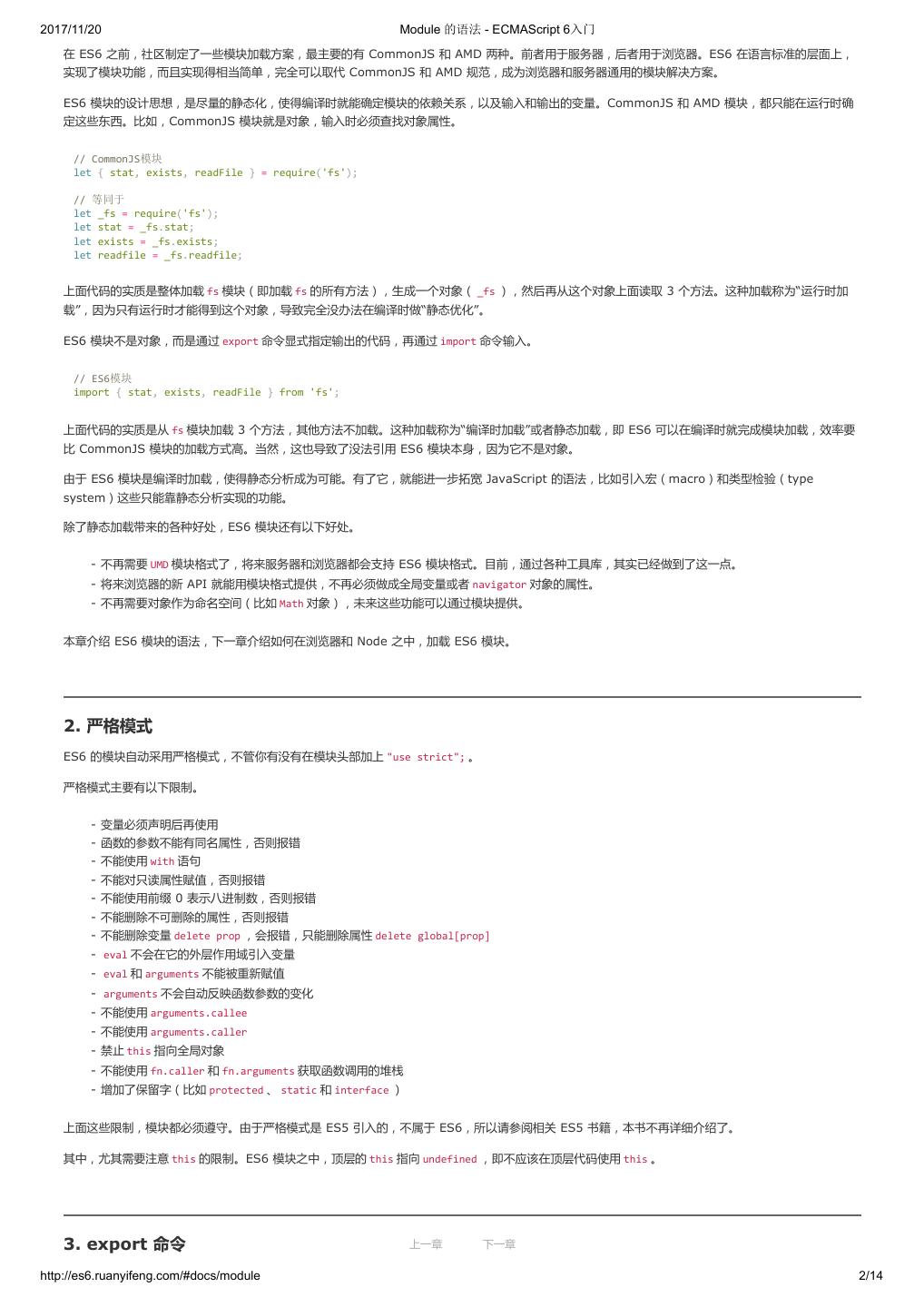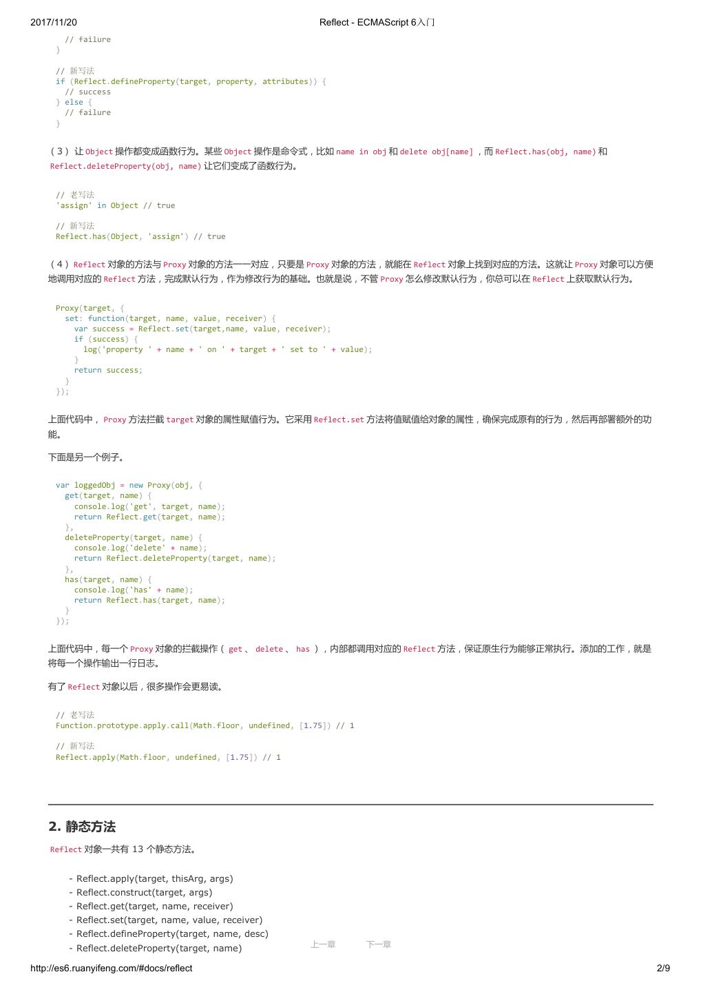 2 .2017/11/20 ECMAScript 6 简介 - ECMAScript 6入门 ECMAScript 6 入门 作者:阮一峰 授权:署名-非商用许可证 目录 0.前言 1.ECMAScript 6简介 2.let 和 const 命令 3.变量的解构赋值 4.字符串的扩展 5.正则的扩展 6.数值的扩展 7.函数的扩展 8.数组的扩展 9.对象的扩展 10.Symbol 11.Set 和 Map 数据结构 12.Proxy 13.Reflect 14.Promise 对象 15.Iterator 和 for...of 循环 16.Generator 函数的语法 17.Generator 函数的异步应用 18.async 函数 19.Class 的基本语法 20.Class 的继承 21.Decorator 22.Module 的语法 23.Module 的加载实现 24.编程风格 25.读懂规格 26.ArrayBuffer 27.参考链接 其他 - 源码 - 修订历史 - 反馈意见 ECMAScript 6 简介 1.ECMAScript 和 JavaScript 的关系 2.ES6 与 ECMAScript 2015 的关系 3.语法提案的批准流程 4.ECMAScript 的历史 5.部署进度 6.Babel 转码器 7.Traceur 转码器 ECMAScript 6.0(以下简称 ES6)是 JavaScript 语言的下一代标准,已经在 2015 年 6 月正式发布了。它的目标,是使得 JavaScript 语言可以用来 编写复杂的大型应用程序,成为企业级开发语言。 1. ECMAScript 和 JavaScript 的关系 一个常见的问题是,ECMAScript 和 JavaScript 到底是什么关系? 要讲清楚这个问题,需要回顾历史。1996 年 11 月,JavaScript 的创造者 Netscape 公司,决定将 JavaScript 提交给国际标准化组织 ECMA,希望这 种语言能够成为国际标准。次年,ECMA 发布 262 号标准文件(ECMA-262)的第一版,规定了浏览器脚本语言的标准,并将这种语言称为 上一章 下一章 ECMAScript,这个版本就是 1.0 版。 http://es6.ruanyifeng.com/#docs/intro 1/11