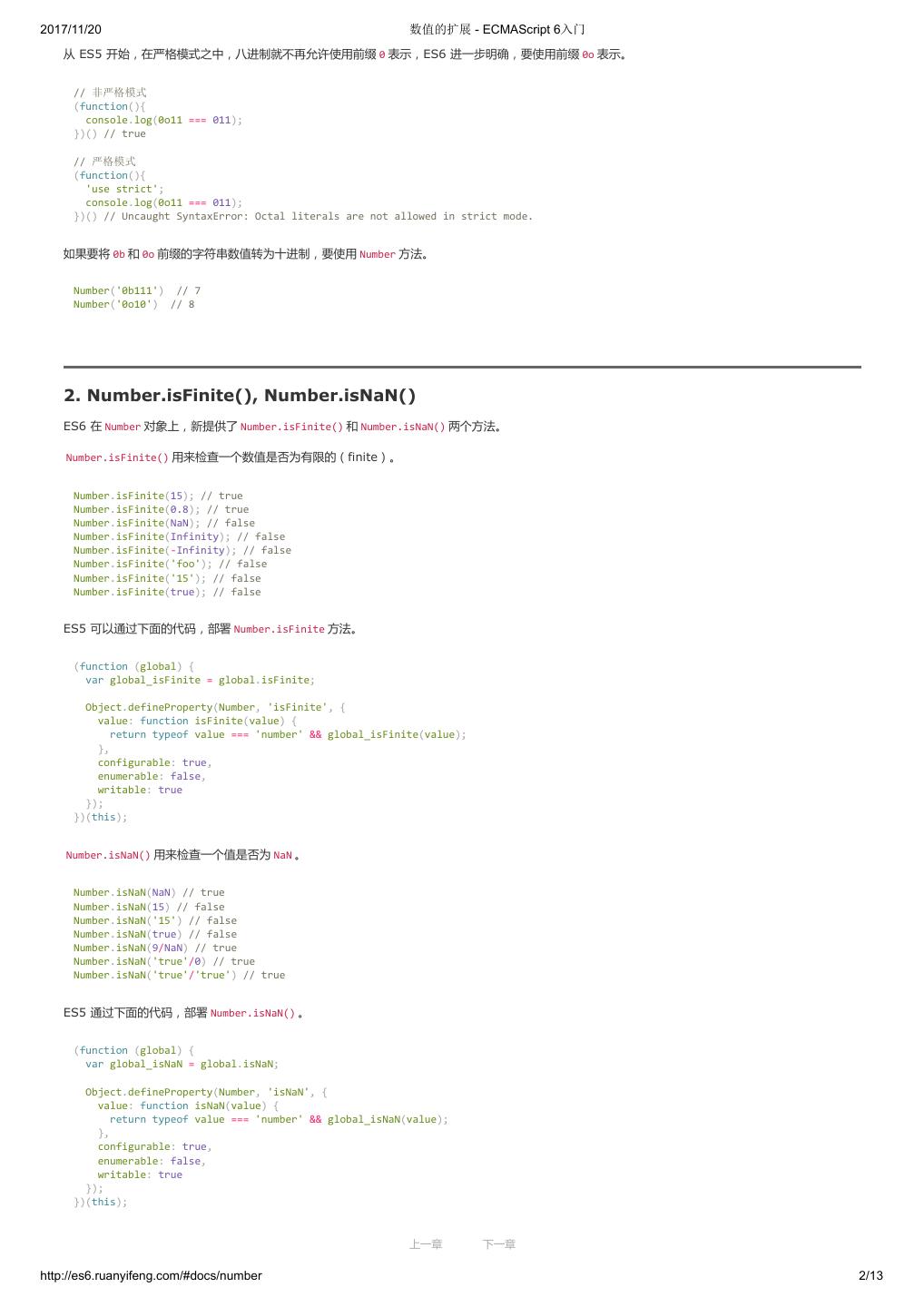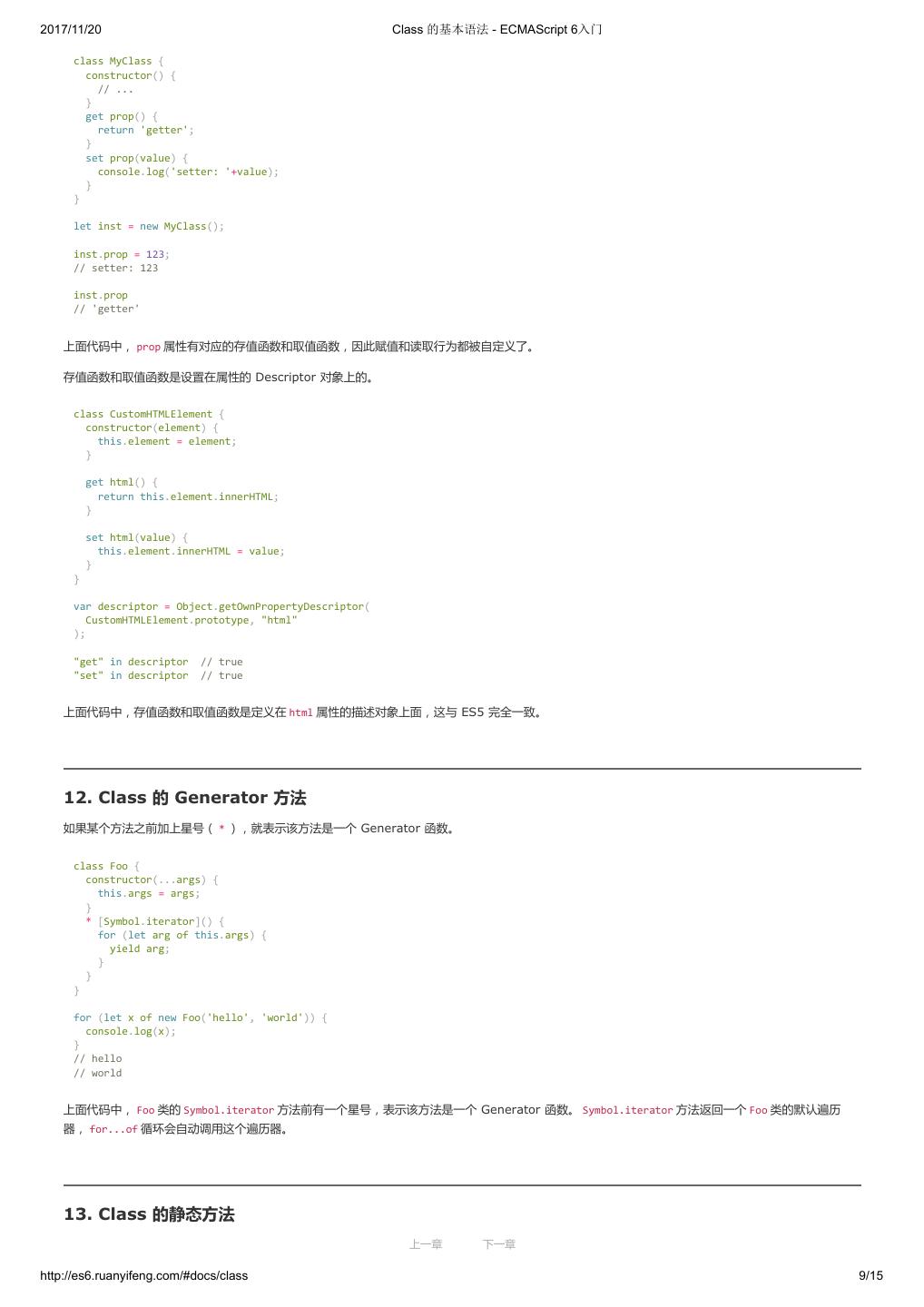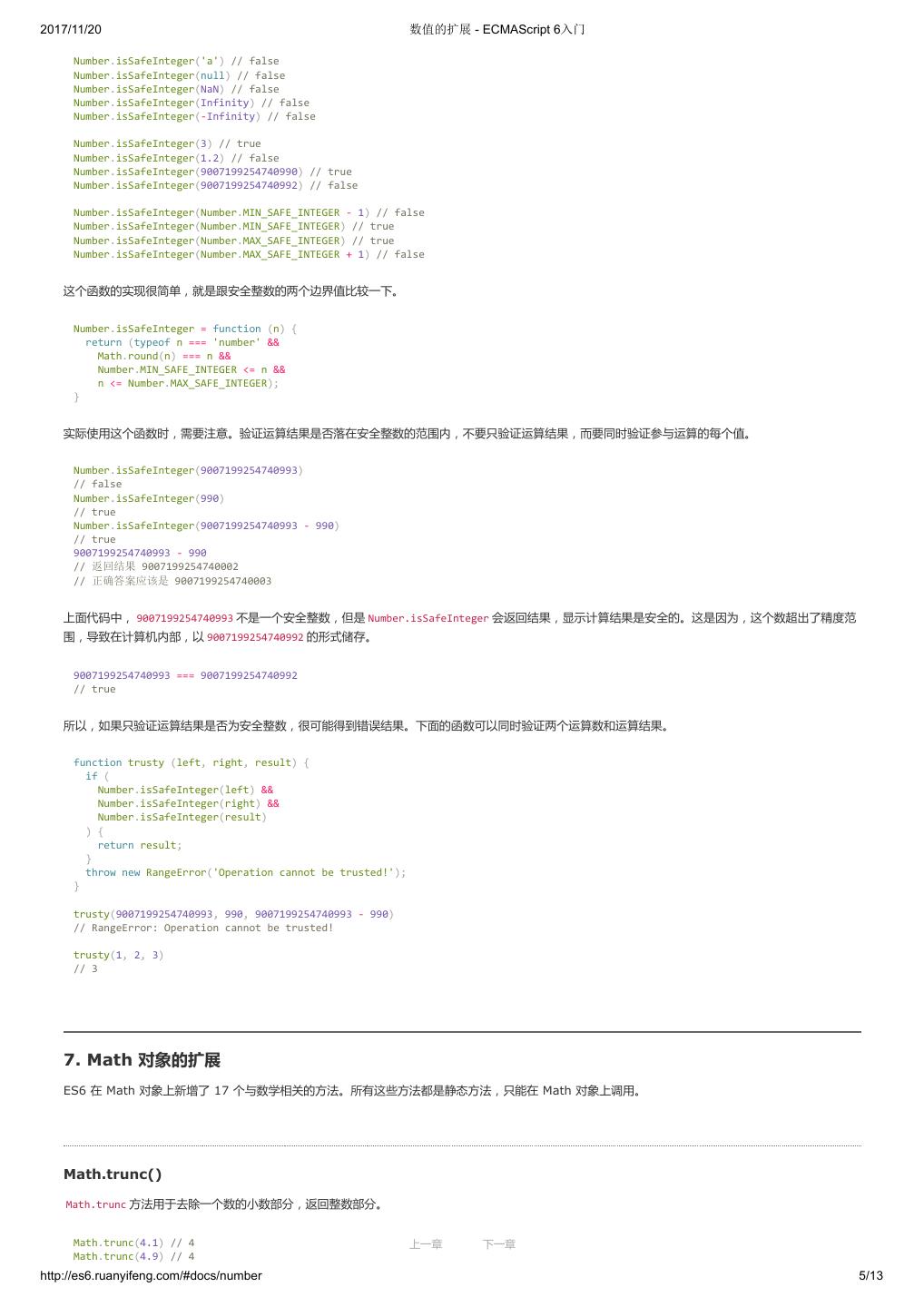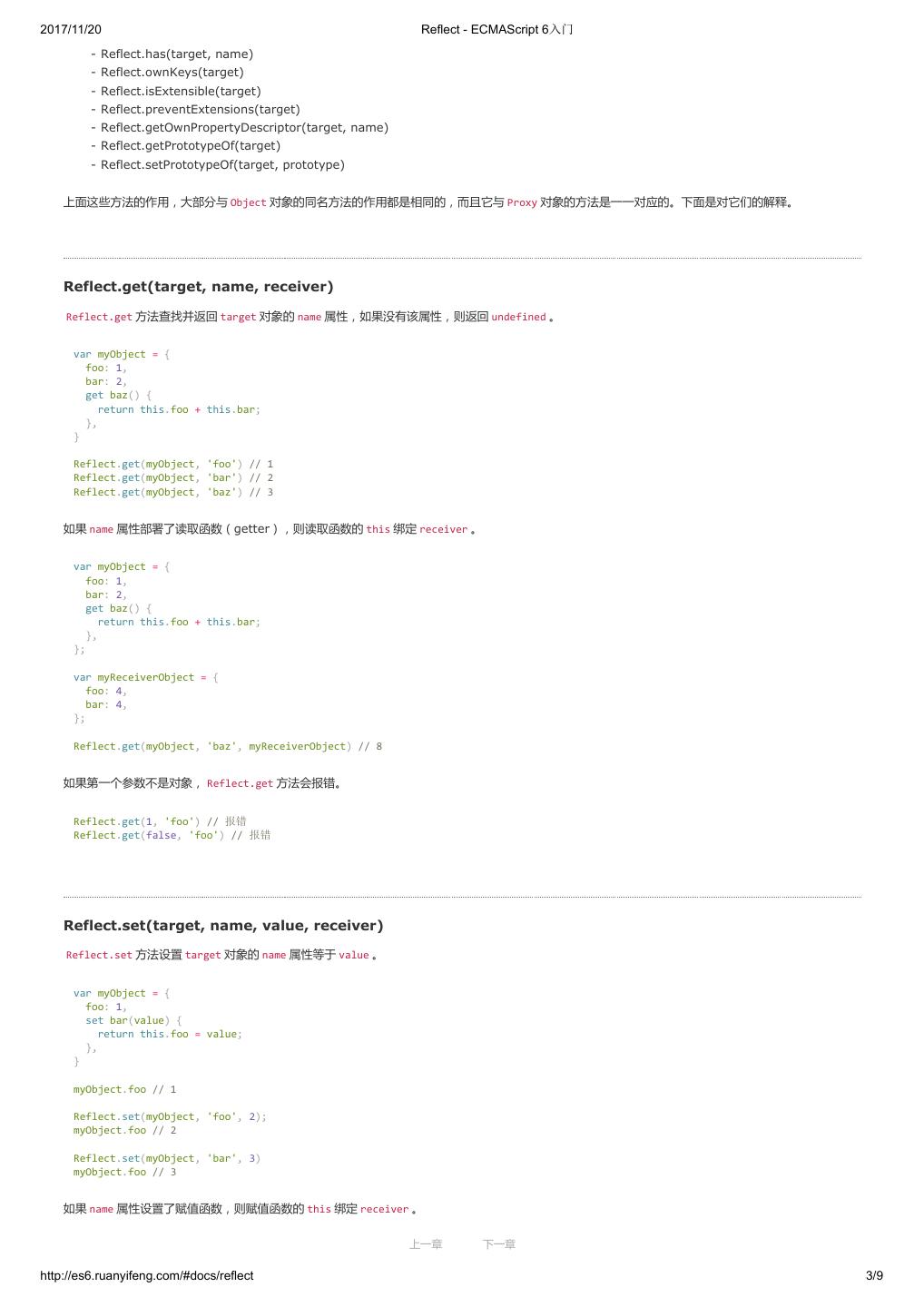 2 .2017/11/20 ECMAScript 6 简介 - ECMAScript 6入门 ECMAScript 6 入门 作者:阮一峰 授权:署名-非商用许可证 目录 0.前言 1.ECMAScript 6简介 2.let 和 const 命令 3.变量的解构赋值 4.字符串的扩展 5.正则的扩展 6.数值的扩展 7.函数的扩展 8.数组的扩展 9.对象的扩展 10.Symbol 11.Set 和 Map 数据结构 12.Proxy 13.Reflect 14.Promise 对象 15.Iterator 和 for...of 循环 16.Generator 函数的语法 17.Generator 函数的异步应用 18.async 函数 19.Class 的基本语法 20.Class 的继承 21.Decorator 22.Module 的语法 23.Module 的加载实现 24.编程风格 25.读懂规格 26.ArrayBuffer 27.参考链接 其他 - 源码 - 修订历史 - 反馈意见 ECMAScript 6 简介 1.ECMAScript 和 JavaScript 的关系 2.ES6 与 ECMAScript 2015 的关系 3.语法提案的批准流程 4.ECMAScript 的历史 5.部署进度 6.Babel 转码器 7.Traceur 转码器 ECMAScript 6.0(以下简称 ES6)是 JavaScript 语言的下一代标准,已经在 2015 年 6 月正式发布了。它的目标,是使得 JavaScript 语言可以用来 编写复杂的大型应用程序,成为企业级开发语言。 1. ECMAScript 和 JavaScript 的关系 一个常见的问题是,ECMAScript 和 JavaScript 到底是什么关系? 要讲清楚这个问题,需要回顾历史。1996 年 11 月,JavaScript 的创造者 Netscape 公司,决定将 JavaScript 提交给国际标准化组织 ECMA,希望这 种语言能够成为国际标准。次年,ECMA 发布 262 号标准文件(ECMA-262)的第一版,规定了浏览器脚本语言的标准,并将这种语言称为 上一章 下一章 ECMAScript,这个版本就是 1.0 版。 http://es6.ruanyifeng.com/#docs/intro 1/11