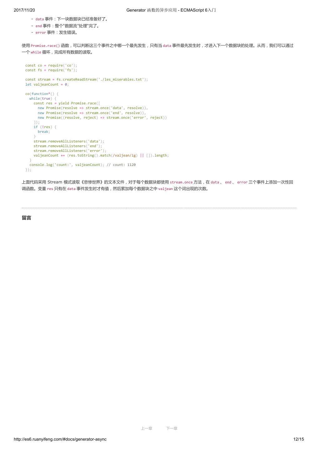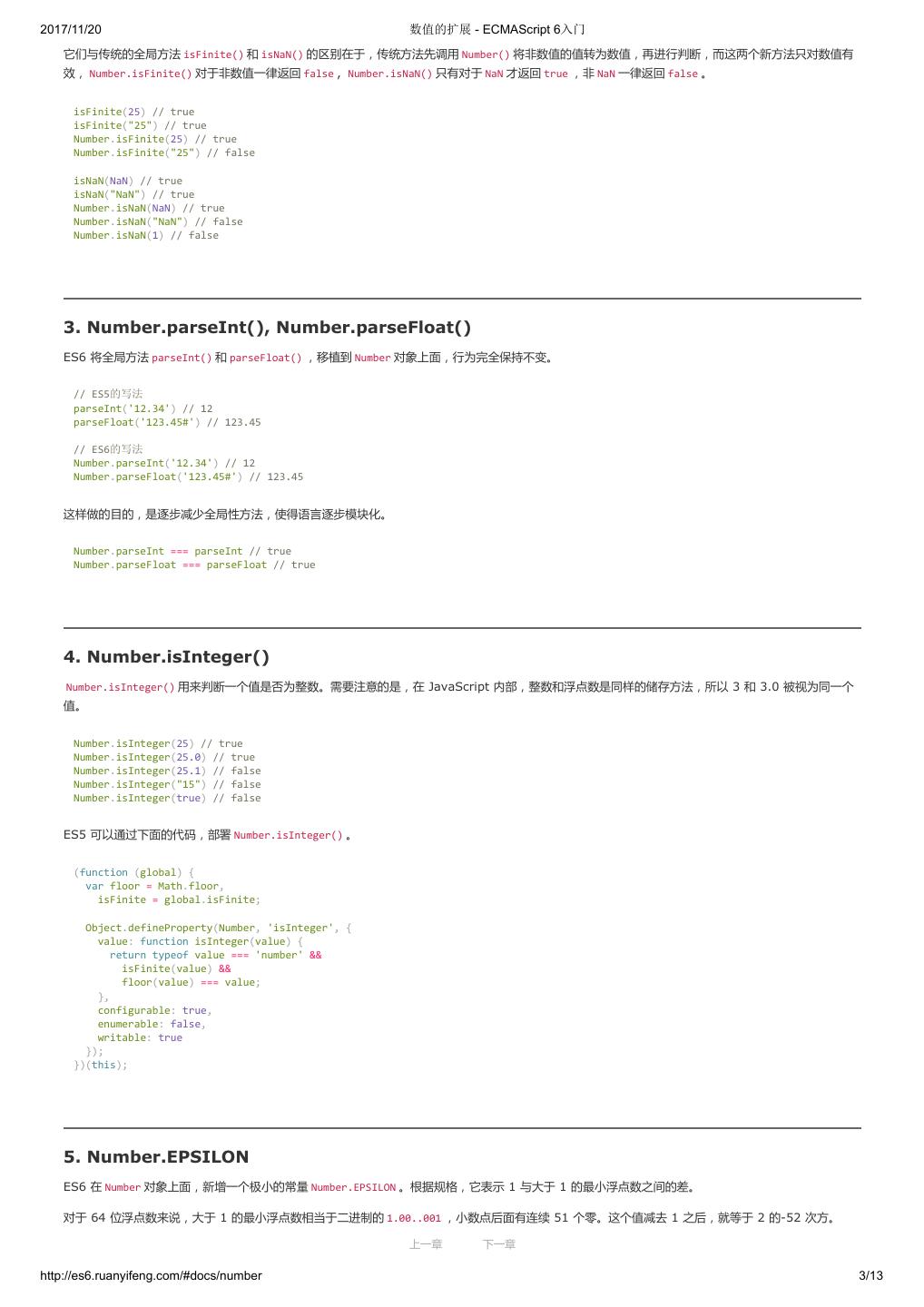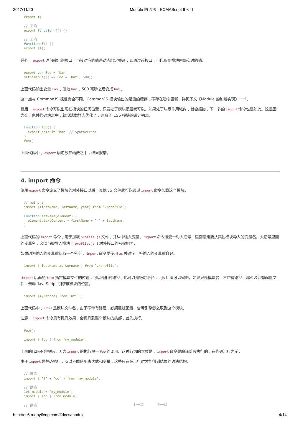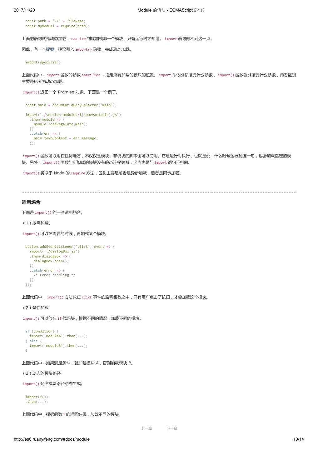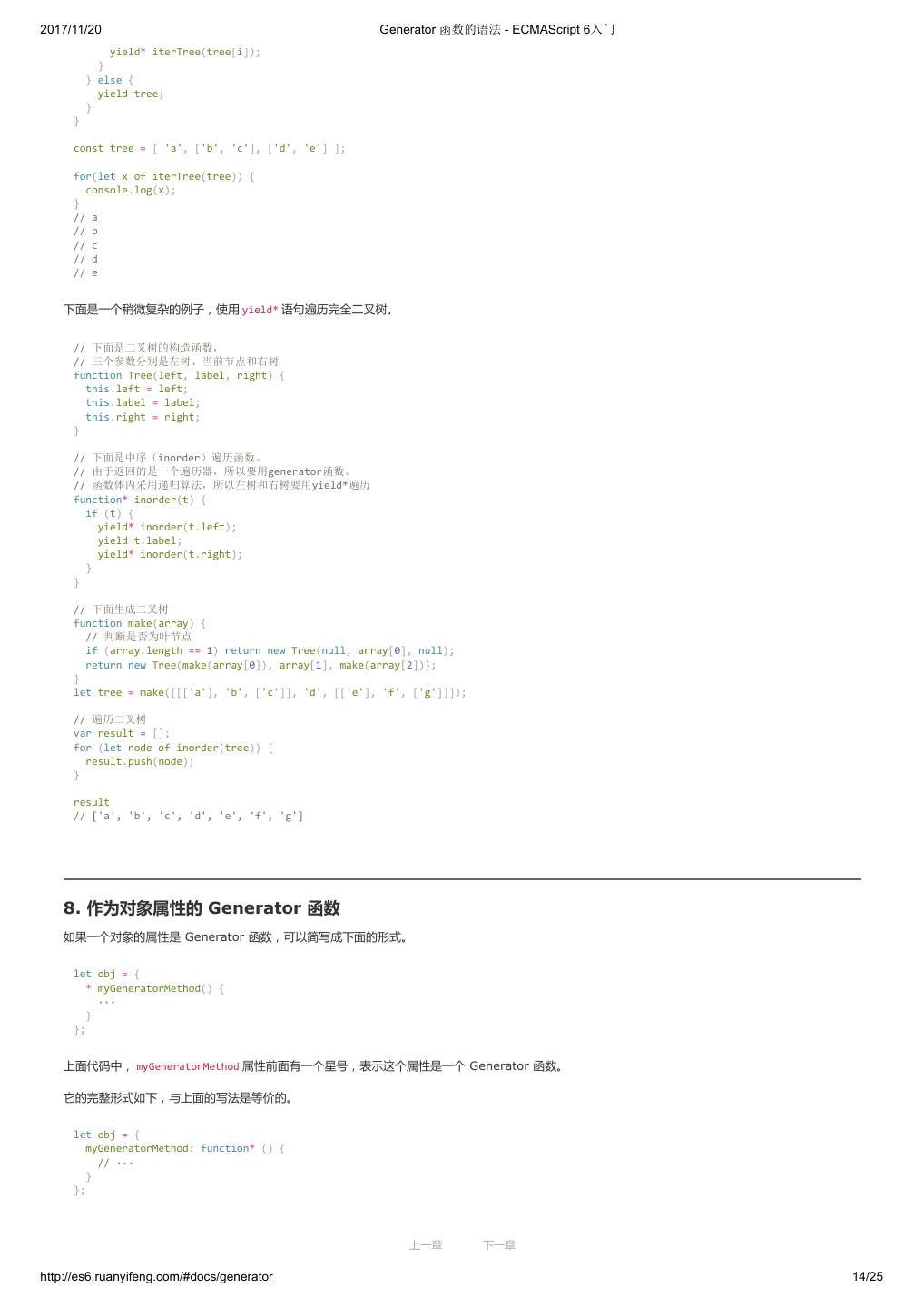 2 .2017/11/20 ECMAScript 6 简介 - ECMAScript 6入门 ECMAScript 6 入门 作者:阮一峰 授权:署名-非商用许可证 目录 0.前言 1.ECMAScript 6简介 2.let 和 const 命令 3.变量的解构赋值 4.字符串的扩展 5.正则的扩展 6.数值的扩展 7.函数的扩展 8.数组的扩展 9.对象的扩展 10.Symbol 11.Set 和 Map 数据结构 12.Proxy 13.Reflect 14.Promise 对象 15.Iterator 和 for...of 循环 16.Generator 函数的语法 17.Generator 函数的异步应用 18.async 函数 19.Class 的基本语法 20.Class 的继承 21.Decorator 22.Module 的语法 23.Module 的加载实现 24.编程风格 25.读懂规格 26.ArrayBuffer 27.参考链接 其他 - 源码 - 修订历史 - 反馈意见 ECMAScript 6 简介 1.ECMAScript 和 JavaScript 的关系 2.ES6 与 ECMAScript 2015 的关系 3.语法提案的批准流程 4.ECMAScript 的历史 5.部署进度 6.Babel 转码器 7.Traceur 转码器 ECMAScript 6.0(以下简称 ES6)是 JavaScript 语言的下一代标准,已经在 2015 年 6 月正式发布了。它的目标,是使得 JavaScript 语言可以用来 编写复杂的大型应用程序,成为企业级开发语言。 1. ECMAScript 和 JavaScript 的关系 一个常见的问题是,ECMAScript 和 JavaScript 到底是什么关系? 要讲清楚这个问题,需要回顾历史。1996 年 11 月,JavaScript 的创造者 Netscape 公司,决定将 JavaScript 提交给国际标准化组织 ECMA,希望这 种语言能够成为国际标准。次年,ECMA 发布 262 号标准文件(ECMA-262)的第一版,规定了浏览器脚本语言的标准,并将这种语言称为 上一章 下一章 ECMAScript,这个版本就是 1.0 版。 http://es6.ruanyifeng.com/#docs/intro 1/11