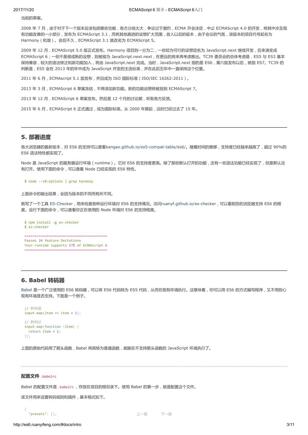 4 .2017/11/20 ECMAScript 6 简介 - ECMAScript 6入门 当前的草案。 2008 年 7 月,由于对于下一个版本应该包括哪些功能,各方分歧太大,争论过于激烈,ECMA 开会决定,中止 ECMAScript 4.0 的开发,将其中涉及现 有功能改善的一小部分,发布为 ECMAScript 3.1,而将其他激进的设想扩大范围,放入以后的版本,由于会议的气氛,该版本的项目代号起名为 Harmony(和谐)。会后不久,ECMAScript 3.1 就改名为 ECMAScript 5。 2009 年 12 月,ECMAScript 5.0 版正式发布。Harmony 项目则一分为二,一些较为可行的设想定名为 JavaScript.next 继续开发,后来演变成 ECMAScript 6;一些不是很成熟的设想,则被视为 JavaScript.next.next,在更远的将来再考虑推出。TC39 委员会的总体考虑是,ES5 与 ES3 基本 保持兼容,较大的语法修正和新功能加入,将由 JavaScript.next 完成。当时,JavaScript.next 指的是 ES6,第六版发布以后,就指 ES7。TC39 的 判断是,ES5 会在 2013 年的年中成为 JavaScript 开发的主流标准,并在此后五年中一直保持这个位置。 2011 年 6 月,ECMAscript 5.1 版发布,并且成为 ISO 国际标准(ISO/IEC 16262:2011)。 2013 年 3 月,ECMAScript 6 草案冻结,不再添加新功能。新的功能设想将被放到 ECMAScript 7。 2013 年 12 月,ECMAScript 6 草案发布。然后是 12 个月的讨论期,听取各方反馈。 2015 年 6 月,ECMAScript 6 正式通过,成为国际标准。从 2000 年算起,这时已经过去了 15 年。 5. 部署进度 各大浏览器的最新版本,对 ES6 的支持可以查看kangax.github.io/es5-compat-table/es6/。随着时间的推移,支持度已经越来越高了,超过 90%的 ES6 语法特性都实现了。 Node 是 JavaScript 的服务器运行环境(runtime)。它对 ES6 的支持度更高。除了那些默认打开的功能,还有一些语法功能已经实现了,但是默认没 有打开。使用下面的命令,可以查看 Node 已经实现的 ES6 特性。 $ node --v8-options | grep harmony 上面命令的输出结果,会因为版本的不同而有所不同。 我写了一个工具 ES-Checker,用来检查各种运行环境对 ES6 的支持情况。访问ruanyf.github.io/es-checker,可以看到您的浏览器支持 ES6 的程 度。运行下面的命令,可以查看你正在使用的 Node 环境对 ES6 的支持程度。 $ npm install -g es-checker $ es-checker ========================================= Passes 24 feature Dectations Your runtime supports 57% of ECMAScript 6 ========================================= 6. Babel 转码器 Babel 是一个广泛使用的 ES6 转码器,可以将 ES6 代码转为 ES5 代码,从而在现有环境执行。这意味着,你可以用 ES6 的方式编写程序,又不用担心 现有环境是否支持。下面是一个例子。 // 转码前 input.map(item => item + 1); // 转码后 input.map(function (item) { return item + 1; }); 上面的原始代码用了箭头函数,Babel 将其转为普通函数,就能在不支持箭头函数的 JavaScript 环境执行了。 配置文件 .babelrc Babel 的配置文件是 .babelrc ,存放在项目的根目录下。使用 Babel 的第一步,就是配置这个文件。 该文件用来设置转码规则和插件,基本格式如下。 { "presets": [], 上一章 下一章 http://es6.ruanyifeng.com/#docs/intro 3/11