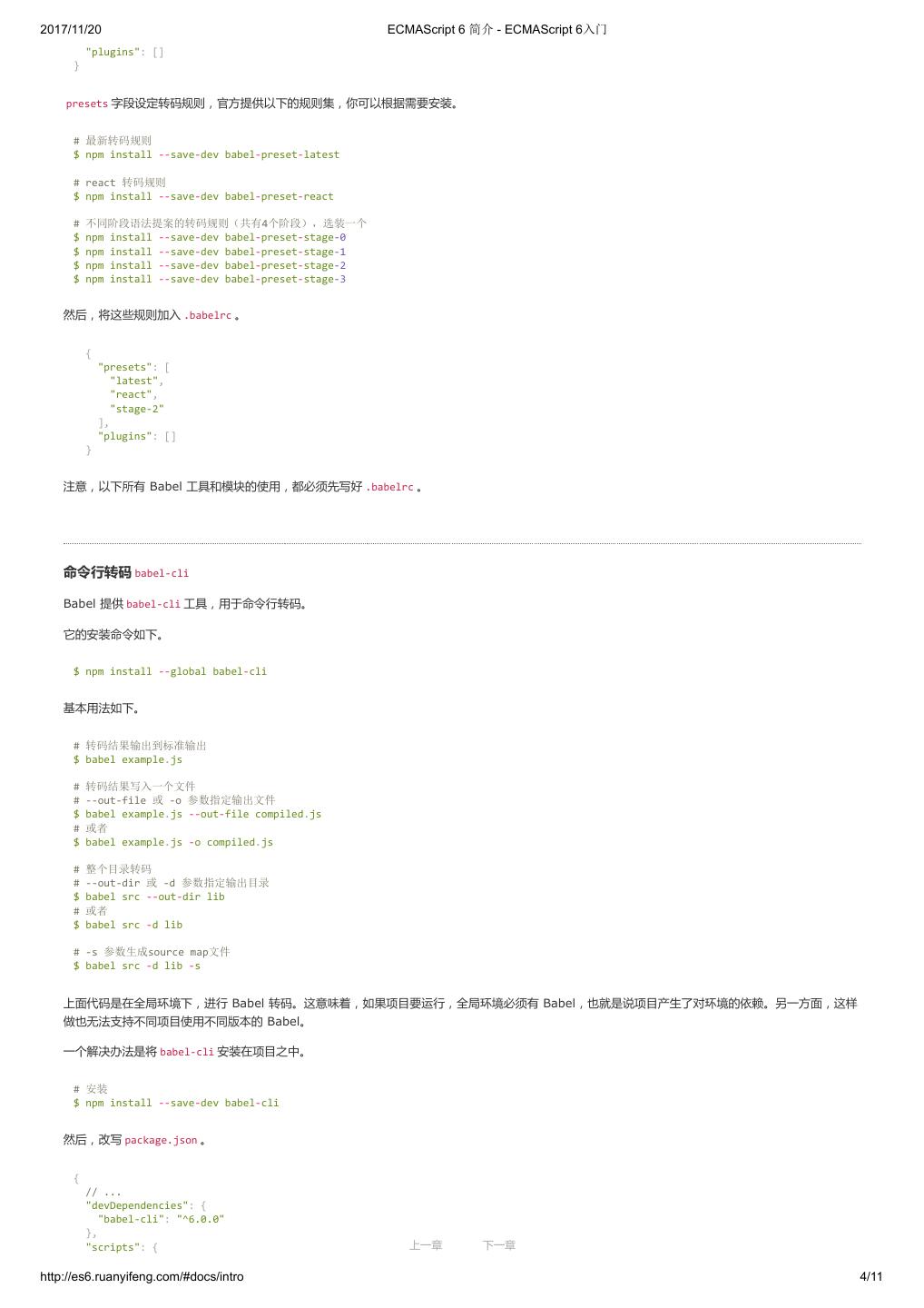 5 .2017/11/20 ECMAScript 6 简介 - ECMAScript 6入门 "plugins": [] } presets 字段设定转码规则,官方提供以下的规则集,你可以根据需要安装。 # 最新转码规则 $ npm install --save-dev babel-preset-latest # react 转码规则 $ npm install --save-dev babel-preset-react # 不同阶段语法提案的转码规则(共有4个阶段),选装一个 $ npm install --save-dev babel-preset-stage-0 $ npm install --save-dev babel-preset-stage-1 $ npm install --save-dev babel-preset-stage-2 $ npm install --save-dev babel-preset-stage-3 然后,将这些规则加入 .babelrc 。 { "presets": [ "latest", "react", "stage-2" ], "plugins": [] } 注意,以下所有 Babel 工具和模块的使用,都必须先写好 .babelrc 。 命令行转码 babel-cli Babel 提供 babel-cli 工具,用于命令行转码。 它的安装命令如下。 $ npm install --global babel-cli 基本用法如下。 # 转码结果输出到标准输出 $ babel example.js # 转码结果写入一个文件 # --out-file 或 -o 参数指定输出文件 $ babel example.js --out-file compiled.js # 或者 $ babel example.js -o compiled.js # 整个目录转码 # --out-dir 或 -d 参数指定输出目录 $ babel src --out-dir lib # 或者 $ babel src -d lib # -s 参数生成source map文件 $ babel src -d lib -s 上面代码是在全局环境下,进行 Babel 转码。这意味着,如果项目要运行,全局环境必须有 Babel,也就是说项目产生了对环境的依赖。另一方面,这样 做也无法支持不同项目使用不同版本的 Babel。 一个解决办法是将 babel-cli 安装在项目之中。 # 安装 $ npm install --save-dev babel-cli 然后,改写 package.json 。 { // ... "devDependencies": { "babel-cli": "^6.0.0" }, "scripts": { 上一章 下一章 http://es6.ruanyifeng.com/#docs/intro 4/11