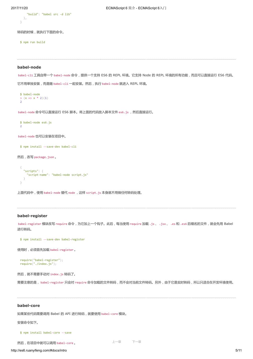 6 .2017/11/20 ECMAScript 6 简介 - ECMAScript 6入门 "build": "babel src -d lib" }, } 转码的时候,就执行下面的命令。 $ npm run build babel-node babel-cli 工具自带一个 babel-node 命令,提供一个支持 ES6 的 REPL 环境。它支持 Node 的 REPL 环境的所有功能,而且可以直接运行 ES6 代码。 它不用单独安装,而是随 babel-cli 一起安装。然后,执行 babel-node 就进入 REPL 环境。 $ babel-node > (x => x * 2)(1) 2 babel-node 命令可以直接运行 ES6 脚本。将上面的代码放入脚本文件 es6.js ,然后直接运行。 $ babel-node es6.js 2 babel-node 也可以安装在项目中。 $ npm install --save-dev babel-cli 然后,改写 package.json 。 { "scripts": { "script-name": "babel-node script.js" } } 上面代码中,使用 babel-node 替代 node ,这样 script.js 本身就不用做任何转码处理。 babel-register babel-register 模块改写 require 命令,为它加上一个钩子。此后,每当使用 require 加载 .js 、 .jsx 、 .es 和 .es6 后缀名的文件,就会先用 Babel 进行转码。 $ npm install --save-dev babel-register 使用时,必须首先加载 babel-register 。 require("babel-register"); require("./index.js"); 然后,就不需要手动对 index.js 转码了。 需要注意的是, babel-register 只会对 require 命令加载的文件转码,而不会对当前文件转码。另外,由于它是实时转码,所以只适合在开发环境使用。 babel-core 如果某些代码需要调用 Babel 的 API 进行转码,就要使用 babel-core 模块。 安装命令如下。 $ npm install babel-core --save 然后,在项目中就可以调用 babel-core 。 上一章 下一章 http://es6.ruanyifeng.com/#docs/intro 5/11