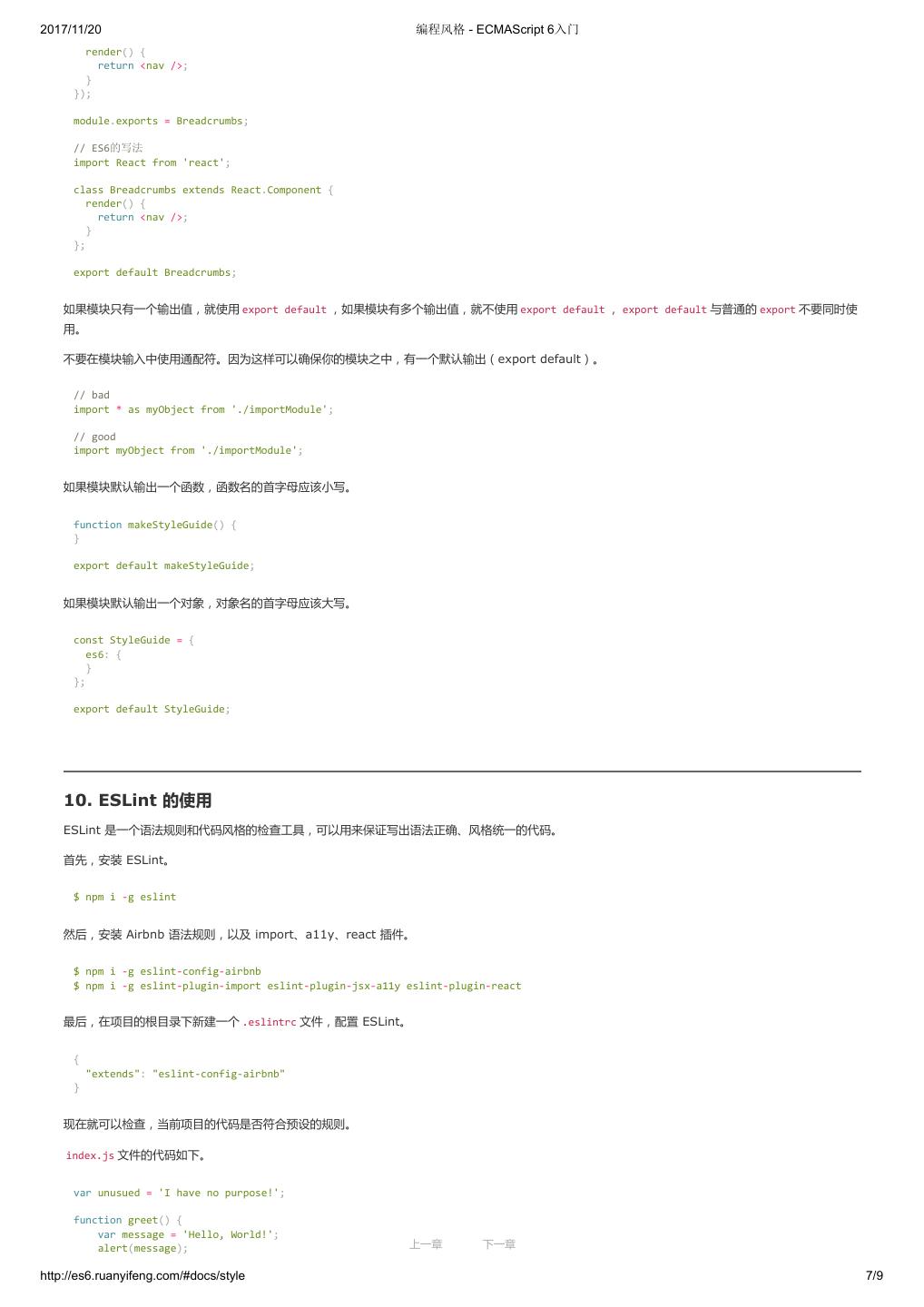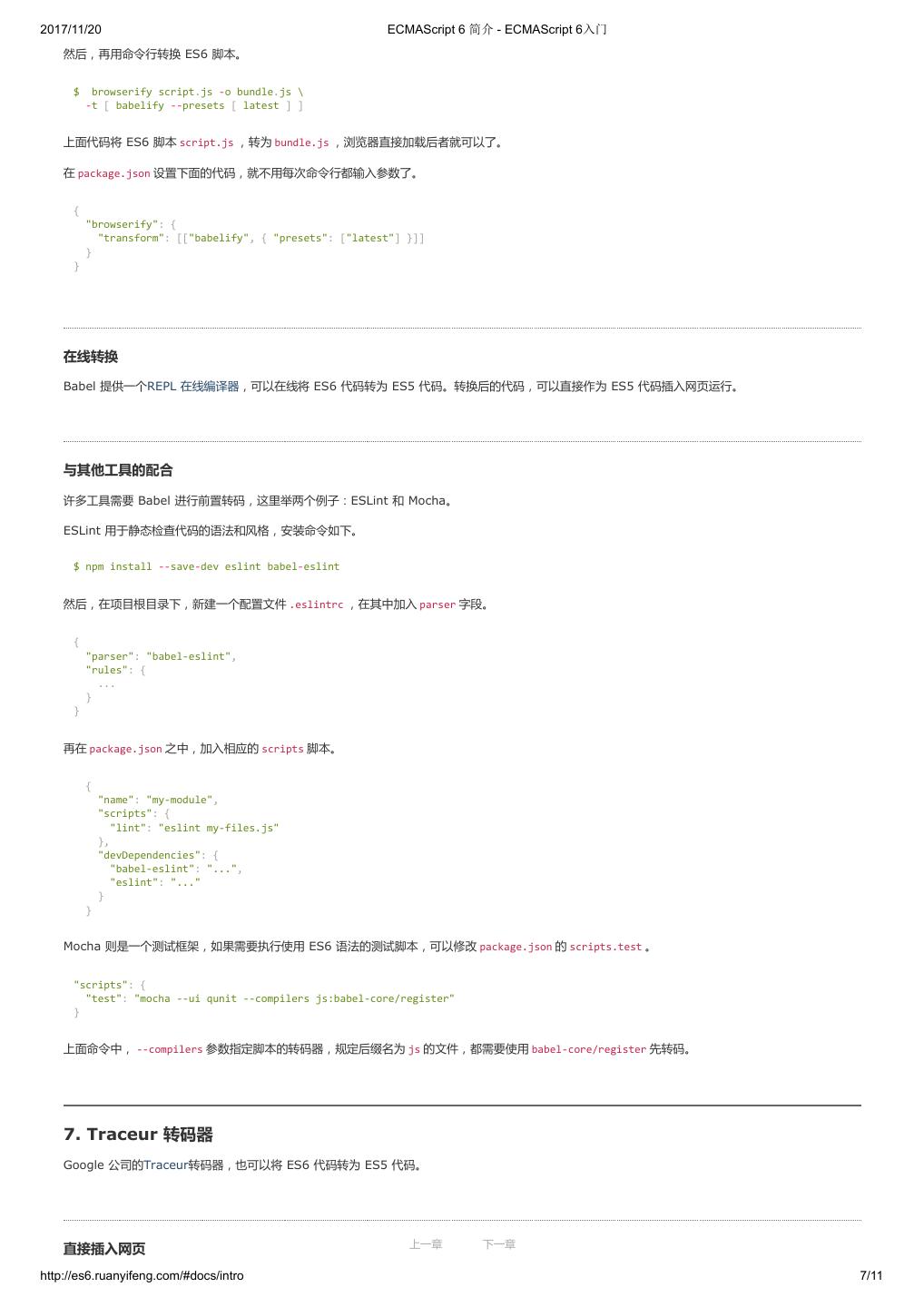 8 .2017/11/20 ECMAScript 6 简介 - ECMAScript 6入门 然后,再用命令行转换 ES6 脚本。 $ browserify script.js -o bundle.js \ -t [ babelify --presets [ latest ] ] 上面代码将 ES6 脚本 script.js ,转为 bundle.js ,浏览器直接加载后者就可以了。 在 package.json 设置下面的代码,就不用每次命令行都输入参数了。 { "browserify": { "transform": [["babelify", { "presets": ["latest"] }]] } } 在线转换 Babel 提供一个REPL 在线编译器,可以在线将 ES6 代码转为 ES5 代码。转换后的代码,可以直接作为 ES5 代码插入网页运行。 与其他工具的配合 许多工具需要 Babel 进行前置转码,这里举两个例子:ESLint 和 Mocha。 ESLint 用于静态检查代码的语法和风格,安装命令如下。 $ npm install --save-dev eslint babel-eslint 然后,在项目根目录下,新建一个配置文件 .eslintrc ,在其中加入 parser 字段。 { "parser": "babel-eslint", "rules": { ... } } 再在 package.json 之中,加入相应的 scripts 脚本。 { "name": "my-module", "scripts": { "lint": "eslint my-files.js" }, "devDependencies": { "babel-eslint": "...", "eslint": "..." } } Mocha 则是一个测试框架,如果需要执行使用 ES6 语法的测试脚本,可以修改 package.json 的 scripts.test 。 "scripts": { "test": "mocha --ui qunit --compilers js:babel-core/register" } 上面命令中, --compilers 参数指定脚本的转码器,规定后缀名为 js 的文件,都需要使用 babel-core/register 先转码。 7. Traceur 转码器 Google 公司的Traceur转码器,也可以将 ES6 代码转为 ES5 代码。 上一章 下一章 直接插入网页 http://es6.ruanyifeng.com/#docs/intro 7/11