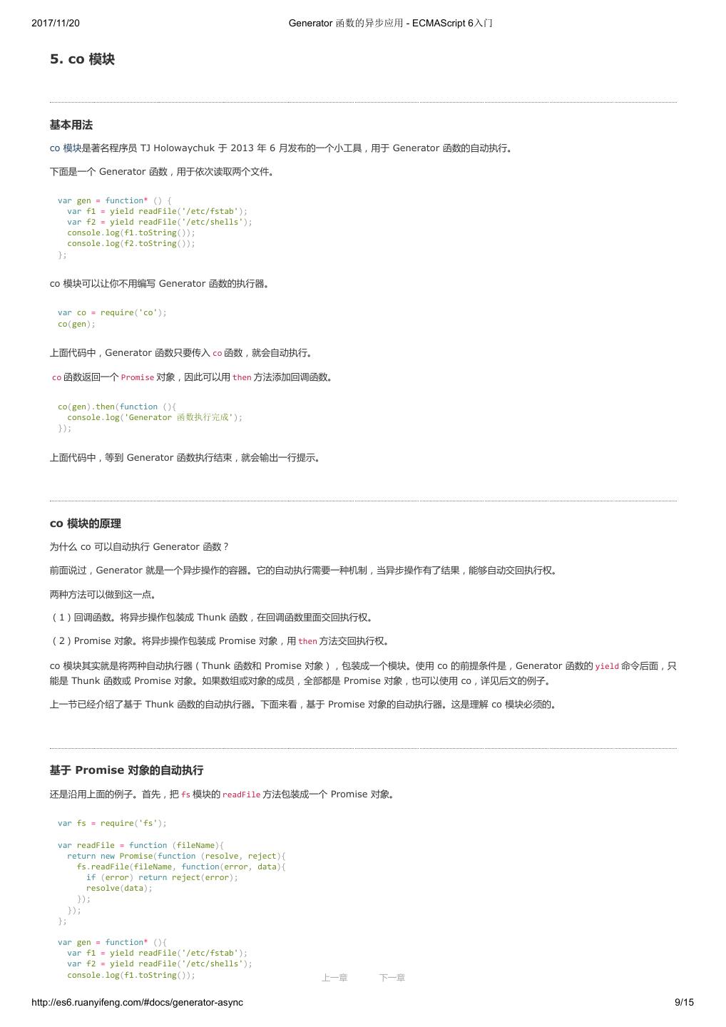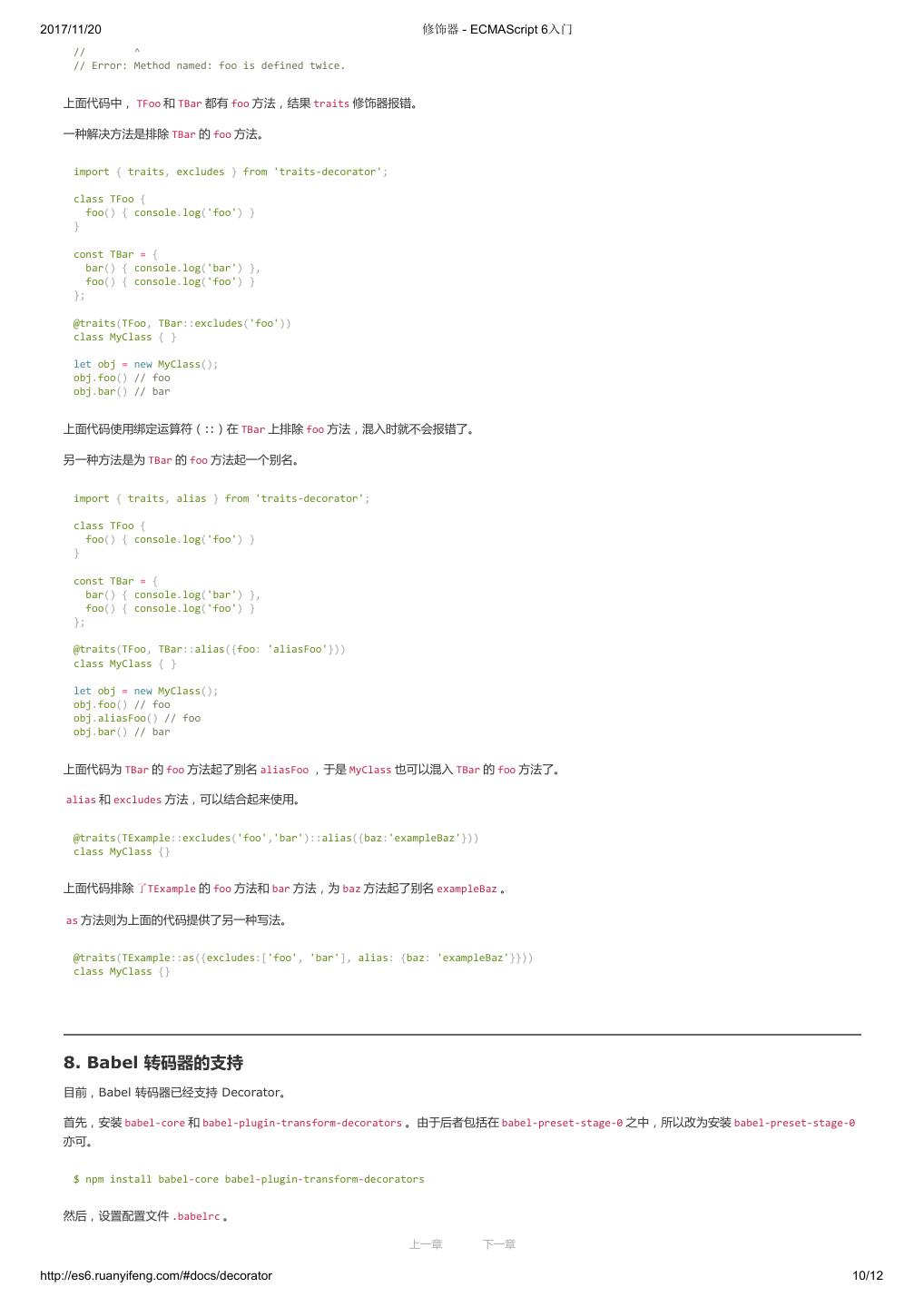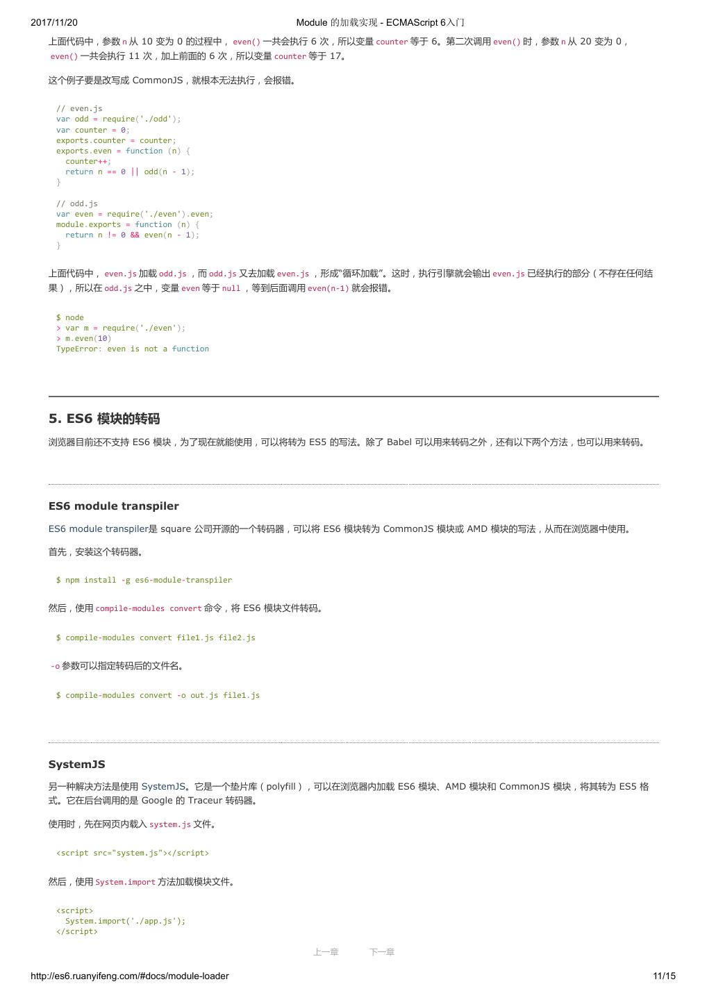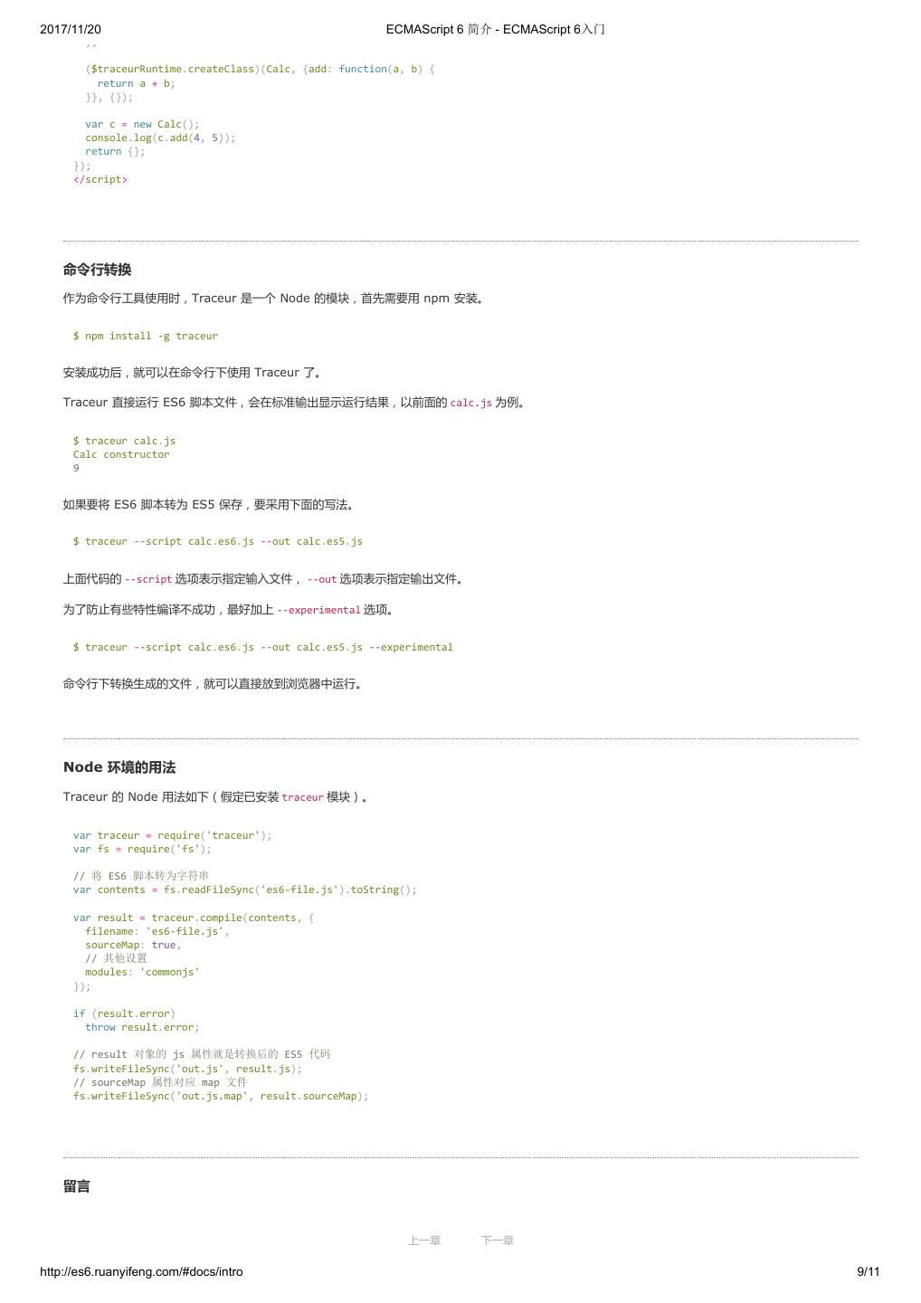 10 .2017/11/20 ECMAScript 6 简介 - ECMAScript 6入门 }; ($traceurRuntime.createClass)(Calc, {add: function(a, b) { return a + b; }}, {}); var c = new Calc(); console.log(c.add(4, 5)); return {}; }); </script> 命令行转换 作为命令行工具使用时,Traceur 是一个 Node 的模块,首先需要用 npm 安装。 $ npm install -g traceur 安装成功后,就可以在命令行下使用 Traceur 了。 Traceur 直接运行 ES6 脚本文件,会在标准输出显示运行结果,以前面的 calc.js 为例。 $ traceur calc.js Calc constructor 9 如果要将 ES6 脚本转为 ES5 保存,要采用下面的写法。 $ traceur --script calc.es6.js --out calc.es5.js 上面代码的 --script 选项表示指定输入文件, --out 选项表示指定输出文件。 为了防止有些特性编译不成功,最好加上 --experimental 选项。 $ traceur --script calc.es6.js --out calc.es5.js --experimental 命令行下转换生成的文件,就可以直接放到浏览器中运行。 Node 环境的用法 Traceur 的 Node 用法如下(假定已安装 traceur 模块)。 var traceur = require('traceur'); var fs = require('fs'); // 将 ES6 脚本转为字符串 var contents = fs.readFileSync('es6-file.js').toString(); var result = traceur.compile(contents, { filename: 'es6-file.js', sourceMap: true, // 其他设置 modules: 'commonjs' }); if (result.error) throw result.error; // result 对象的 js 属性就是转换后的 ES5 代码 fs.writeFileSync('out.js', result.js); // sourceMap 属性对应 map 文件 fs.writeFileSync('out.js.map', result.sourceMap); 留言 上一章 下一章 http://es6.ruanyifeng.com/#docs/intro 9/11