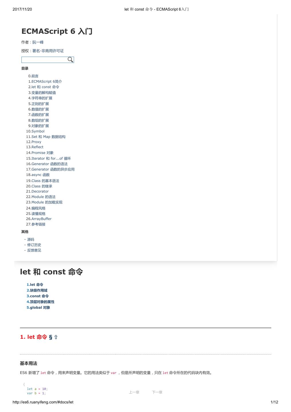 11 .2017/11/20 let 和 const 命令 - ECMAScript 6入门 ECMAScript 6 入门 作者:阮一峰 授权:署名-非商用许可证 目录 0.前言 1.ECMAScript 6简介 2.let 和 const 命令 3.变量的解构赋值 4.字符串的扩展 5.正则的扩展 6.数值的扩展 7.函数的扩展 8.数组的扩展 9.对象的扩展 10.Symbol 11.Set 和 Map 数据结构 12.Proxy 13.Reflect 14.Promise 对象 15.Iterator 和 for...of 循环 16.Generator 函数的语法 17.Generator 函数的异步应用 18.async 函数 19.Class 的基本语法 20.Class 的继承 21.Decorator 22.Module 的语法 23.Module 的加载实现 24.编程风格 25.读懂规格 26.ArrayBuffer 27.参考链接 其他 - 源码 - 修订历史 - 反馈意见 let 和 const 命令 1.let 命令 2.块级作用域 3.const 命令 4.顶层对象的属性 5.global 对象 1. let 命令 § ⇧ 基本用法 ES6 新增了 let 命令,用来声明变量。它的用法类似于 var ,但是所声明的变量,只在 let 命令所在的代码块内有效。 { let a = 10; var b = 1; 上一章 下一章 http://es6.ruanyifeng.com/#docs/let 1/12