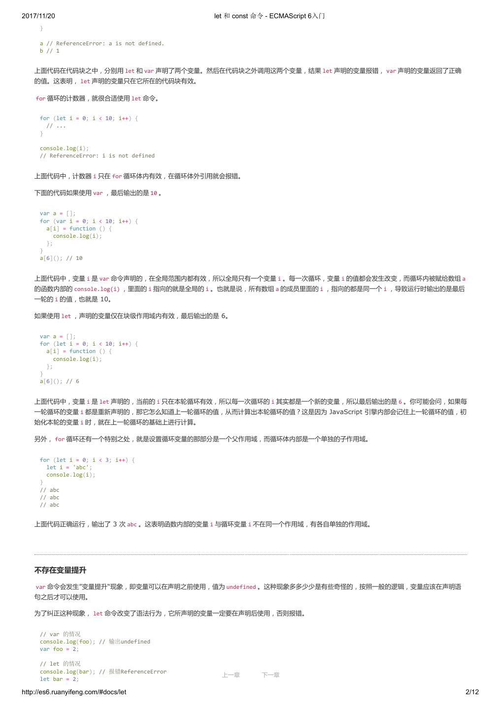 12 .2017/11/20 let 和 const 命令 - ECMAScript 6入门 } a // ReferenceError: a is not defined. b // 1 上面代码在代码块之中,分别用 let 和 var 声明了两个变量。然后在代码块之外调用这两个变量,结果 let 声明的变量报错, var 声明的变量返回了正确 的值。这表明, let 声明的变量只在它所在的代码块有效。 for 循环的计数器,就很合适使用 let 命令。 for (let i = 0; i < 10; i++) { // ... } console.log(i); // ReferenceError: i is not defined 上面代码中,计数器 i 只在 for 循环体内有效,在循环体外引用就会报错。 下面的代码如果使用 var ,最后输出的是 10 。 var a = []; for (var i = 0; i < 10; i++) { a[i] = function () { console.log(i); }; } a[6](); // 10 上面代码中,变量 i 是 var 命令声明的,在全局范围内都有效,所以全局只有一个变量 i 。每一次循环,变量 i 的值都会发生改变,而循环内被赋给数组 a 的函数内部的 console.log(i) ,里面的 i 指向的就是全局的 i 。也就是说,所有数组 a 的成员里面的 i ,指向的都是同一个 i ,导致运行时输出的是最后 一轮的 i 的值,也就是 10。 如果使用 let ,声明的变量仅在块级作用域内有效,最后输出的是 6。 var a = []; for (let i = 0; i < 10; i++) { a[i] = function () { console.log(i); }; } a[6](); // 6 上面代码中,变量 i 是 let 声明的,当前的 i 只在本轮循环有效,所以每一次循环的 i 其实都是一个新的变量,所以最后输出的是 6 。你可能会问,如果每 一轮循环的变量 i 都是重新声明的,那它怎么知道上一轮循环的值,从而计算出本轮循环的值?这是因为 JavaScript 引擎内部会记住上一轮循环的值,初 始化本轮的变量 i 时,就在上一轮循环的基础上进行计算。 另外, for 循环还有一个特别之处,就是设置循环变量的那部分是一个父作用域,而循环体内部是一个单独的子作用域。 for (let i = 0; i < 3; i++) { let i = 'abc'; console.log(i); } // abc // abc // abc 上面代码正确运行,输出了 3 次 abc 。这表明函数内部的变量 i 与循环变量 i 不在同一个作用域,有各自单独的作用域。 不存在变量提升 var 命令会发生”变量提升“现象,即变量可以在声明之前使用,值为 undefined 。这种现象多多少少是有些奇怪的,按照一般的逻辑,变量应该在声明语 句之后才可以使用。 为了纠正这种现象, let 命令改变了语法行为,它所声明的变量一定要在声明后使用,否则报错。 // var 的情况 console.log(foo); // 输出undefined var foo = 2; // let 的情况 console.log(bar); // 报错ReferenceError 上一章 下一章 let bar = 2; http://es6.ruanyifeng.com/#docs/let 2/12