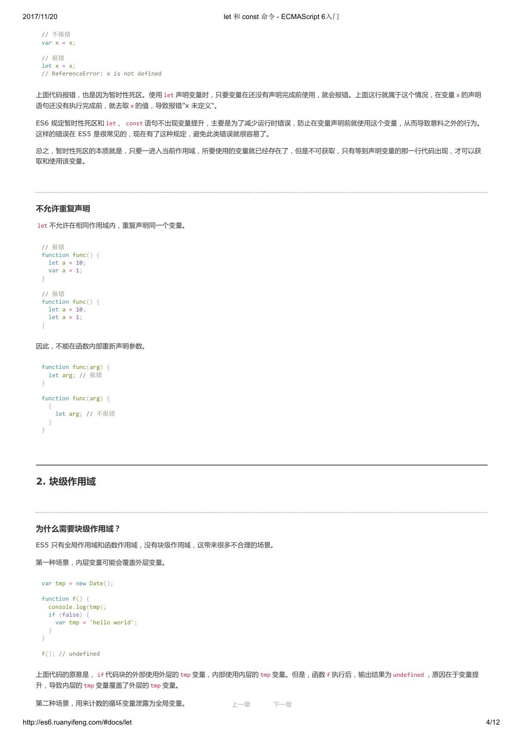 13 .2017/11/20 let 和 const 命令 - ECMAScript 6入门 上面代码中,变量 foo 用 var 命令声明,会发生变量提升,即脚本开始运行时,变量 foo 已经存在了,但是没有值,所以会输出 undefined 。变量 bar 用 let 命令声明,不会发生变量提升。这表示在声明它之前,变量 bar 是不存在的,这时如果用到它,就会抛出一个错误。 暂时性死区 只要块级作用域内存在 let 命令,它所声明的变量就“绑定”(binding)这个区域,不再受外部的影响。 var tmp = 123; if (true) { tmp = 'abc'; // ReferenceError let tmp; } 上面代码中,存在全局变量 tmp ,但是块级作用域内 let 又声明了一个局部变量 tmp ,导致后者绑定这个块级作用域,所以在 let 声明变量前,对 tmp 赋 值会报错。 ES6 明确规定,如果区块中存在 let 和 const 命令,这个区块对这些命令声明的变量,从一开始就形成了封闭作用域。凡是在声明之前就使用这些变量, 就会报错。 总之,在代码块内,使用 let 命令声明变量之前,该变量都是不可用的。这在语法上,称为“暂时性死区”(temporal dead zone,简称 TDZ)。 if (true) { // TDZ开始 tmp = 'abc'; // ReferenceError console.log(tmp); // ReferenceError let tmp; // TDZ结束 console.log(tmp); // undefined tmp = 123; console.log(tmp); // 123 } 上面代码中,在 let 命令声明变量 tmp 之前,都属于变量 tmp 的“死区”。 “暂时性死区”也意味着 typeof 不再是一个百分之百安全的操作。 typeof x; // ReferenceError let x; 上面代码中,变量 x 使用 let 命令声明,所以在声明之前,都属于 x 的“死区”,只要用到该变量就会报错。因此, typeof 运行时就会抛出一个 ReferenceError 。 作为比较,如果一个变量根本没有被声明,使用 typeof 反而不会报错。 typeof undeclared_variable // "undefined" 上面代码中, undeclared_variable 是一个不存在的变量名,结果返回“undefined”。所以,在没有 let 之前, typeof 运算符是百分之百安全的,永远不 会报错。现在这一点不成立了。这样的设计是为了让大家养成良好的编程习惯,变量一定要在声明之后使用,否则就报错。 有些“死区”比较隐蔽,不太容易发现。 function bar(x = y, y = 2) { return [x, y]; } bar(); // 报错 上面代码中,调用 bar 函数之所以报错(某些实现可能不报错),是因为参数 x 默认值等于另一个参数 y ,而此时 y 还没有声明,属于”死区“。如果 y 的默 认值是 x ,就不会报错,因为此时 x 已经声明了。 function bar(x = 2, y = x) { return [x, y]; } bar(); // [2, 2] 另外,下面的代码也会报错,与 var 的行为不同。 上一章 下一章 http://es6.ruanyifeng.com/#docs/let 3/12