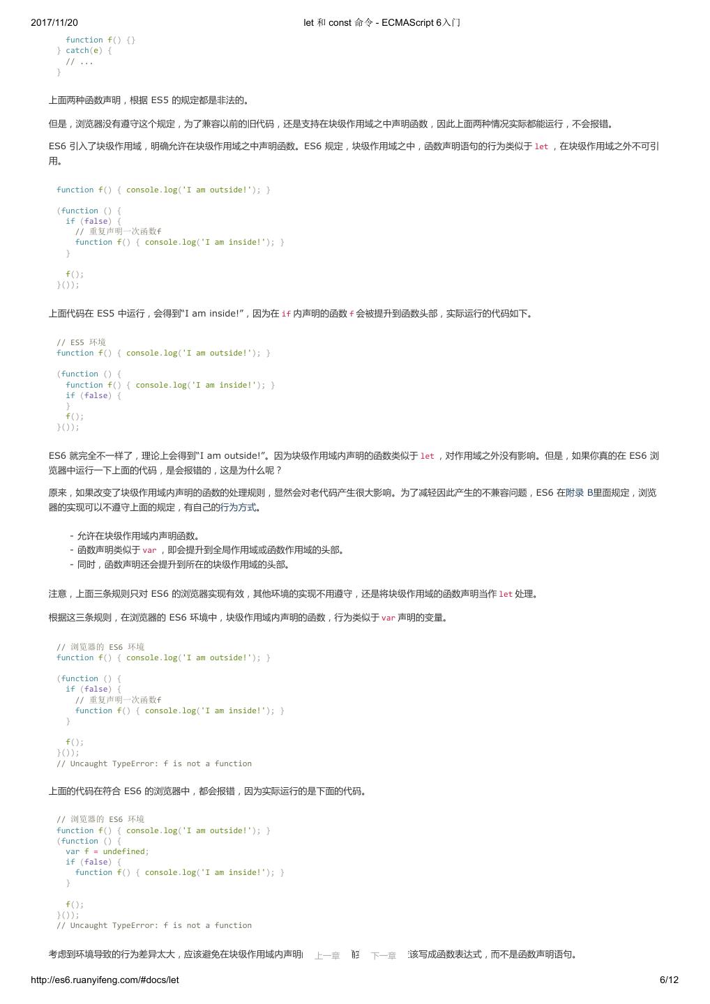 16 .2017/11/20 let 和 const 命令 - ECMAScript 6入门 function f() {} } catch(e) { // ... } 上面两种函数声明,根据 ES5 的规定都是非法的。 但是,浏览器没有遵守这个规定,为了兼容以前的旧代码,还是支持在块级作用域之中声明函数,因此上面两种情况实际都能运行,不会报错。 ES6 引入了块级作用域,明确允许在块级作用域之中声明函数。ES6 规定,块级作用域之中,函数声明语句的行为类似于 let ,在块级作用域之外不可引 用。 function f() { console.log('I am outside!'); } (function () { if (false) { // 重复声明一次函数f function f() { console.log('I am inside!'); } } f(); }()); 上面代码在 ES5 中运行,会得到“I am inside!”,因为在 if 内声明的函数 f 会被提升到函数头部,实际运行的代码如下。 // ES5 环境 function f() { console.log('I am outside!'); } (function () { function f() { console.log('I am inside!'); } if (false) { } f(); }()); ES6 就完全不一样了,理论上会得到“I am outside!”。因为块级作用域内声明的函数类似于 let ,对作用域之外没有影响。但是,如果你真的在 ES6 浏 览器中运行一下上面的代码,是会报错的,这是为什么呢? 原来,如果改变了块级作用域内声明的函数的处理规则,显然会对老代码产生很大影响。为了减轻因此产生的不兼容问题,ES6 在附录 B里面规定,浏览 器的实现可以不遵守上面的规定,有自己的行为方式。 - 允许在块级作用域内声明函数。 - 函数声明类似于 var ,即会提升到全局作用域或函数作用域的头部。 - 同时,函数声明还会提升到所在的块级作用域的头部。 注意,上面三条规则只对 ES6 的浏览器实现有效,其他环境的实现不用遵守,还是将块级作用域的函数声明当作 let 处理。 根据这三条规则,在浏览器的 ES6 环境中,块级作用域内声明的函数,行为类似于 var 声明的变量。 // 浏览器的 ES6 环境 function f() { console.log('I am outside!'); } (function () { if (false) { // 重复声明一次函数f function f() { console.log('I am inside!'); } } f(); }()); // Uncaught TypeError: f is not a function 上面的代码在符合 ES6 的浏览器中,都会报错,因为实际运行的是下面的代码。 // 浏览器的 ES6 环境 function f() { console.log('I am outside!'); } (function () { var f = undefined; if (false) { function f() { console.log('I am inside!'); } } f(); }()); // Uncaught TypeError: f is not a function 考虑到环境导致的行为差异太大,应该避免在块级作用域内声明函数。如果确实需要,也应该写成函数表达式,而不是函数声明语句。 上一章 下一章 http://es6.ruanyifeng.com/#docs/let 6/12