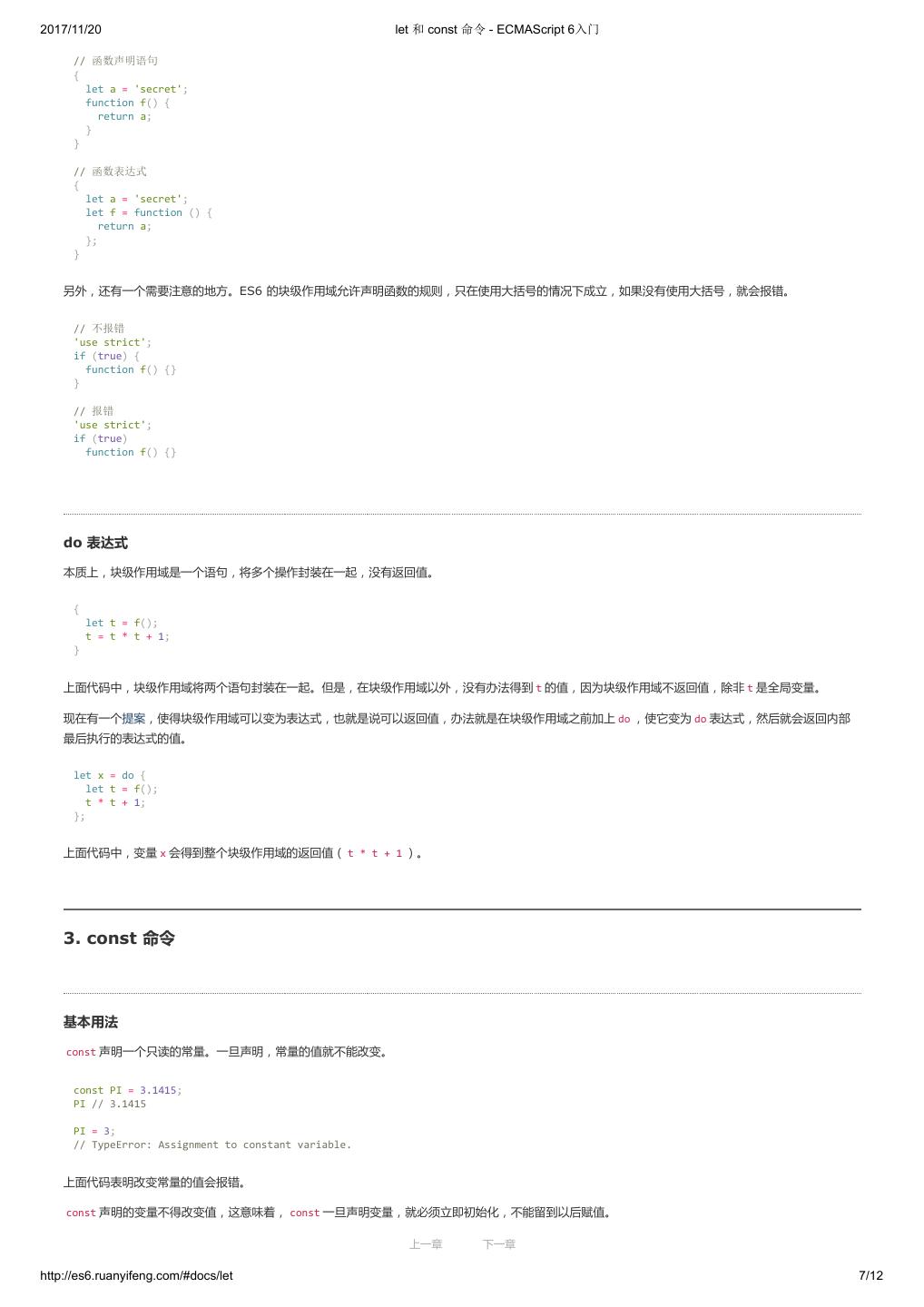 17 .2017/11/20 let 和 const 命令 - ECMAScript 6入门 // 函数声明语句 { let a = 'secret'; function f() { return a; } } // 函数表达式 { let a = 'secret'; let f = function () { return a; }; } 另外,还有一个需要注意的地方。ES6 的块级作用域允许声明函数的规则,只在使用大括号的情况下成立,如果没有使用大括号,就会报错。 // 不报错 'use strict'; if (true) { function f() {} } // 报错 'use strict'; if (true) function f() {} do 表达式 本质上,块级作用域是一个语句,将多个操作封装在一起,没有返回值。 { let t = f(); t = t * t + 1; } 上面代码中,块级作用域将两个语句封装在一起。但是,在块级作用域以外,没有办法得到 t 的值,因为块级作用域不返回值,除非 t 是全局变量。 现在有一个提案,使得块级作用域可以变为表达式,也就是说可以返回值,办法就是在块级作用域之前加上 do ,使它变为 do 表达式,然后就会返回内部 最后执行的表达式的值。 let x = do { let t = f(); t * t + 1; }; 上面代码中,变量 x 会得到整个块级作用域的返回值( t * t + 1 )。 3. const 命令 基本用法 const 声明一个只读的常量。一旦声明,常量的值就不能改变。 const PI = 3.1415; PI // 3.1415 PI = 3; // TypeError: Assignment to constant variable. 上面代码表明改变常量的值会报错。 const 声明的变量不得改变值,这意味着, const 一旦声明变量,就必须立即初始化,不能留到以后赋值。 上一章 下一章 http://es6.ruanyifeng.com/#docs/let 7/12
