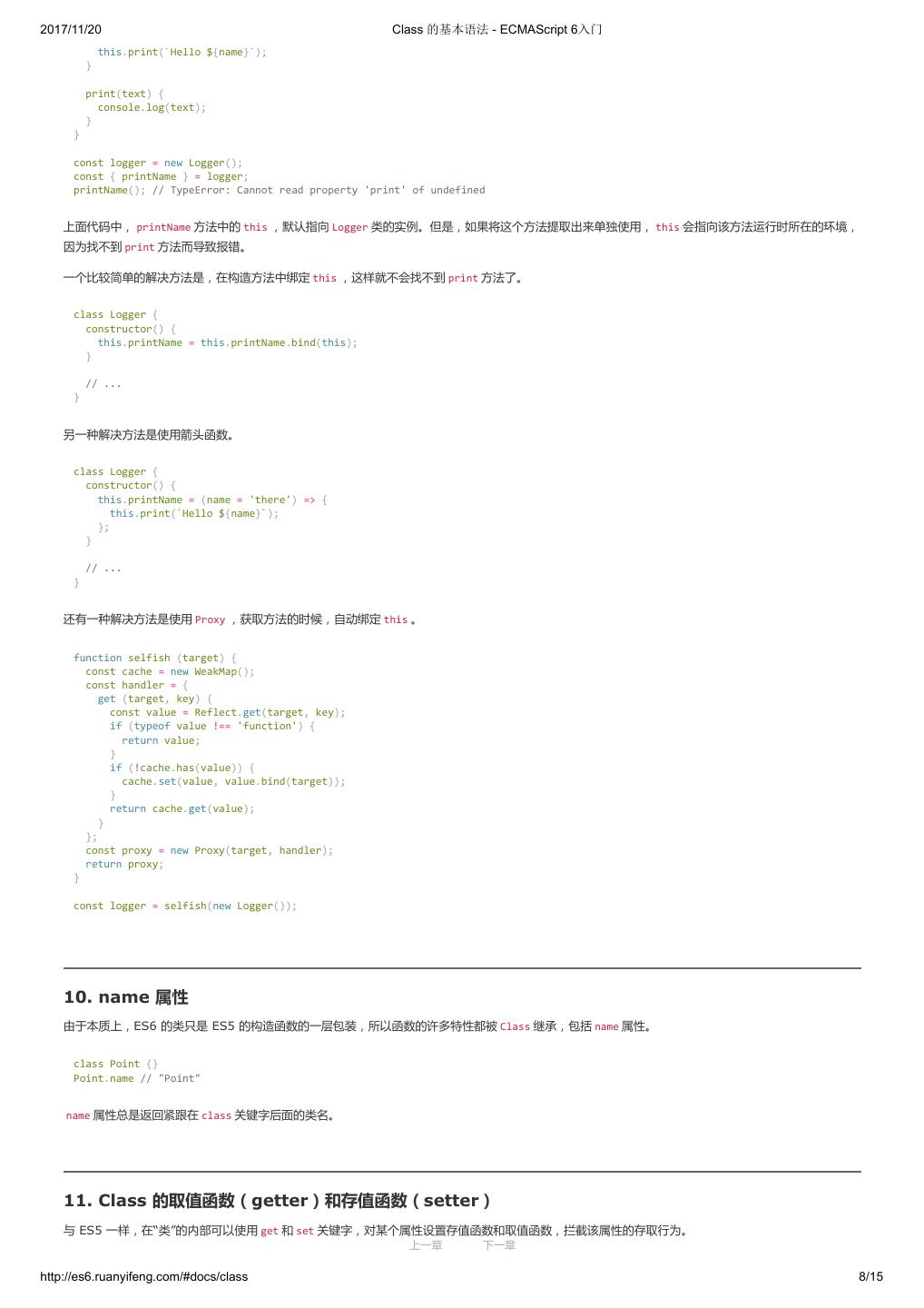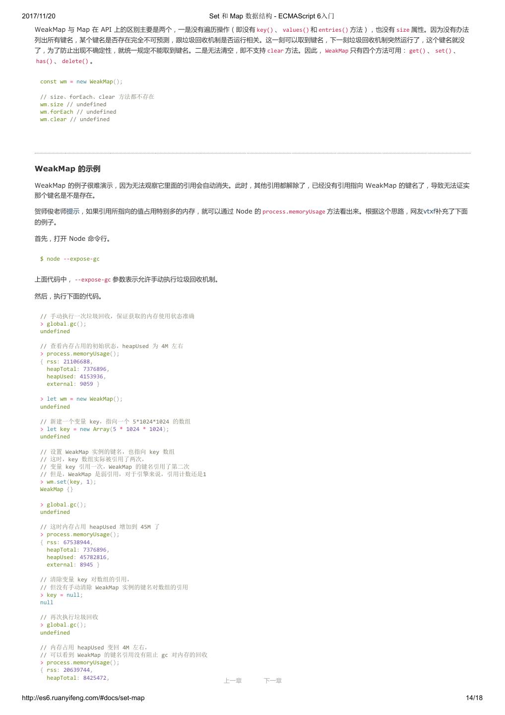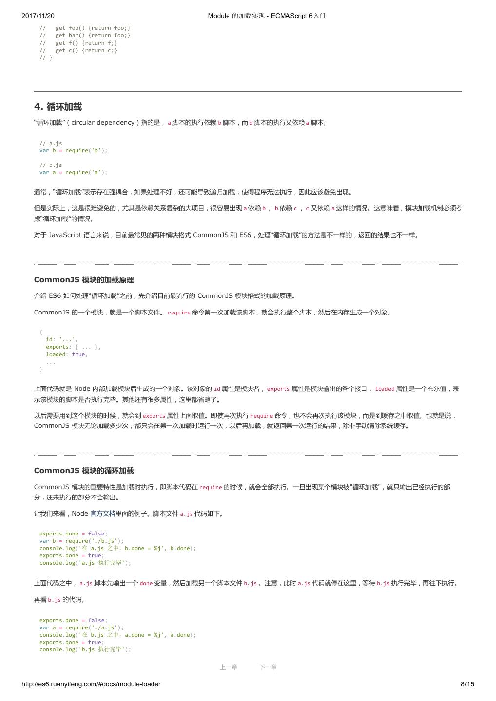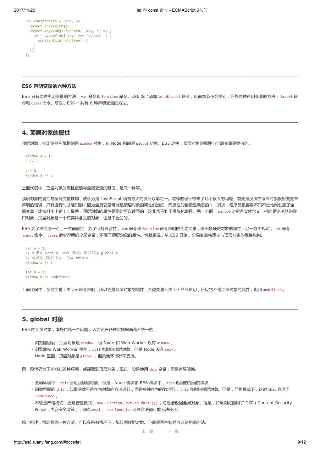19 .2017/11/20 let 和 const 命令 - ECMAScript 6入门 var constantize = (obj) => { Object.freeze(obj); Object.keys(obj).forEach( (key, i) => { if ( typeof obj[key] === 'object' ) { constantize( obj[key] ); } }); }; ES6 声明变量的六种方法 ES5 只有两种声明变量的方法: var 命令和 function 命令。ES6 除了添加 let 和 const 命令,后面章节还会提到,另外两种声明变量的方法: import 命 令和 class 命令。所以,ES6 一共有 6 种声明变量的方法。 4. 顶层对象的属性 顶层对象,在浏览器环境指的是 window 对象,在 Node 指的是 global 对象。ES5 之中,顶层对象的属性与全局变量是等价的。 window.a = 1; a // 1 a = 2; window.a // 2 上面代码中,顶层对象的属性赋值与全局变量的赋值,是同一件事。 顶层对象的属性与全局变量挂钩,被认为是 JavaScript 语言最大的设计败笔之一。这样的设计带来了几个很大的问题,首先是没法在编译时就报出变量未 声明的错误,只有运行时才能知道(因为全局变量可能是顶层对象的属性创造的,而属性的创造是动态的);其次,程序员很容易不知不觉地就创建了全 局变量(比如打字出错);最后,顶层对象的属性是到处可以读写的,这非常不利于模块化编程。另一方面, window 对象有实体含义,指的是浏览器的窗 口对象,顶层对象是一个有实体含义的对象,也是不合适的。 ES6 为了改变这一点,一方面规定,为了保持兼容性, var 命令和 function 命令声明的全局变量,依旧是顶层对象的属性;另一方面规定, let 命令、 const 命令、 class 命令声明的全局变量,不属于顶层对象的属性。也就是说,从 ES6 开始,全局变量将逐步与顶层对象的属性脱钩。 var a = 1; // 如果在 Node 的 REPL 环境,可以写成 global.a // 或者采用通用方法,写成 this.a window.a // 1 let b = 1; window.b // undefined 上面代码中,全局变量 a 由 var 命令声明,所以它是顶层对象的属性;全局变量 b 由 let 命令声明,所以它不是顶层对象的属性,返回 undefined 。 5. global 对象 ES5 的顶层对象,本身也是一个问题,因为它在各种实现里面是不统一的。 - 浏览器里面,顶层对象是 window ,但 Node 和 Web Worker 没有 window 。 - 浏览器和 Web Worker 里面, self 也指向顶层对象,但是 Node 没有 self 。 - Node 里面,顶层对象是 global ,但其他环境都不支持。 同一段代码为了能够在各种环境,都能取到顶层对象,现在一般是使用 this 变量,但是有局限性。 - 全局环境中, this 会返回顶层对象。但是,Node 模块和 ES6 模块中, this 返回的是当前模块。 - 函数里面的 this ,如果函数不是作为对象的方法运行,而是单纯作为函数运行, this 会指向顶层对象。但是,严格模式下,这时 this 会返回 undefined 。 - 不管是严格模式,还是普通模式, new Function('return this')() ,总是会返回全局对象。但是,如果浏览器用了 CSP(Content Security Policy,内容安全政策),那么 eval 、 new Function 这些方法都可能无法使用。 综上所述,很难找到一种方法,可以在所有情况下,都取到顶层对象。下面是两种勉强可以使用的方法。 上一章 下一章 http://es6.ruanyifeng.com/#docs/let 9/12
