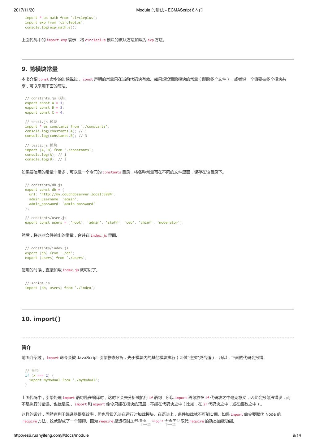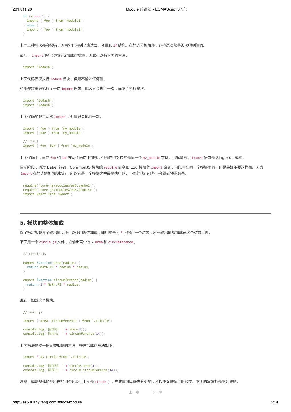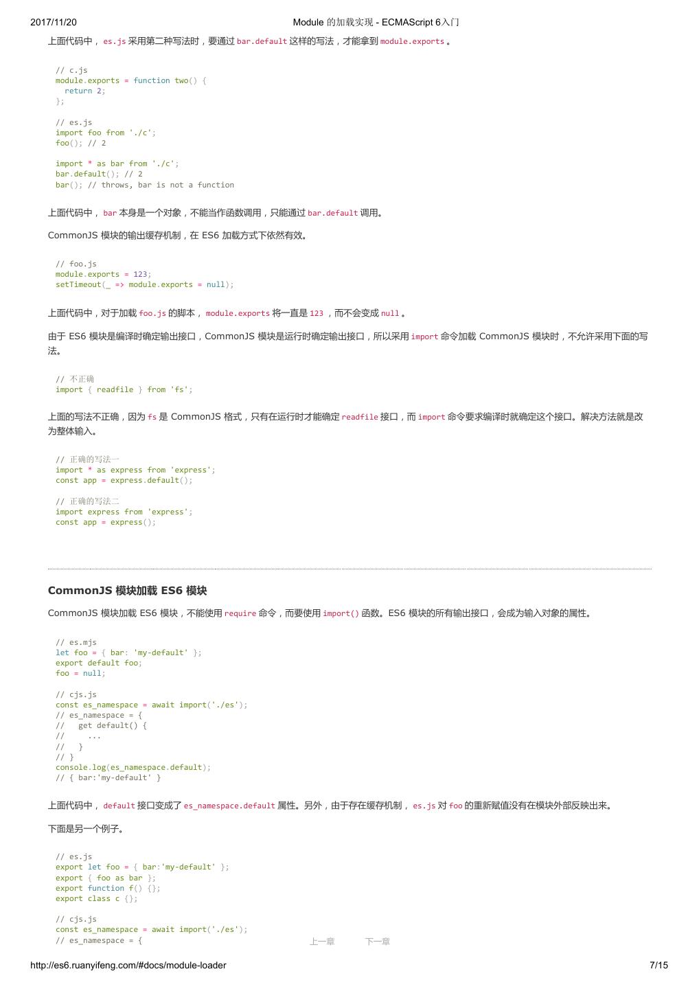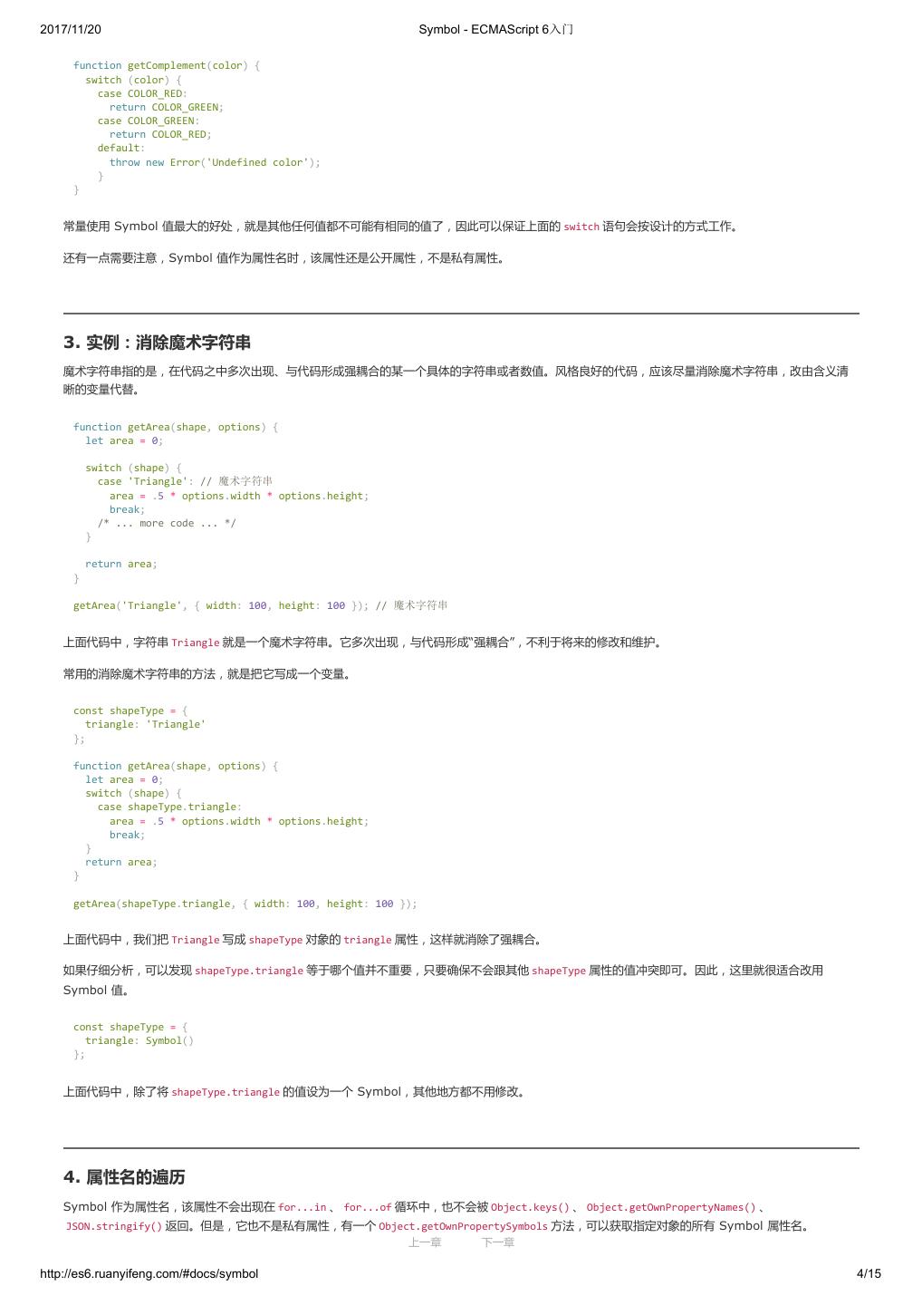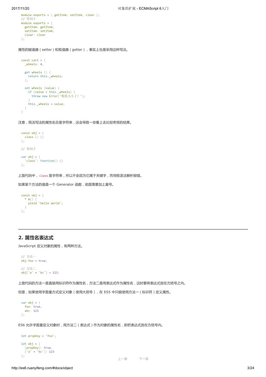 19 .2017/11/20 let 和 const 命令 - ECMAScript 6入门 var constantize = (obj) => { Object.freeze(obj); Object.keys(obj).forEach( (key, i) => { if ( typeof obj[key] === 'object' ) { constantize( obj[key] ); } }); }; ES6 声明变量的六种方法 ES5 只有两种声明变量的方法: var 命令和 function 命令。ES6 除了添加 let 和 const 命令,后面章节还会提到,另外两种声明变量的方法: import 命 令和 class 命令。所以,ES6 一共有 6 种声明变量的方法。 4. 顶层对象的属性 顶层对象,在浏览器环境指的是 window 对象,在 Node 指的是 global 对象。ES5 之中,顶层对象的属性与全局变量是等价的。 window.a = 1; a // 1 a = 2; window.a // 2 上面代码中,顶层对象的属性赋值与全局变量的赋值,是同一件事。 顶层对象的属性与全局变量挂钩,被认为是 JavaScript 语言最大的设计败笔之一。这样的设计带来了几个很大的问题,首先是没法在编译时就报出变量未 声明的错误,只有运行时才能知道(因为全局变量可能是顶层对象的属性创造的,而属性的创造是动态的);其次,程序员很容易不知不觉地就创建了全 局变量(比如打字出错);最后,顶层对象的属性是到处可以读写的,这非常不利于模块化编程。另一方面, window 对象有实体含义,指的是浏览器的窗 口对象,顶层对象是一个有实体含义的对象,也是不合适的。 ES6 为了改变这一点,一方面规定,为了保持兼容性, var 命令和 function 命令声明的全局变量,依旧是顶层对象的属性;另一方面规定, let 命令、 const 命令、 class 命令声明的全局变量,不属于顶层对象的属性。也就是说,从 ES6 开始,全局变量将逐步与顶层对象的属性脱钩。 var a = 1; // 如果在 Node 的 REPL 环境,可以写成 global.a // 或者采用通用方法,写成 this.a window.a // 1 let b = 1; window.b // undefined 上面代码中,全局变量 a 由 var 命令声明,所以它是顶层对象的属性;全局变量 b 由 let 命令声明,所以它不是顶层对象的属性,返回 undefined 。 5. global 对象 ES5 的顶层对象,本身也是一个问题,因为它在各种实现里面是不统一的。 - 浏览器里面,顶层对象是 window ,但 Node 和 Web Worker 没有 window 。 - 浏览器和 Web Worker 里面, self 也指向顶层对象,但是 Node 没有 self 。 - Node 里面,顶层对象是 global ,但其他环境都不支持。 同一段代码为了能够在各种环境,都能取到顶层对象,现在一般是使用 this 变量,但是有局限性。 - 全局环境中, this 会返回顶层对象。但是,Node 模块和 ES6 模块中, this 返回的是当前模块。 - 函数里面的 this ,如果函数不是作为对象的方法运行,而是单纯作为函数运行, this 会指向顶层对象。但是,严格模式下,这时 this 会返回 undefined 。 - 不管是严格模式,还是普通模式, new Function('return this')() ,总是会返回全局对象。但是,如果浏览器用了 CSP(Content Security Policy,内容安全政策),那么 eval 、 new Function 这些方法都可能无法使用。 综上所述,很难找到一种方法,可以在所有情况下,都取到顶层对象。下面是两种勉强可以使用的方法。 上一章 下一章 http://es6.ruanyifeng.com/#docs/let 9/12