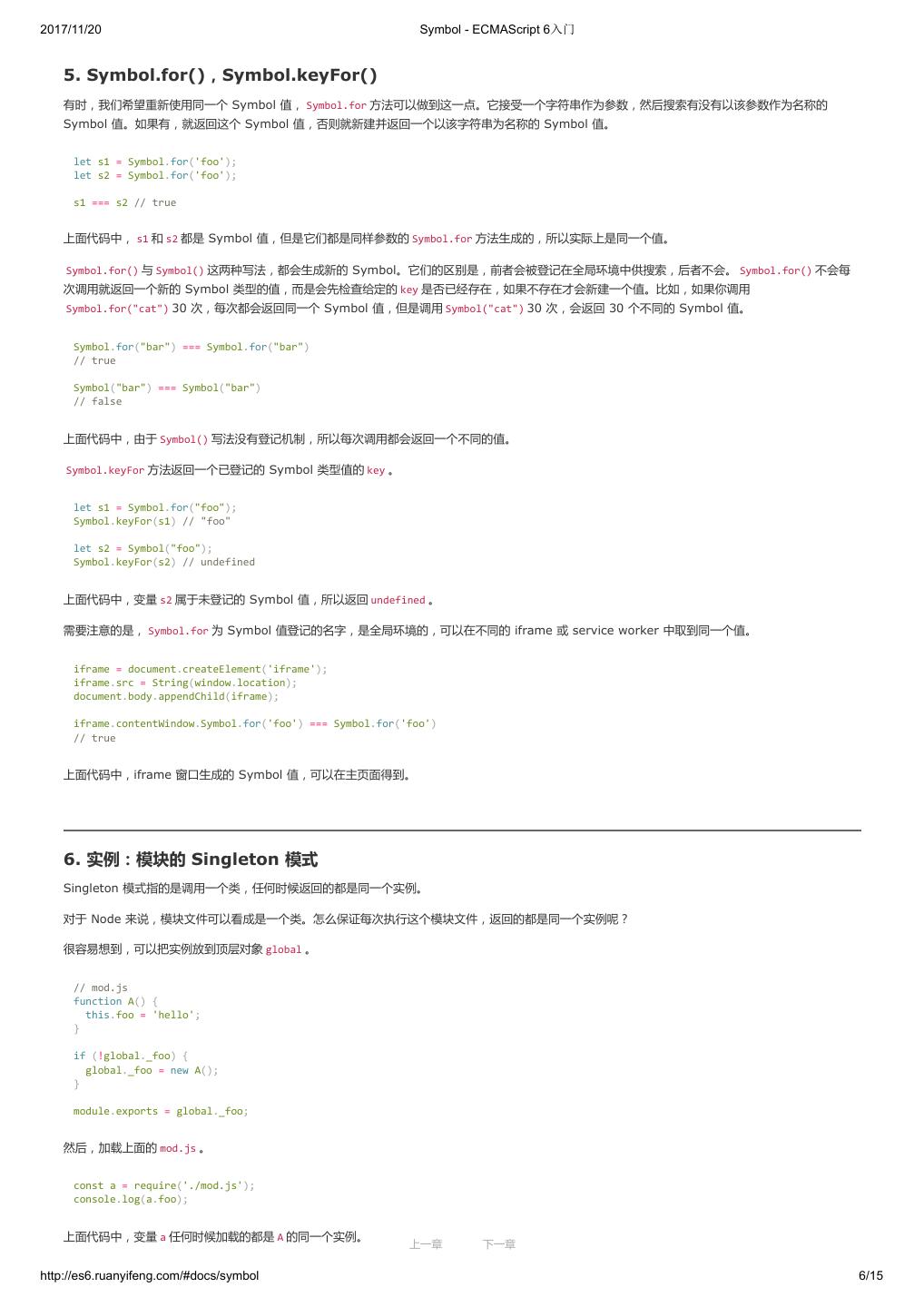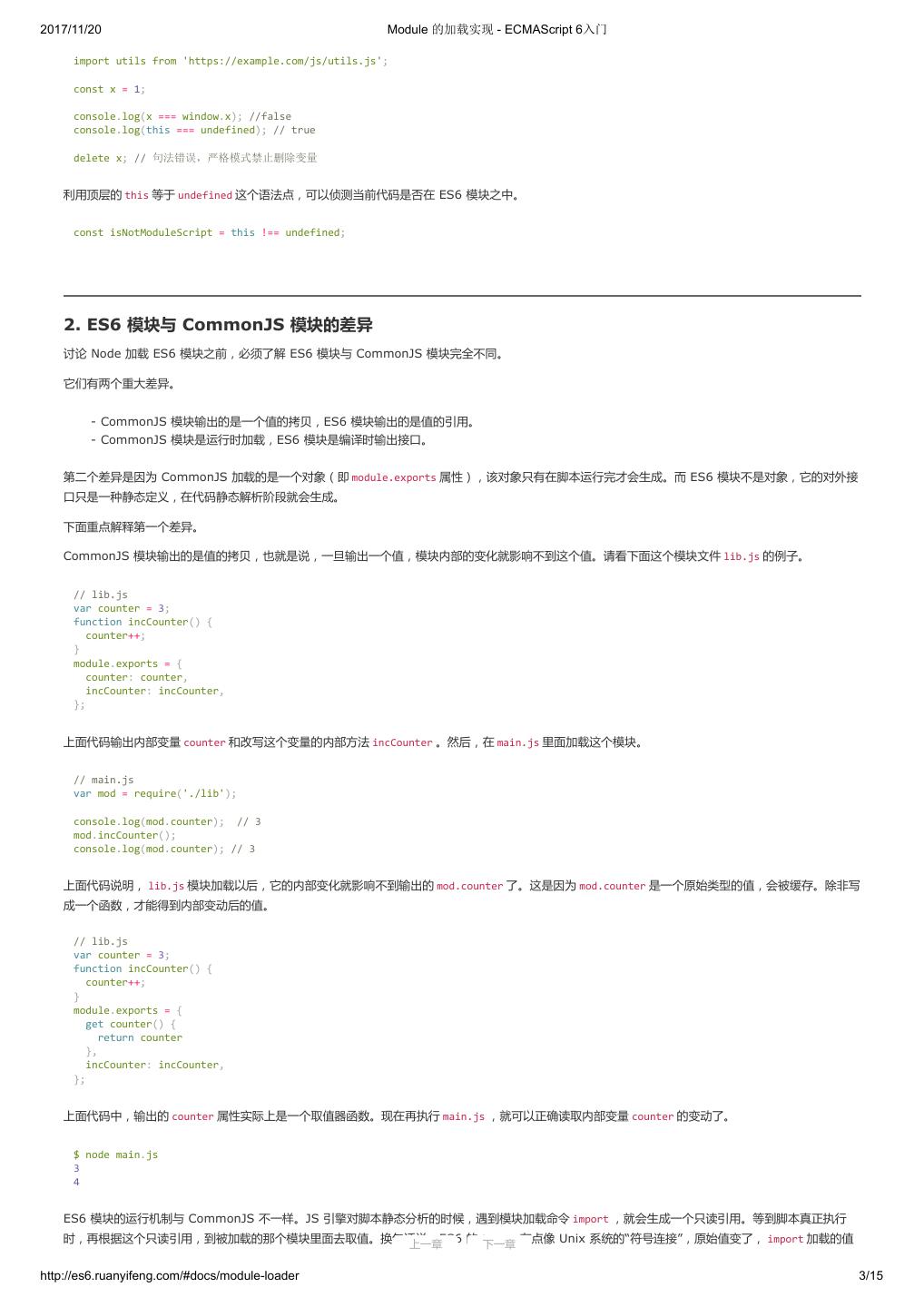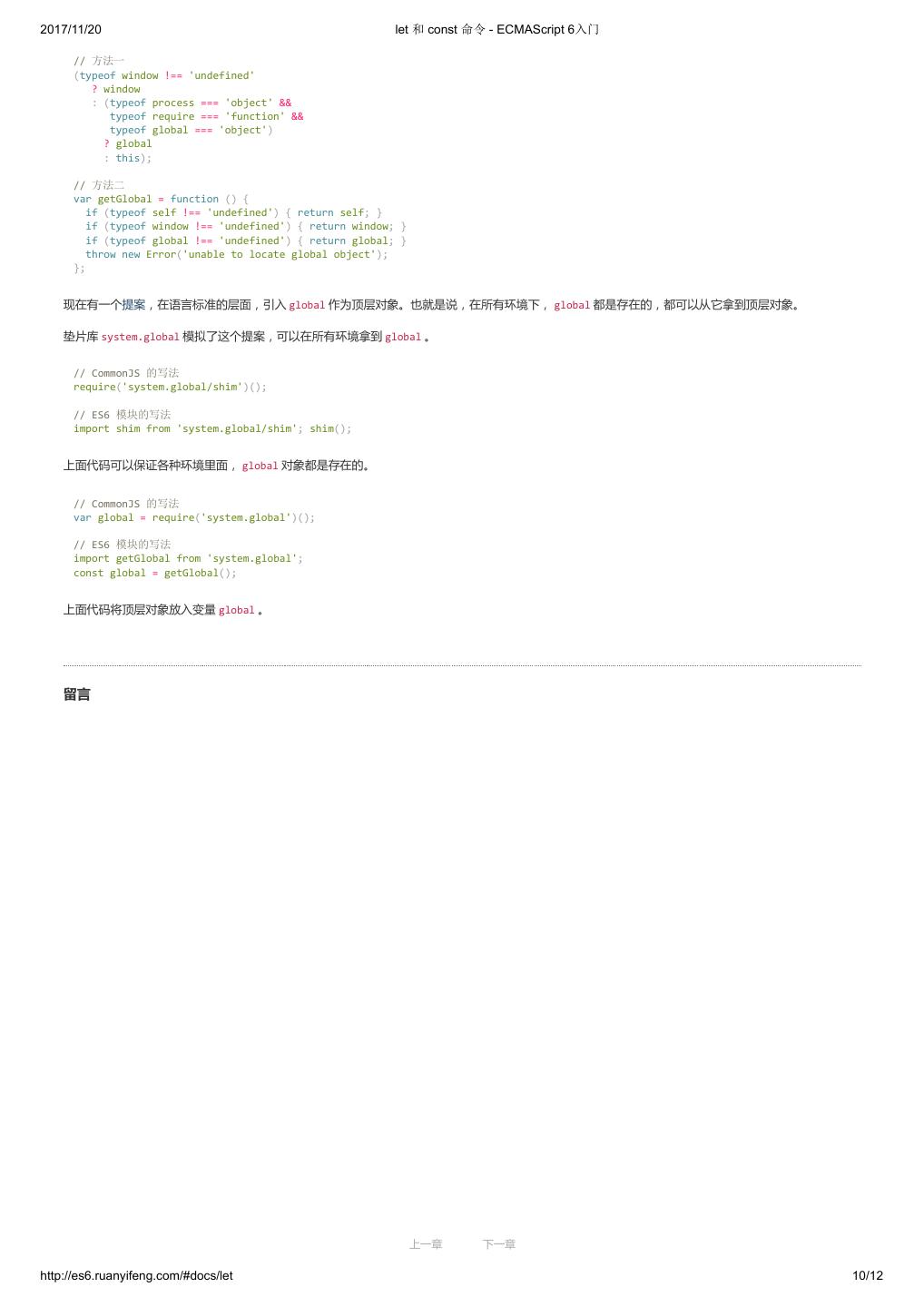 20 .2017/11/20 let 和 const 命令 - ECMAScript 6入门 // 方法一 (typeof window !== 'undefined' ? window : (typeof process === 'object' && typeof require === 'function' && typeof global === 'object') ? global : this); // 方法二 var getGlobal = function () { if (typeof self !== 'undefined') { return self; } if (typeof window !== 'undefined') { return window; } if (typeof global !== 'undefined') { return global; } throw new Error('unable to locate global object'); }; 现在有一个提案,在语言标准的层面,引入 global 作为顶层对象。也就是说,在所有环境下, global 都是存在的,都可以从它拿到顶层对象。 垫片库 system.global 模拟了这个提案,可以在所有环境拿到 global 。 // CommonJS 的写法 require('system.global/shim')(); // ES6 模块的写法 import shim from 'system.global/shim'; shim(); 上面代码可以保证各种环境里面, global 对象都是存在的。 // CommonJS 的写法 var global = require('system.global')(); // ES6 模块的写法 import getGlobal from 'system.global'; const global = getGlobal(); 上面代码将顶层对象放入变量 global 。 留言 上一章 下一章 http://es6.ruanyifeng.com/#docs/let 10/12