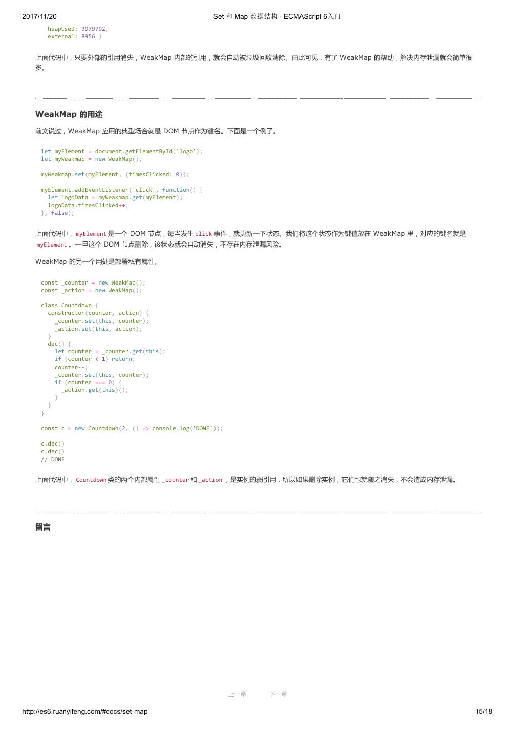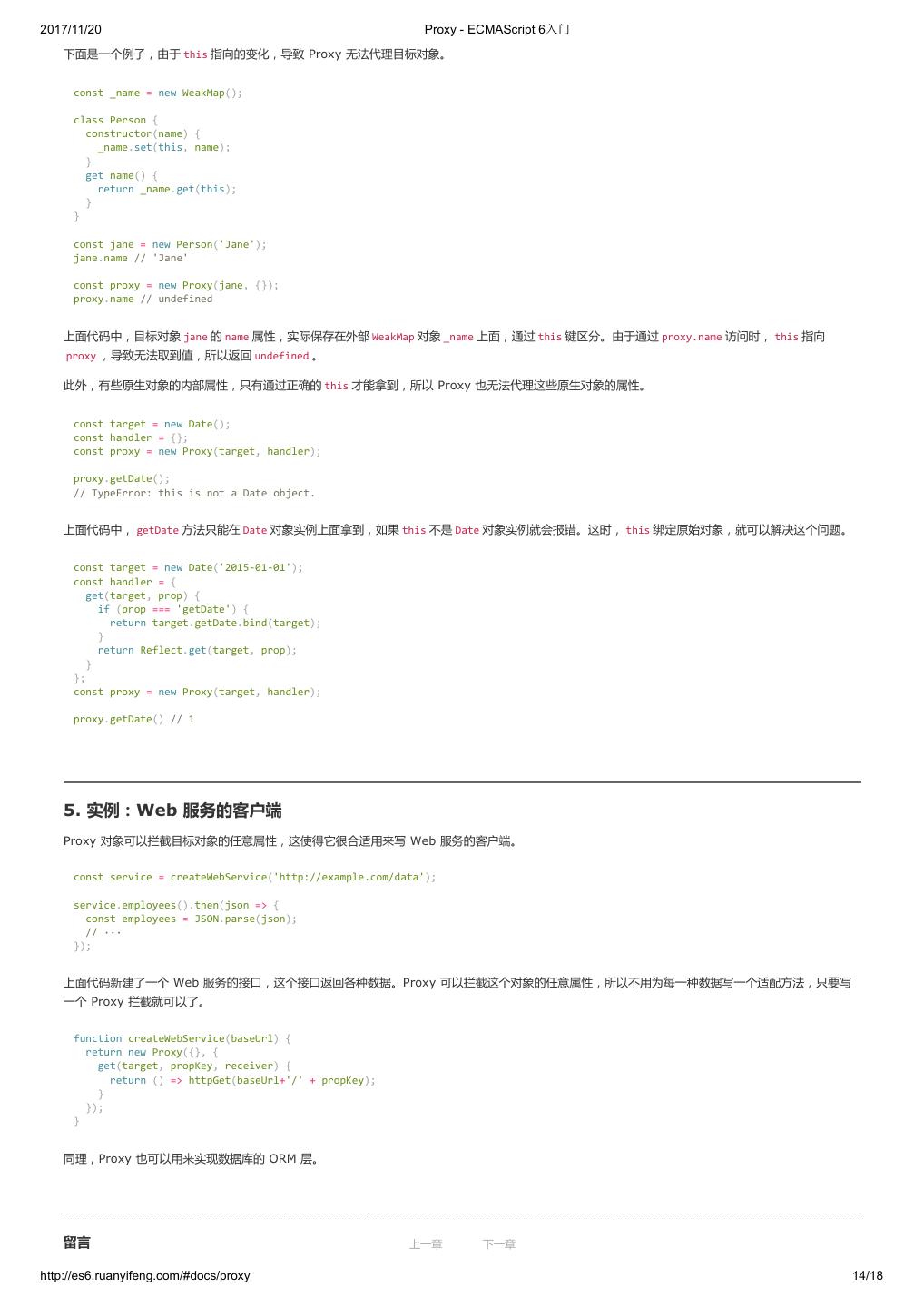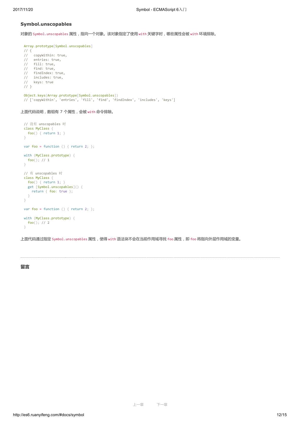 20 .2017/11/20 let 和 const 命令 - ECMAScript 6入门 // 方法一 (typeof window !== 'undefined' ? window : (typeof process === 'object' && typeof require === 'function' && typeof global === 'object') ? global : this); // 方法二 var getGlobal = function () { if (typeof self !== 'undefined') { return self; } if (typeof window !== 'undefined') { return window; } if (typeof global !== 'undefined') { return global; } throw new Error('unable to locate global object'); }; 现在有一个提案,在语言标准的层面,引入 global 作为顶层对象。也就是说,在所有环境下, global 都是存在的,都可以从它拿到顶层对象。 垫片库 system.global 模拟了这个提案,可以在所有环境拿到 global 。 // CommonJS 的写法 require('system.global/shim')(); // ES6 模块的写法 import shim from 'system.global/shim'; shim(); 上面代码可以保证各种环境里面, global 对象都是存在的。 // CommonJS 的写法 var global = require('system.global')(); // ES6 模块的写法 import getGlobal from 'system.global'; const global = getGlobal(); 上面代码将顶层对象放入变量 global 。 留言 上一章 下一章 http://es6.ruanyifeng.com/#docs/let 10/12
