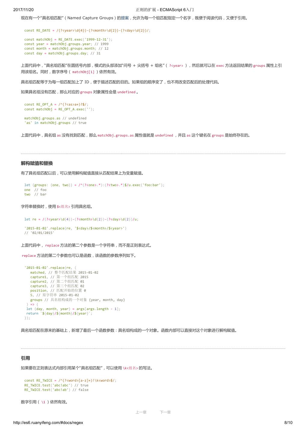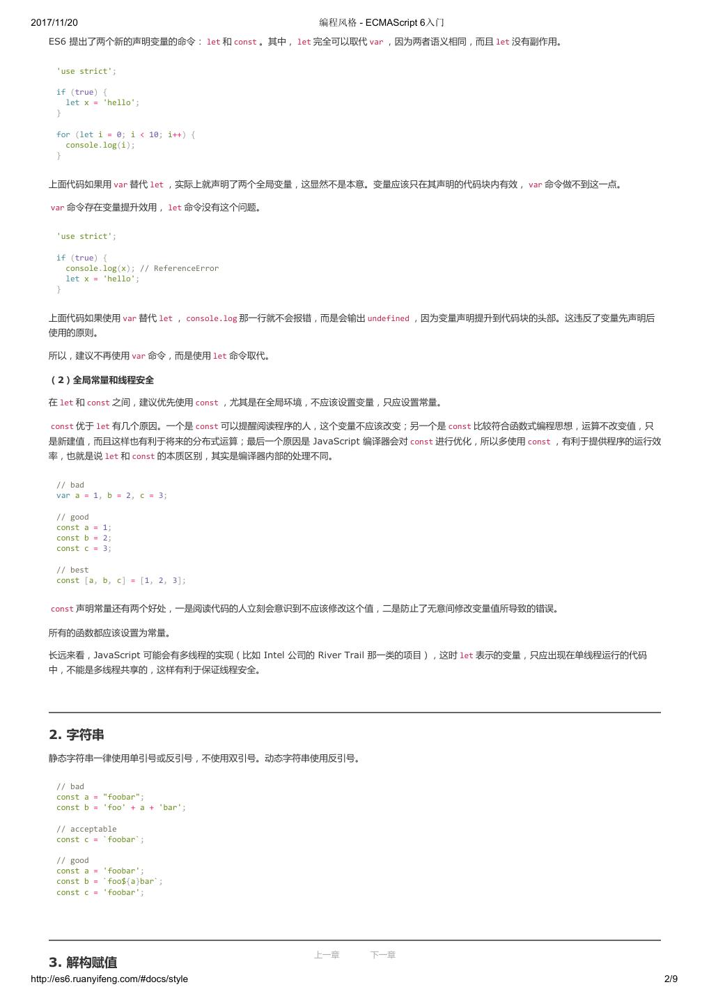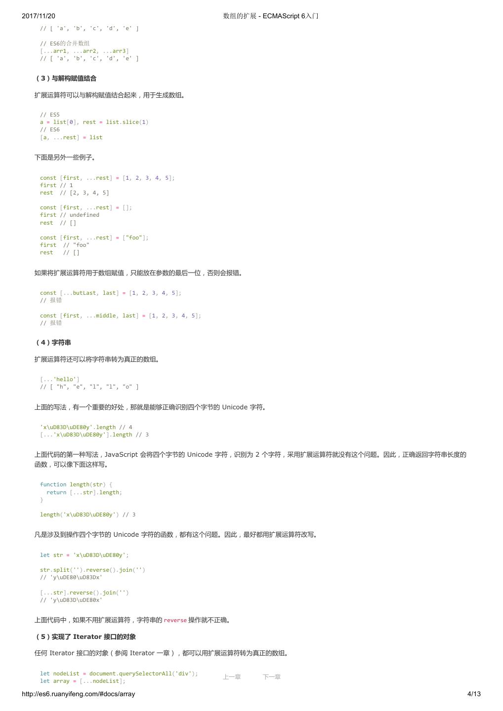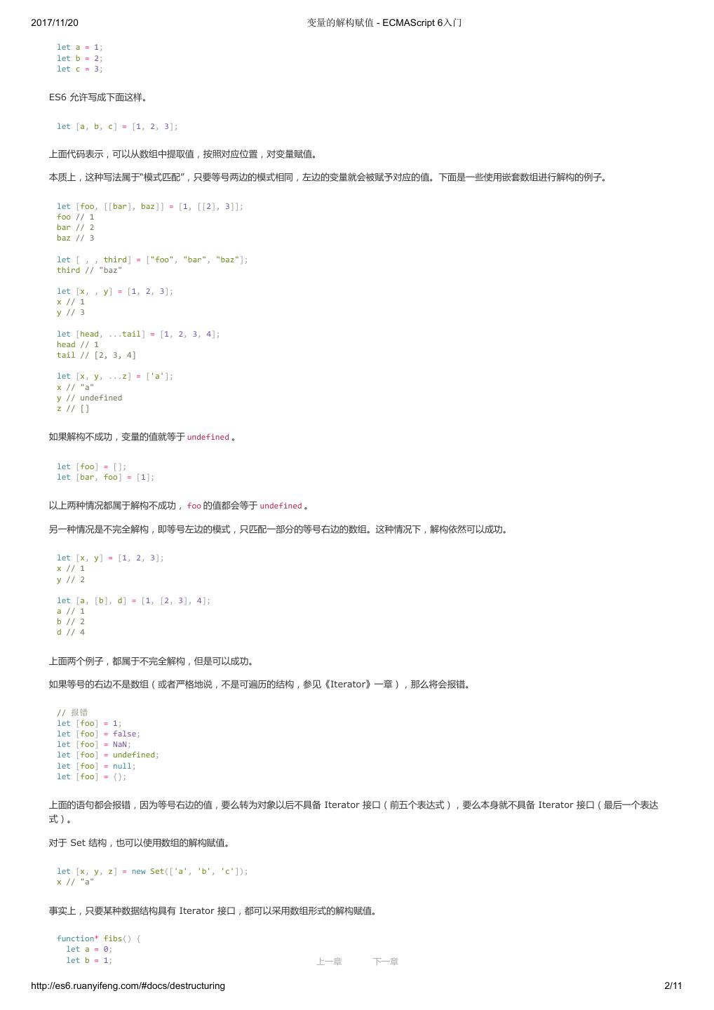 22 .2017/11/20 变量的解构赋值 - ECMAScript 6入门 let a = 1; let b = 2; let c = 3; ES6 允许写成下面这样。 let [a, b, c] = [1, 2, 3]; 上面代码表示,可以从数组中提取值,按照对应位置,对变量赋值。 本质上,这种写法属于“模式匹配”,只要等号两边的模式相同,左边的变量就会被赋予对应的值。下面是一些使用嵌套数组进行解构的例子。 let [foo, [[bar], baz]] = [1, [[2], 3]]; foo // 1 bar // 2 baz // 3 let [ , , third] = ["foo", "bar", "baz"]; third // "baz" let [x, , y] = [1, 2, 3]; x // 1 y // 3 let [head, ...tail] = [1, 2, 3, 4]; head // 1 tail // [2, 3, 4] let [x, y, ...z] = ['a']; x // "a" y // undefined z // [] 如果解构不成功,变量的值就等于 undefined 。 let [foo] = []; let [bar, foo] = [1]; 以上两种情况都属于解构不成功, foo 的值都会等于 undefined 。 另一种情况是不完全解构,即等号左边的模式,只匹配一部分的等号右边的数组。这种情况下,解构依然可以成功。 let [x, y] = [1, 2, 3]; x // 1 y // 2 let [a, [b], d] = [1, [2, 3], 4]; a // 1 b // 2 d // 4 上面两个例子,都属于不完全解构,但是可以成功。 如果等号的右边不是数组(或者严格地说,不是可遍历的结构,参见《Iterator》一章),那么将会报错。 // 报错 let [foo] = 1; let [foo] = false; let [foo] = NaN; let [foo] = undefined; let [foo] = null; let [foo] = {}; 上面的语句都会报错,因为等号右边的值,要么转为对象以后不具备 Iterator 接口(前五个表达式),要么本身就不具备 Iterator 接口(最后一个表达 式)。 对于 Set 结构,也可以使用数组的解构赋值。 let [x, y, z] = new Set(['a', 'b', 'c']); x // "a" 事实上,只要某种数据结构具有 Iterator 接口,都可以采用数组形式的解构赋值。 function* fibs() { let a = 0; let b = 1; 上一章 下一章 http://es6.ruanyifeng.com/#docs/destructuring 2/11